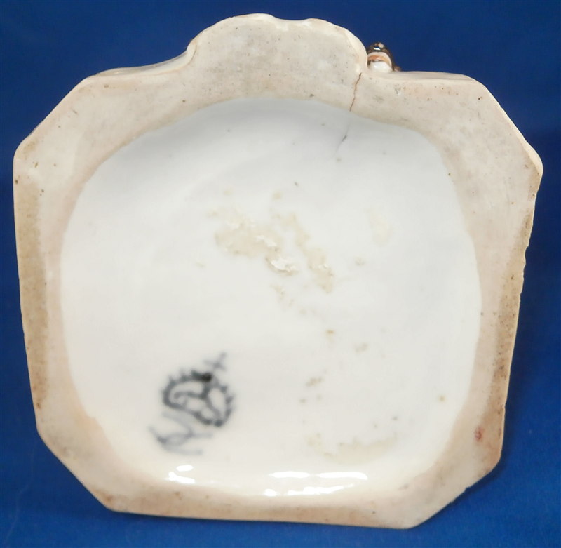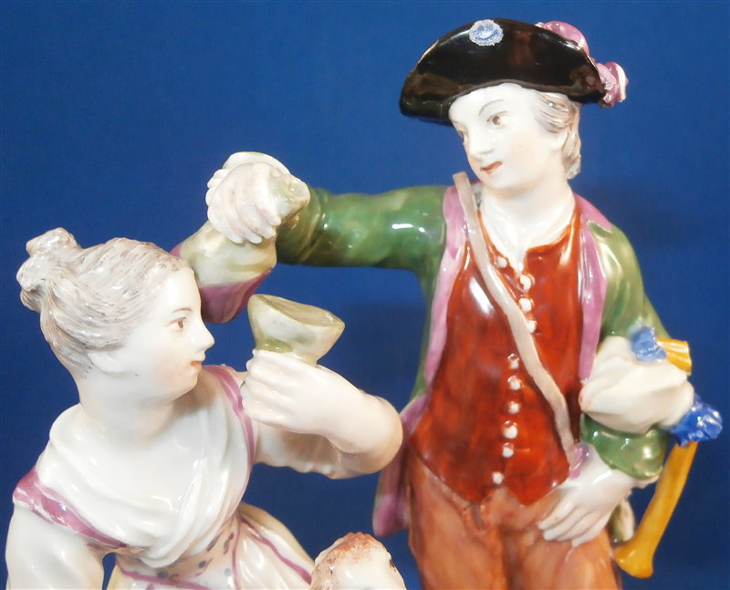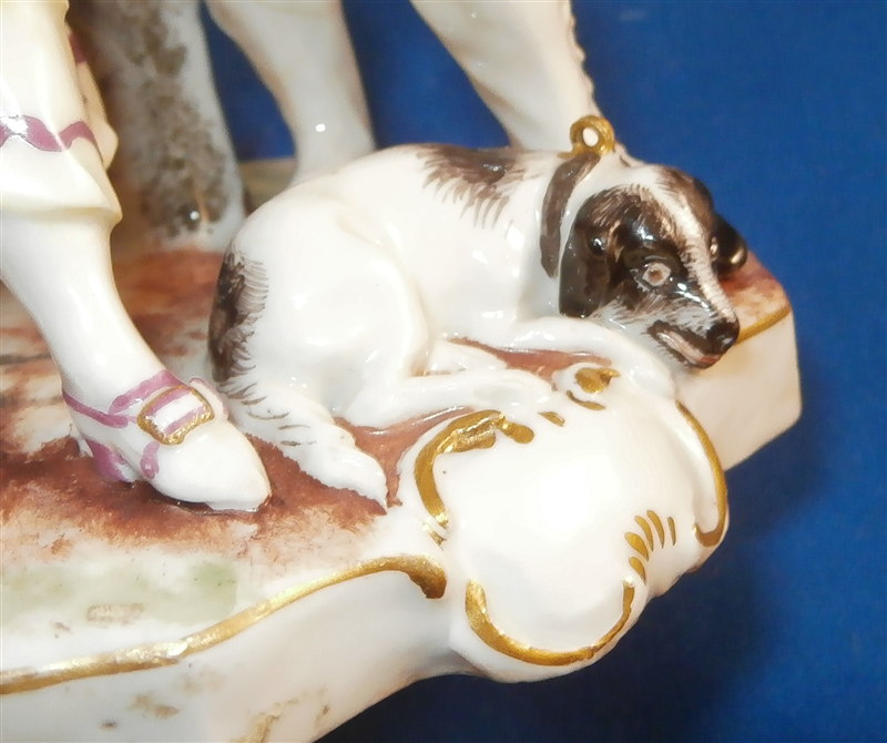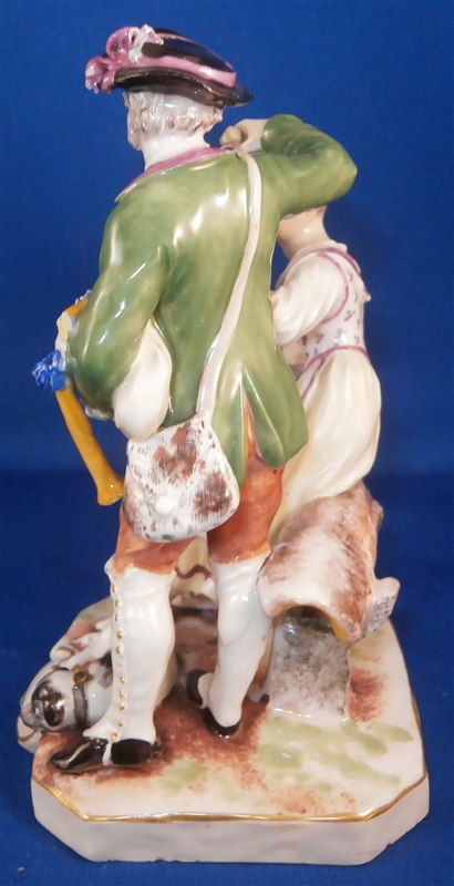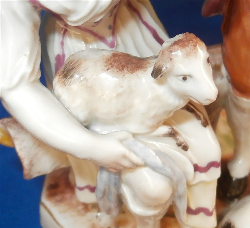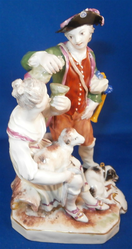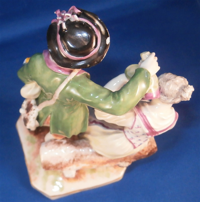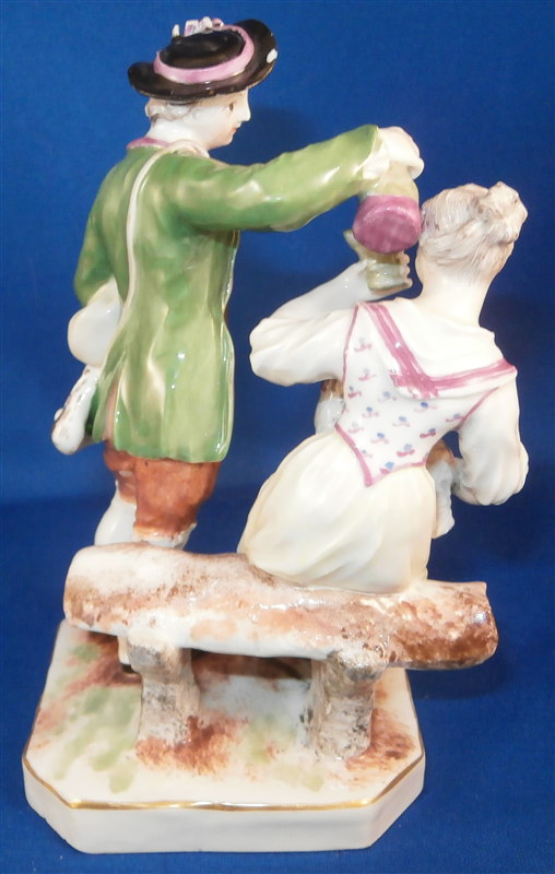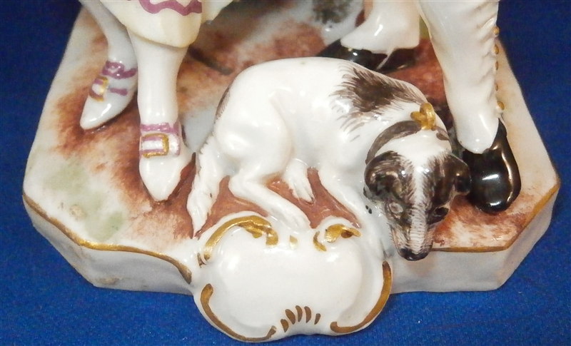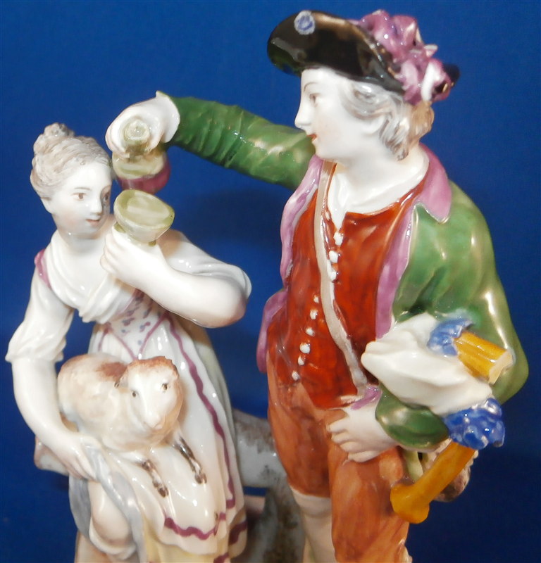 This is a figurine made by Ludwigsburg made between 1759 and 1770 and is marked with the crown over CC mark in underglaze blue as shown. The figure is of a shepherd and shepherdess with their sheep and dog. He is holding a bagpipe and pouring her a glass of wine. Must have been a rough life :) A superbly modeled and painted piece especially him! The figure is 4.75 inches tall, 3 inches wide and 2.875 inches deep. The figurine is in excellent condition with two minor chips to his hat, some damage to the puce bows on his hat, the bagpipe end has been chipped off and he has a manufacturing crack in his right leg. All in all about as good as they come! Please email me for more information or photos.