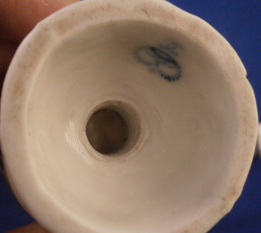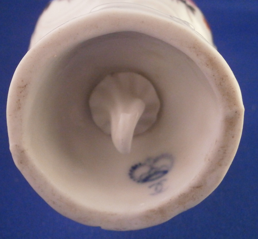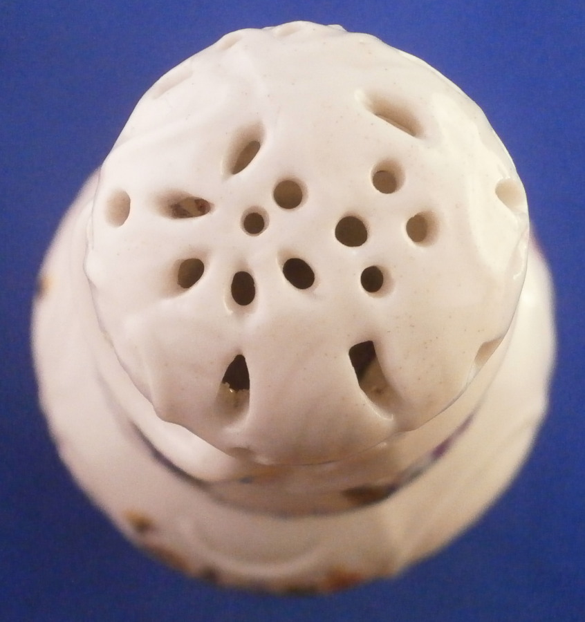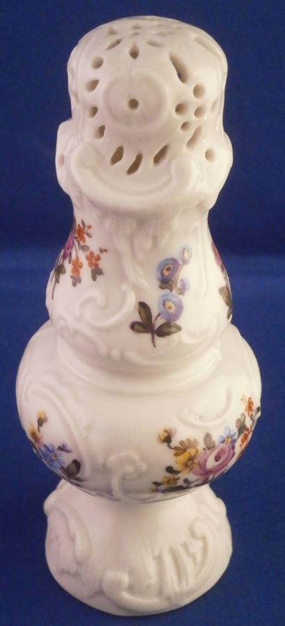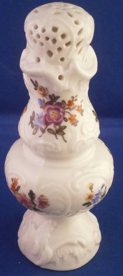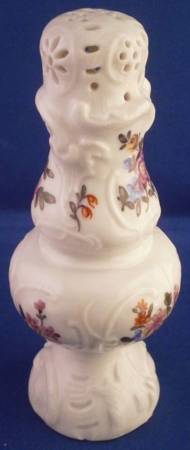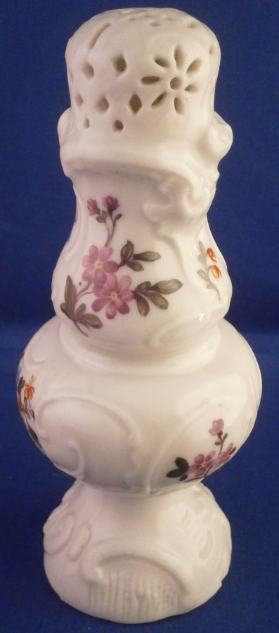 This is a very rare sugar shaker / caster / muffineer made by Ludwigsburg in the 18th century. It is nicely modeled with the openings in the top and lots of designs to the paste and hand painted with flowers all around. It even still has the original screw in stopper underneath. One almost never sees stuff like that! This piece does have a very decorative shape. It is in great condition with a chip to the bottom edge as shown. The piece is marked with the under glaze blue interlaced double C mark under a crown to the underside as shown. The sugar caster is 5.5 inches tall and 2.25 inches in diameter. Please email me for more information or photos.