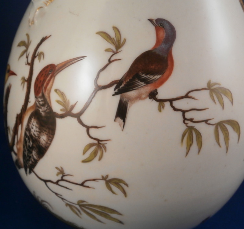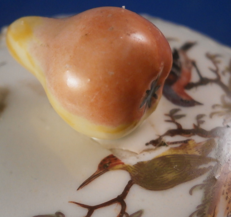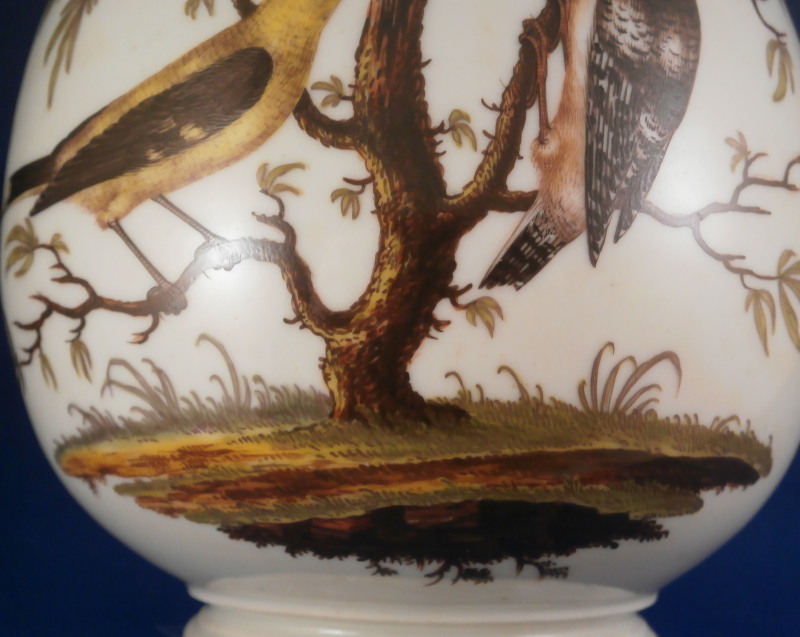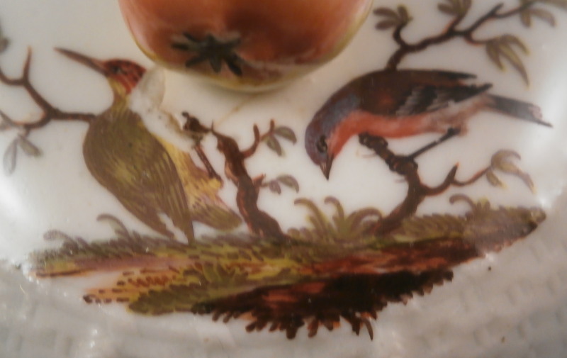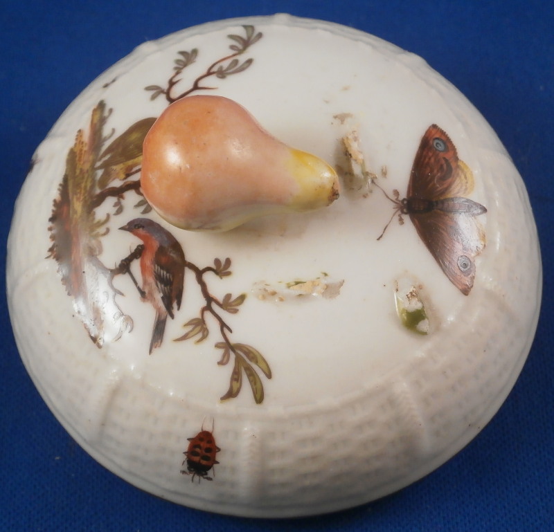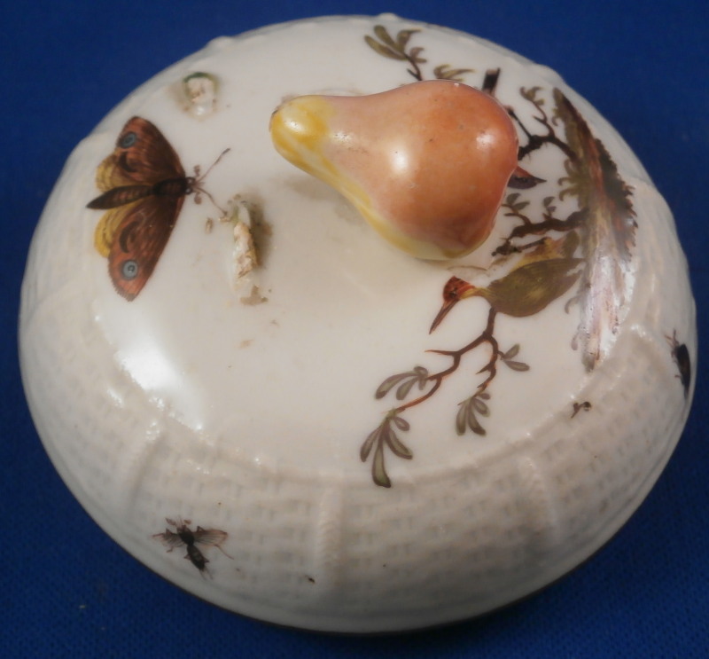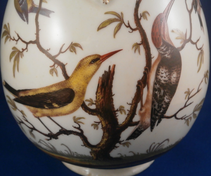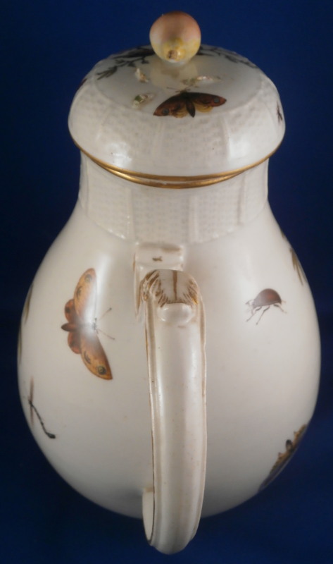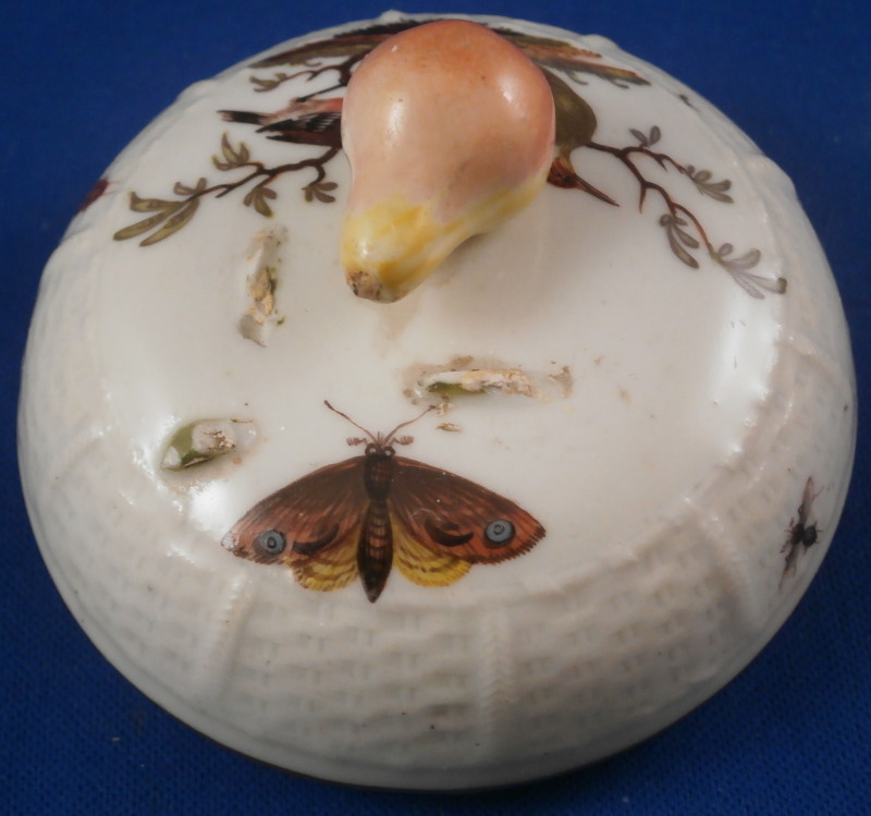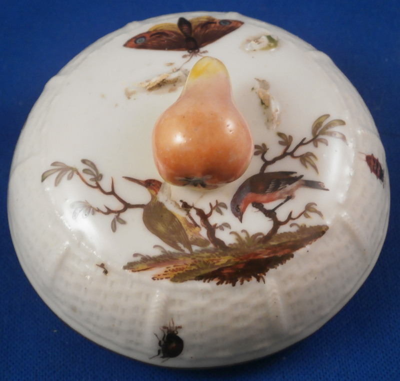 This is a superb lidded coffee pot made by Ludwigsburg around 1765. The pot is hand painted with a large top quality bird scene as well as quite a few large butterflies and other bugs as shown. Nice spout with some raised design to it and gold trim and a basket weave design to the top rim. Typical handle shape also with a bit of gold trim. The bird scene includes four great birds sitting on branches of a broken tree. There is a oriole, a woodpecker, a blue tit I believe and some sort of finch. The lid also has a small bird scene to it as well as a few bugs, same relief trim to the edge and a pear finial.The pot is marked with the CC mark under the crown in under glaze blue as well as impressed numbers 3 and 19 as shown. The pot with the lid in place is 8.25 inches tall and has a diameter of 5 inches. The pot is in great condition with a tight crack across the bottom handle terminal as shown. The lid has had the finial off and and reglued back on with a little damage to the woodpecker in the scene and is missing the leaves and stem. Displays very well or can easily be repaired perfectly if need be. Please email me for more information or photos.