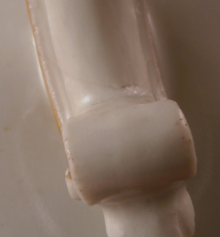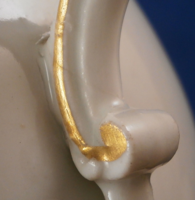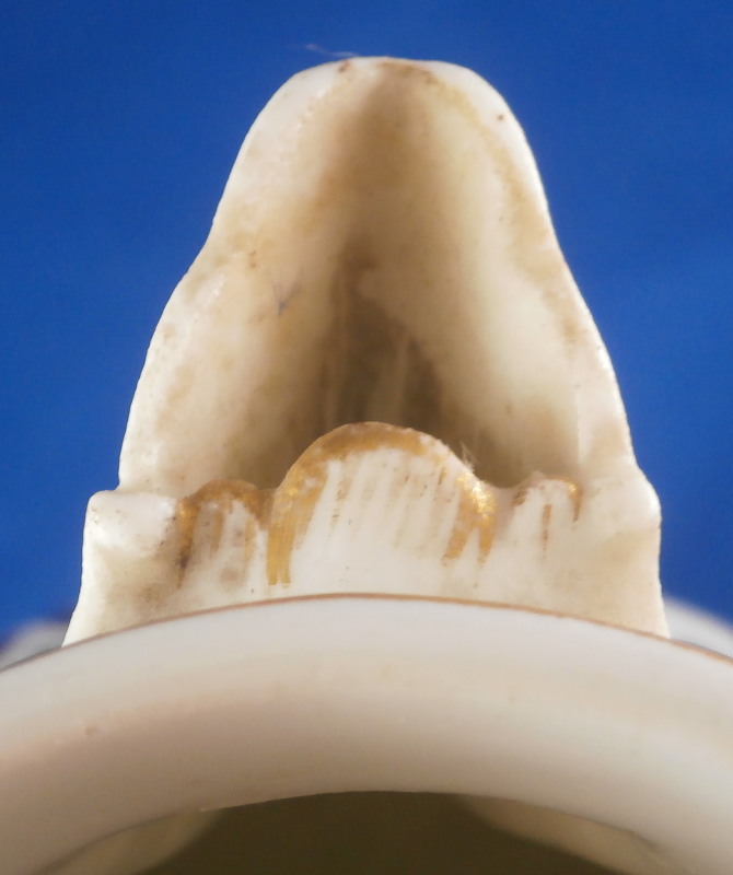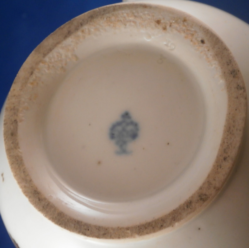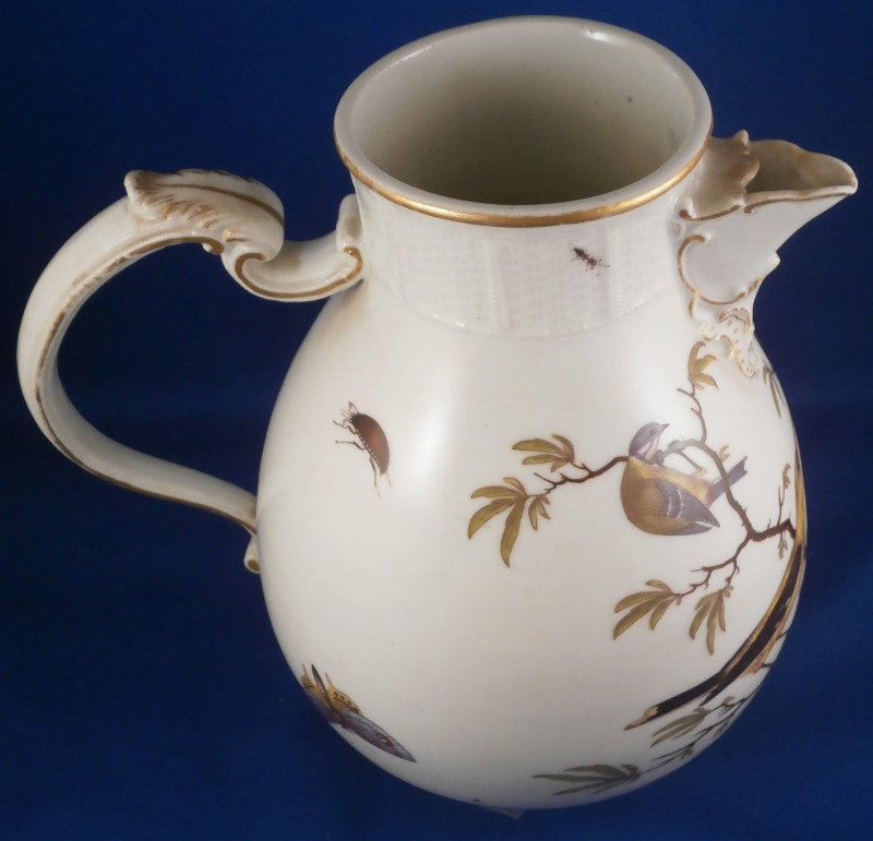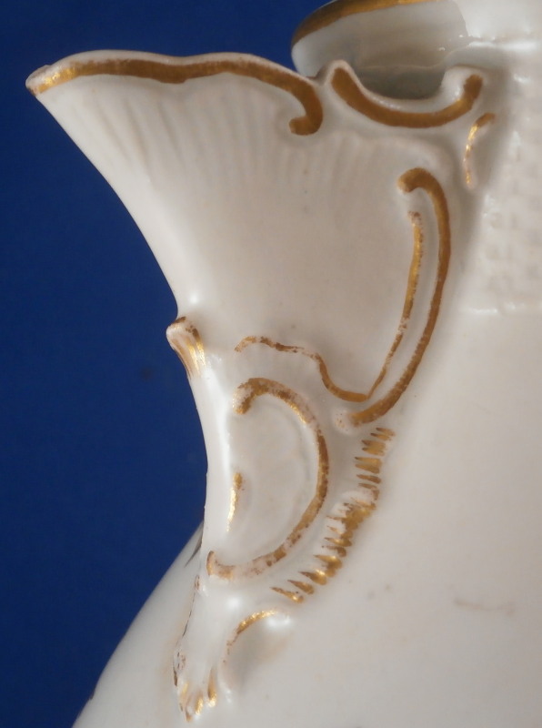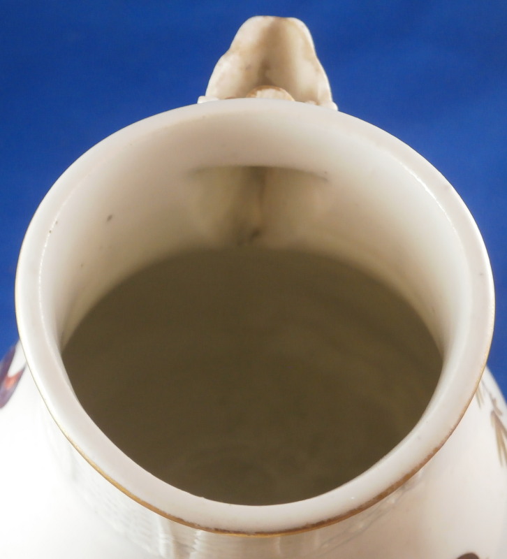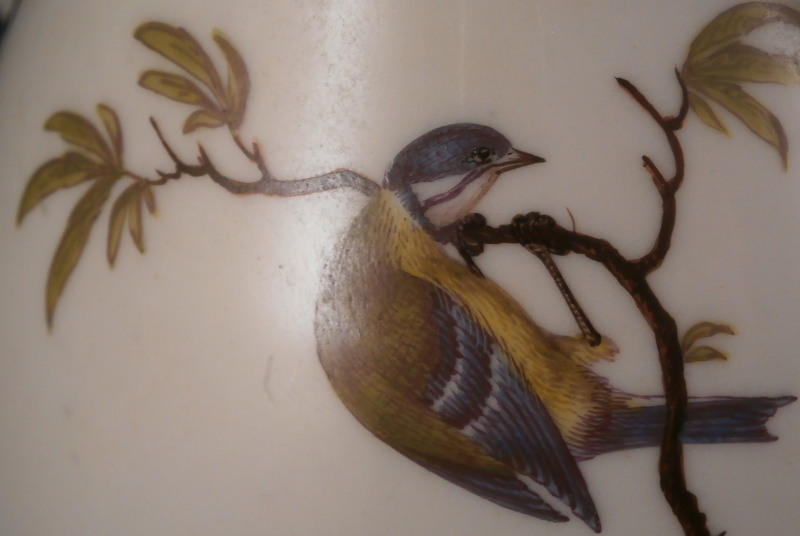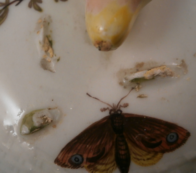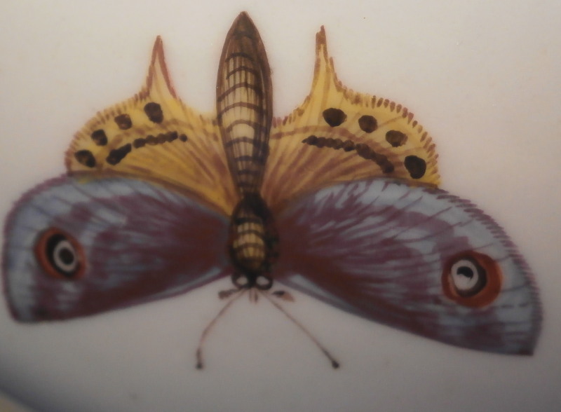 This is a superb lidded coffee pot made by Ludwigsburg around 1765. The pot is hand painted with a large top quality bird scene as well as quite a few large butterflies and other bugs as shown. Nice spout with some raised design to it and gold trim and a basket weave design to the top rim. Typical handle shape also with a bit of gold trim. The bird scene includes four great birds sitting on branches of a broken tree. There is a oriole, a woodpecker, a blue tit I believe and some sort of finch. The lid also has a small bird scene to it as well as a few bugs, same relief trim to the edge and a pear finial.The pot is marked with the CC mark under the crown in under glaze blue as well as impressed numbers 3 and 19 as shown. The pot with the lid in place is 8.25 inches tall and has a diameter of 5 inches. The pot is in great condition with a tight crack across the bottom handle terminal as shown. The lid has had the finial off and and reglued back on with a little damage to the woodpecker in the scene and is missing the leaves and stem. Displays very well or can easily be repaired perfectly if need be. Please email me for more information or photos.