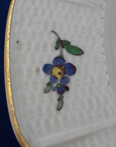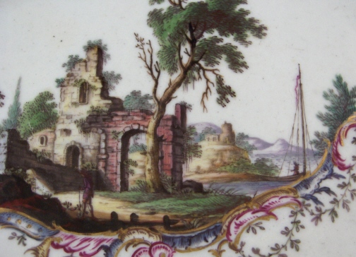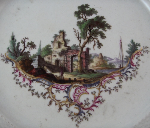 This is a great plate made by Ludwigsburg between 1759 and 1770. It is handpainted with a superb scene in the center of a landscape with a ruin and house in it and a hiker plus a person in a boat and it has some nice trim under the scene in puce, blue and gold. The rim has a basketweave design to it called the Osier relief with some handpainted flowers on it and a nice gold edge. The glaze on these early pieces is so thick that is covers the basketweave design completely unlike most other makers. These scenic pieces are just superb and are among my favorite pieces. The plate is marked with the CC mark under the crown in underglaze blue and an impressed 2 on the footring. It is 1.25 inches tall and 9.5 inches in diameter. It is in great condition with just some very minor wear. Please email me for more information or photos.