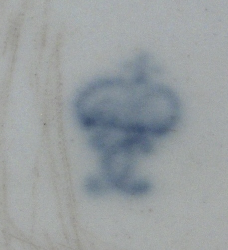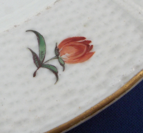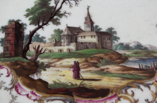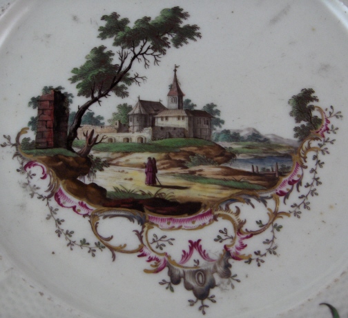 This is a great plate made by Ludwigsburg between 1759 and 1770. It is handpainted with a superb scene in the center of a landscape with a large bulding in it that might be a monastery, a body of water with a dock on it to the right and a monk (he is holding a cross) walking along. There is a nice design under the scene in puce, blue and gold. The rim has a basketweave design to it called the Osier relief with some handpainted flowers on it and a nice gold edge. The glaze on these early pieces is so thick that is covers the basketweave design completely unlike most other makers. These scenic pieces are just superb and are among my favorite pieces. The plate is marked with the CC mark under the crown in underglaze blue and an impressed 2 on the footring. It is 1.125 inches tall and 9.75 inches in diameter. It is in great condition with just some very minor wear. Please email me for more information or photos.