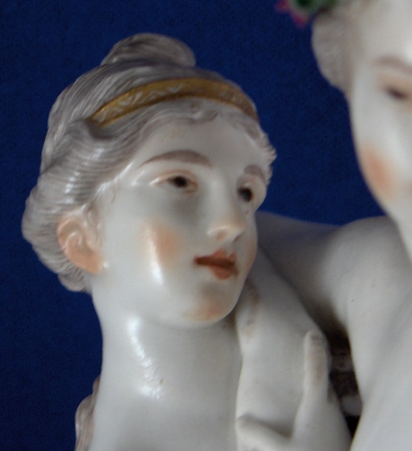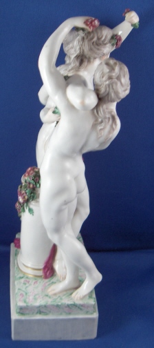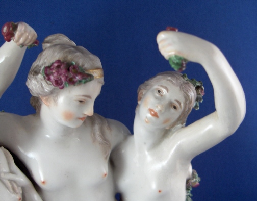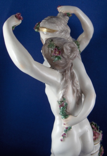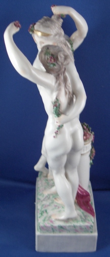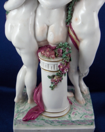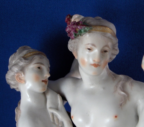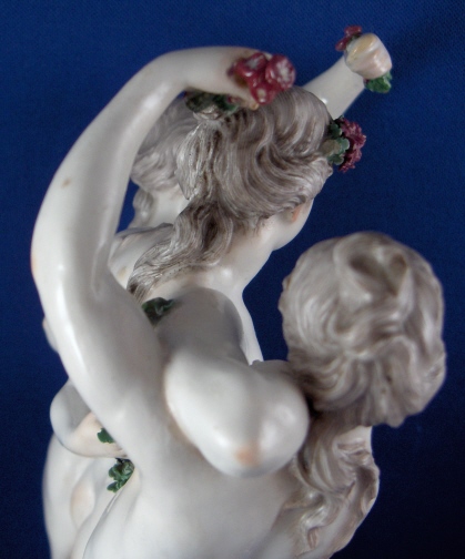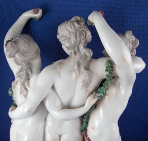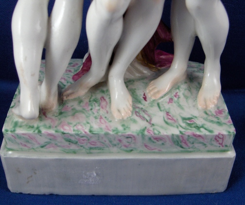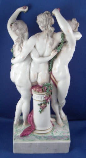This is a great figurine of the three graces made by Ludwigsburg around 1765. Known in Greek mythology as the Charities they were goddesses of such things as charm, beauty, and creativity. In Roman mythology they were known as the Gratiae. The figurine is unmarked which is not uncommon but was certainly made by them and is in the books as well. It is 9 inches tall, 4 inches wide and 2.5 inches deep. They are in great condition with the two arms/hands that are in the air having been worked on. The flowers they are holding in those hands have been worked on as well. hard to tell what exactly was wrong since the restoration in very good. The small flower garlands that are on their side/back used to go through these hands I believe so the connecting pieces are gone. The figurine displays superbly and is very elegant. The colorful base only adds to the piece! Please email me for more information or photos.
