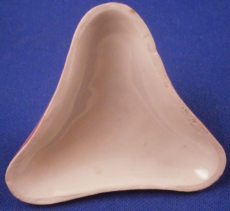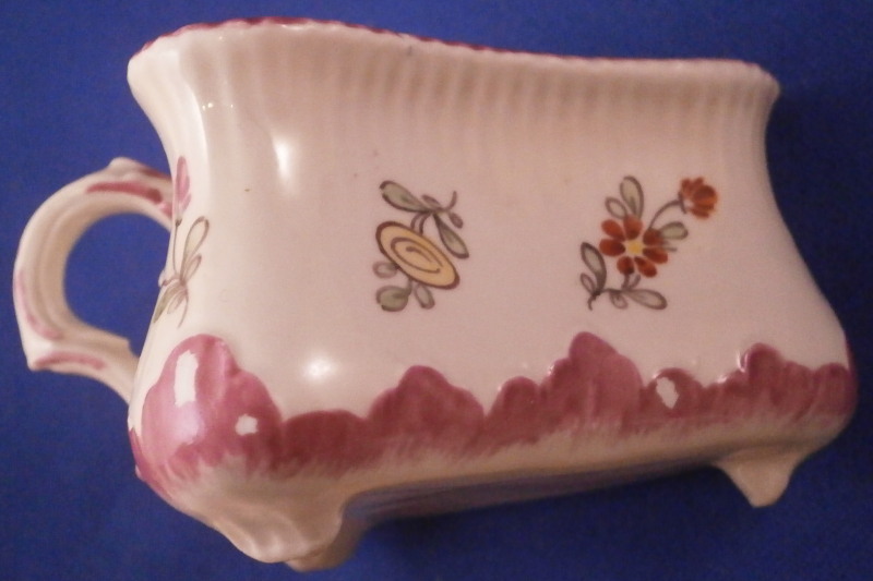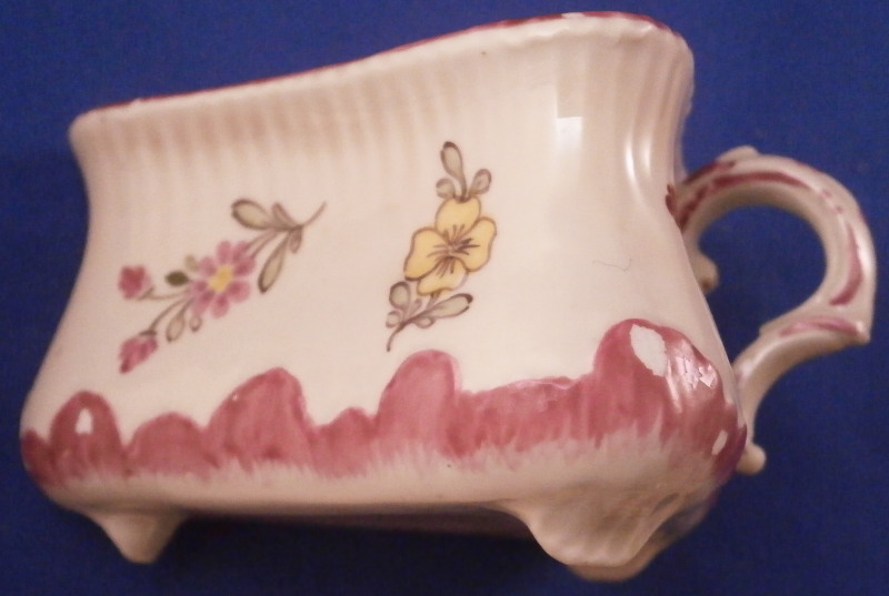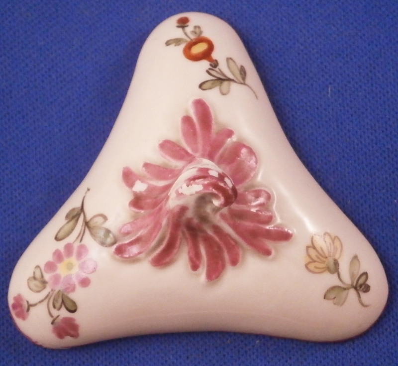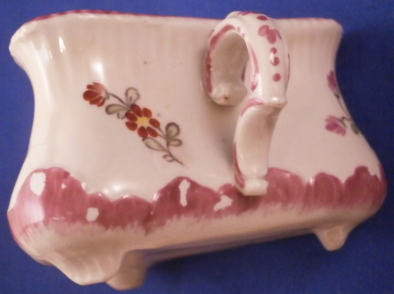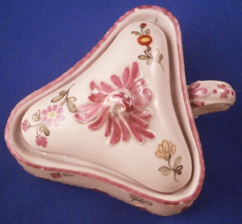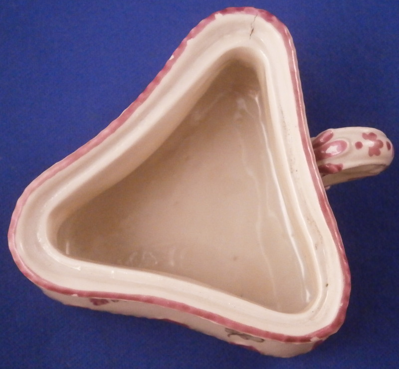 This is a pot de creme or au jus made by Ludwigsburg in the mid 18th century. A nice early lidded cup that is triangular in shape which one does not see very often especially with three feet to sit on. I have only found this shape by Ludwigsburg and Loosdrecht but due to the paste and painting I am sure it was made by Ludwigsburg. The piece is just plain fun with some designs to the paste, small single flowers painted all around as well as on the lid, a nice finial shape as well as handle shape and some nice puce trim. A very unusual piece. The piece is unmarked which is not very common for this maker but I have seen it before so it does happen. The cup is 2.5 inches tall including the finial, about 3 inches long and 2.75 inches wide. The set is in great condition with a small firing crack to the top inside edge and some spots of the puce paint having flaked as seen in the pictures. All in all in superb condition for being a good 250 years old and a really neat piece to look at plus not something you will see again anytime soon. Please email me for more information or photos.