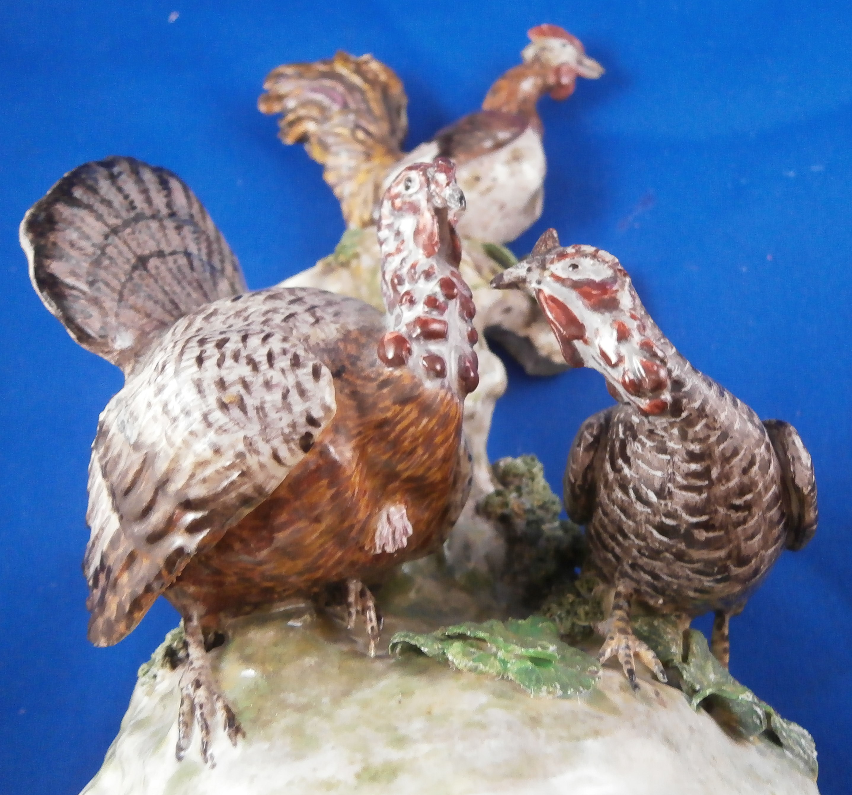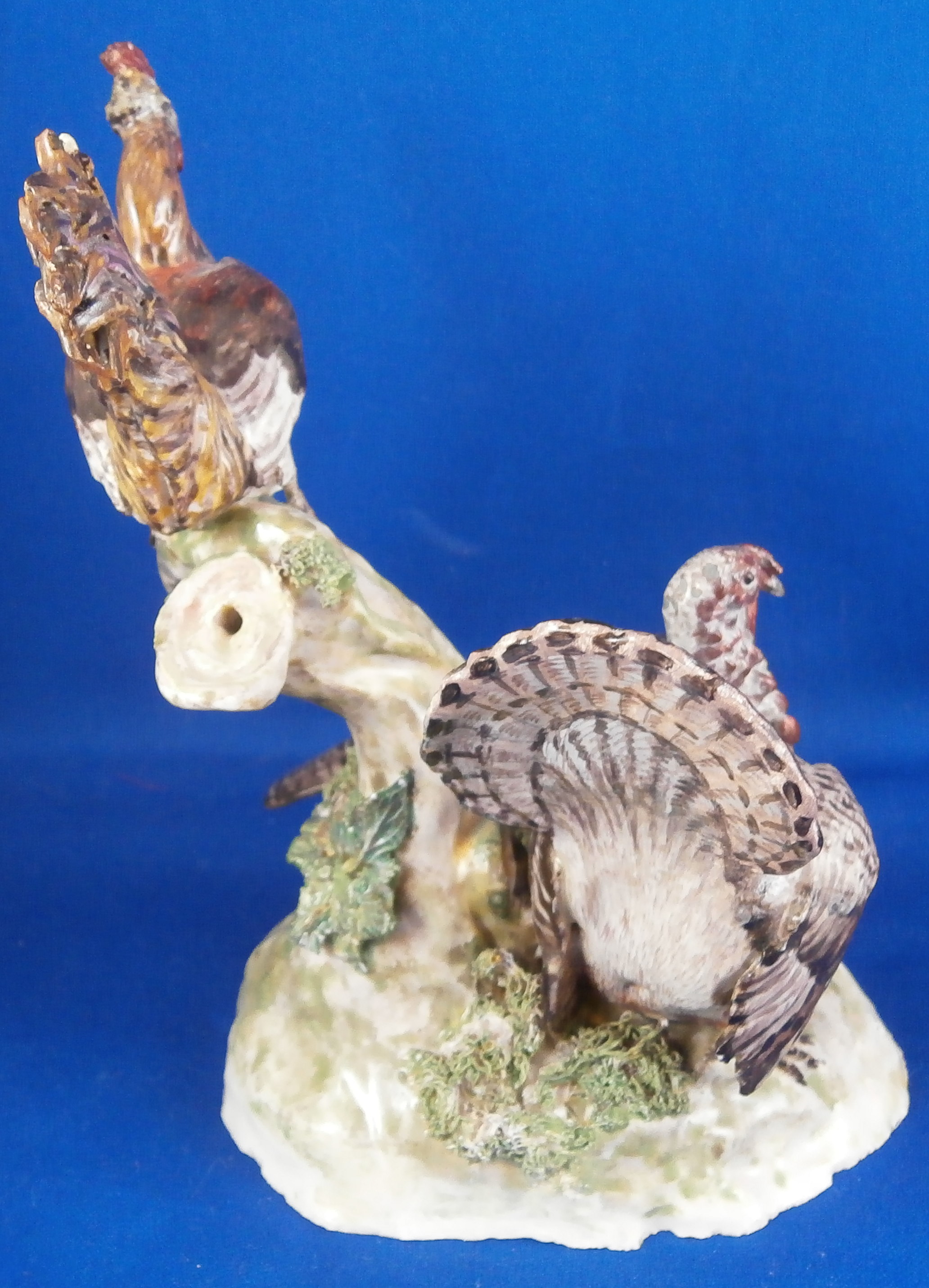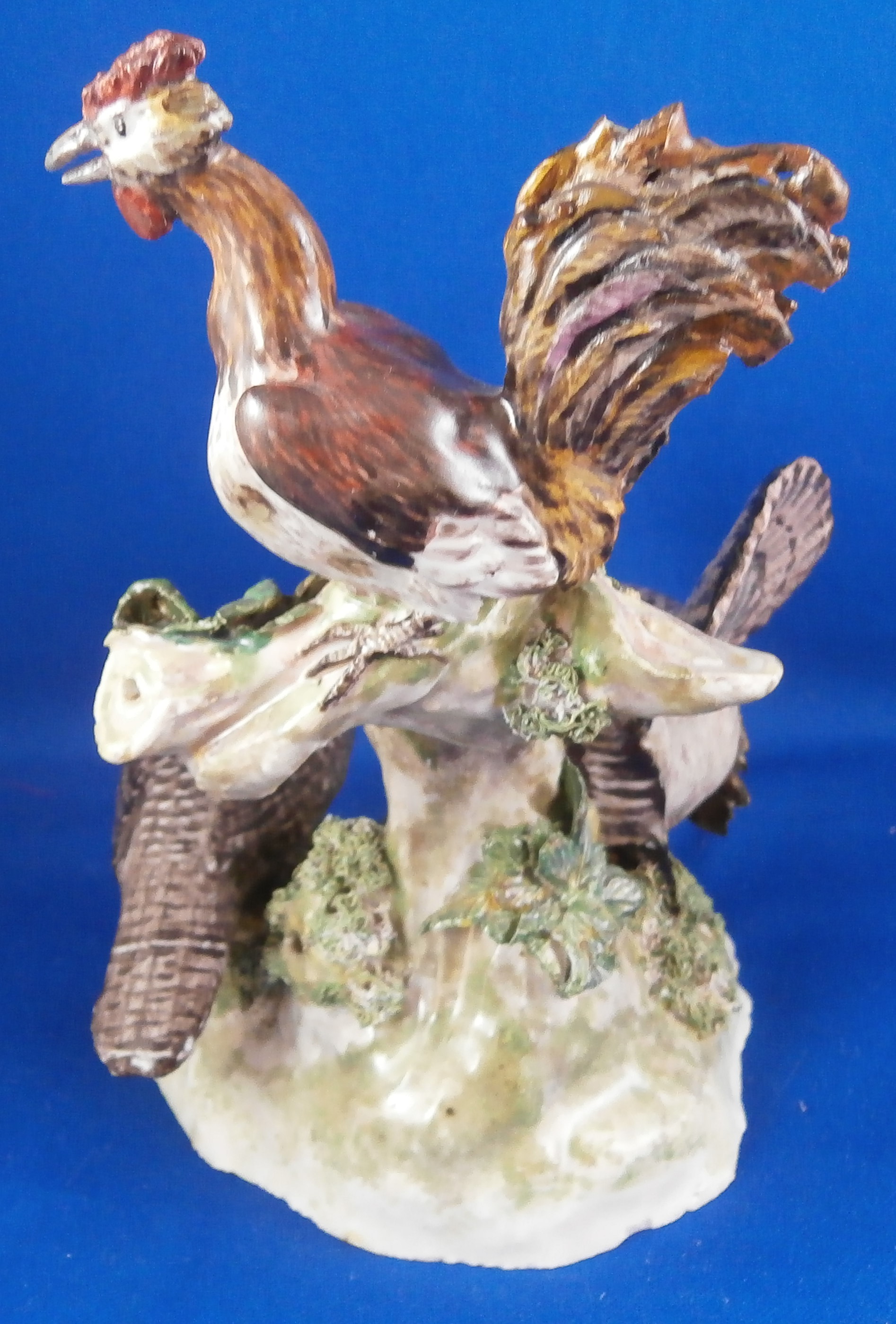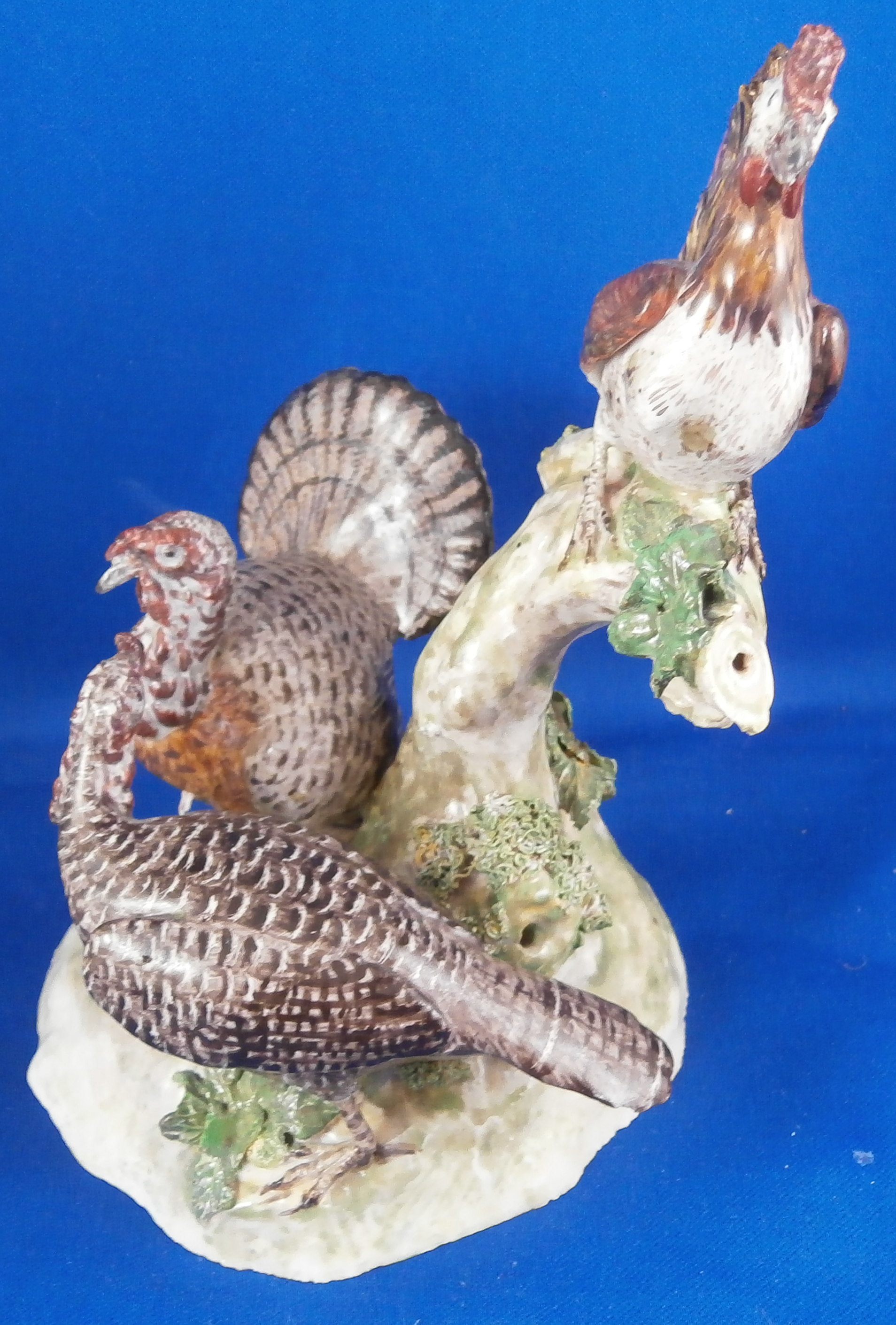 This is a figurine made by Ludwigsburg in about 1770 after a model by Jean Jacques Louis. The peice has a turkey couple on a nice base with a rooster sitting on a tree stump above them. A rather hard to find model that is just plain fun and fits into my table design for turkey day :) The figure is marked with the crown over CC mark in underglaze blue as well as an incised N2. A superbly modeled and painted piece! The figure is 5.75 inches tall, 4 inches wide and 4 inches deep. Displays very nicely but there have been some restorations - the tail of the Tom was restored, the bottom of the back tail of the turkey hen, the rooster's tail ahs been worked on as has been one of his feet and the beak. Some leaves have had work done to them as has the beak of the turkey male. Very well done so it's not taking away from the piece! Comes from the collection of Dr. Flach which is a nice bonus. Please email me for more information or photos.