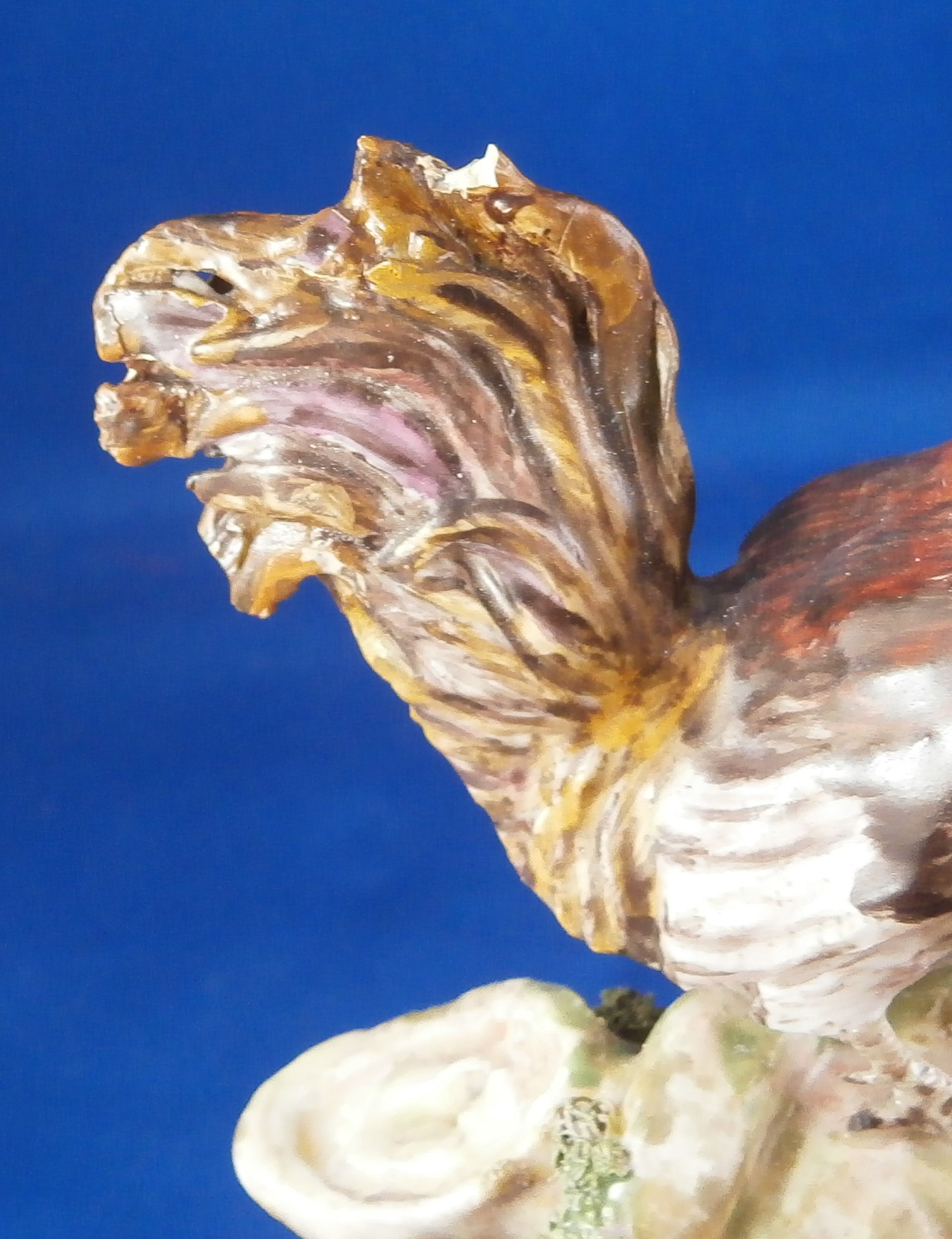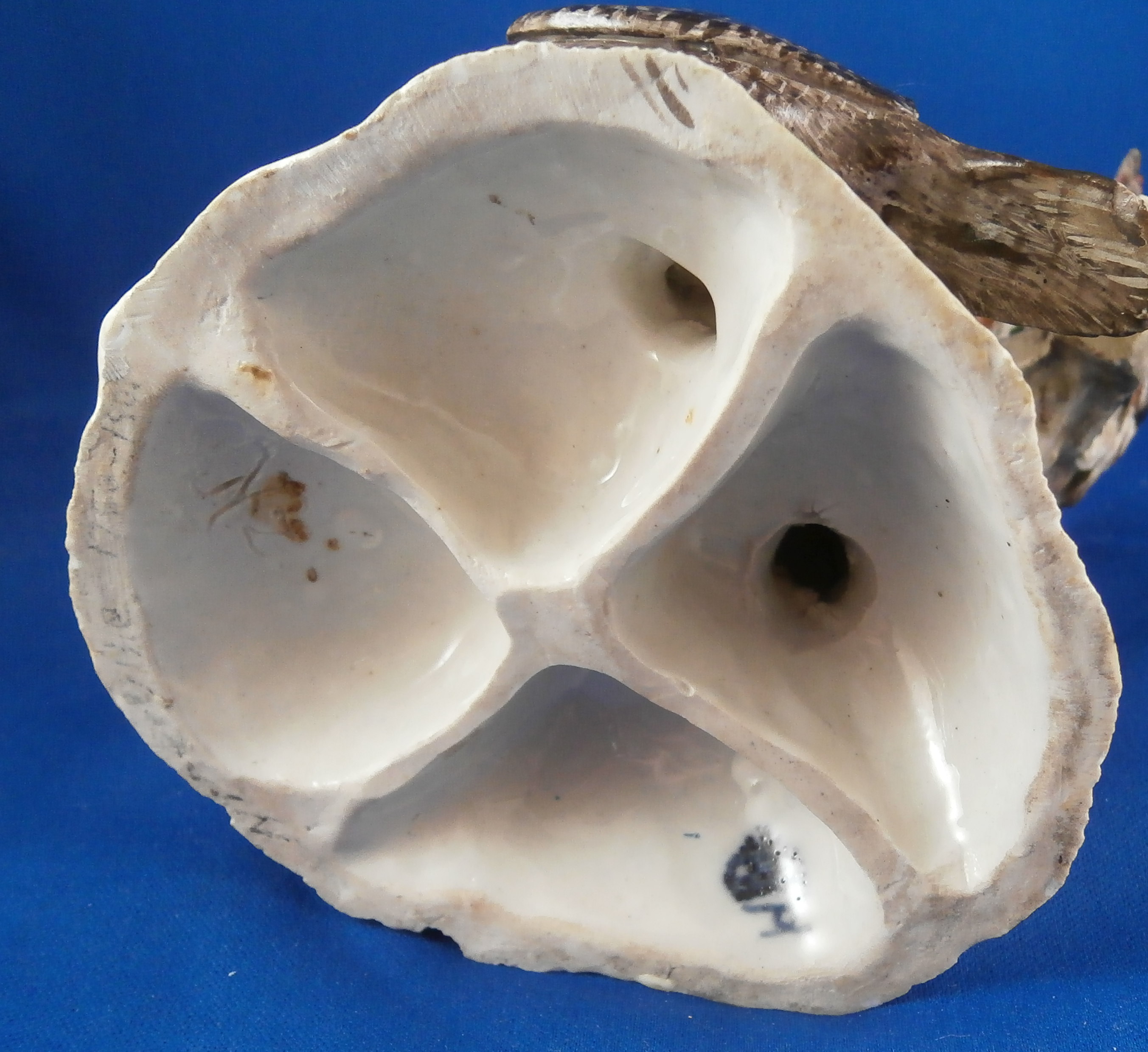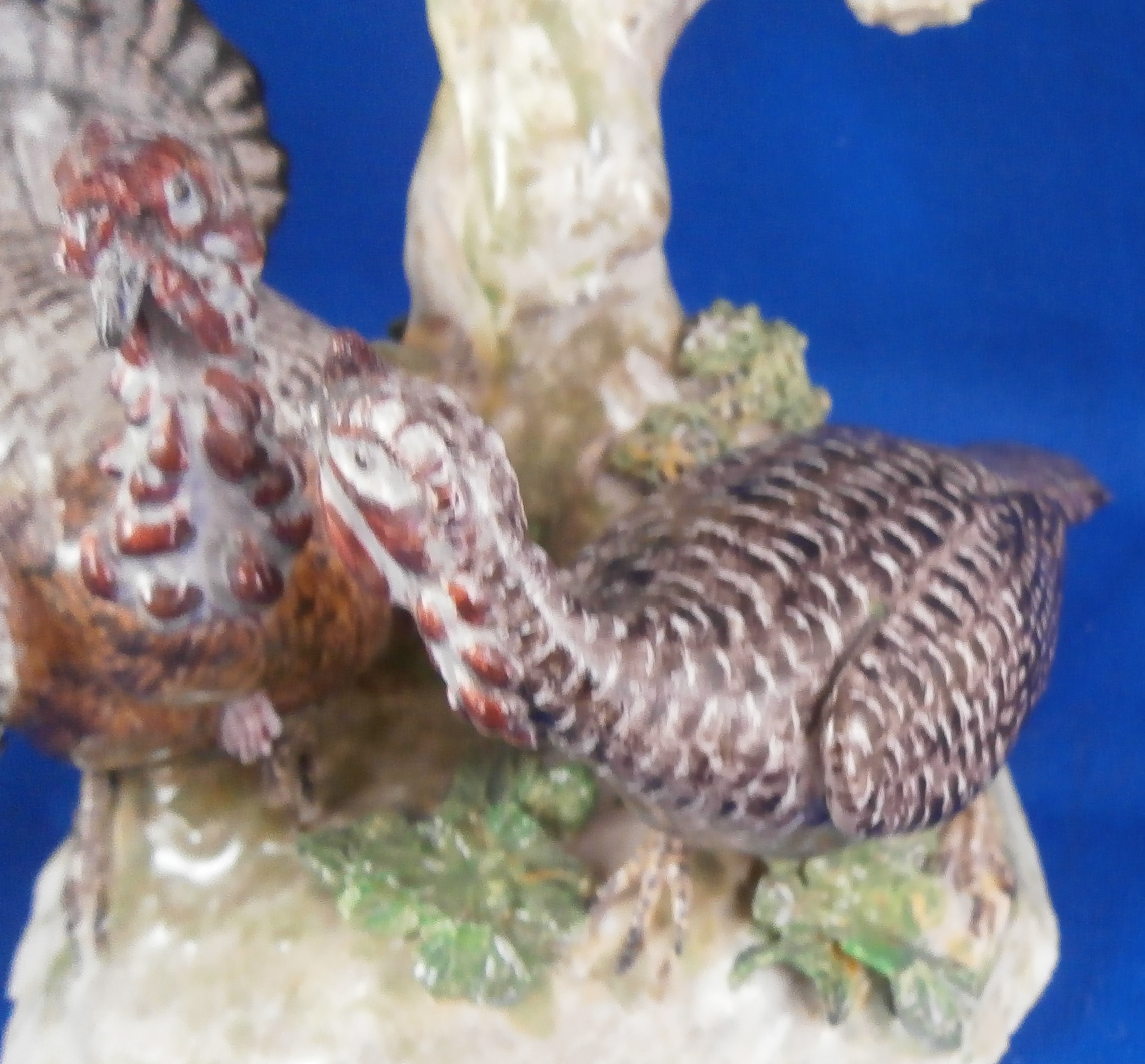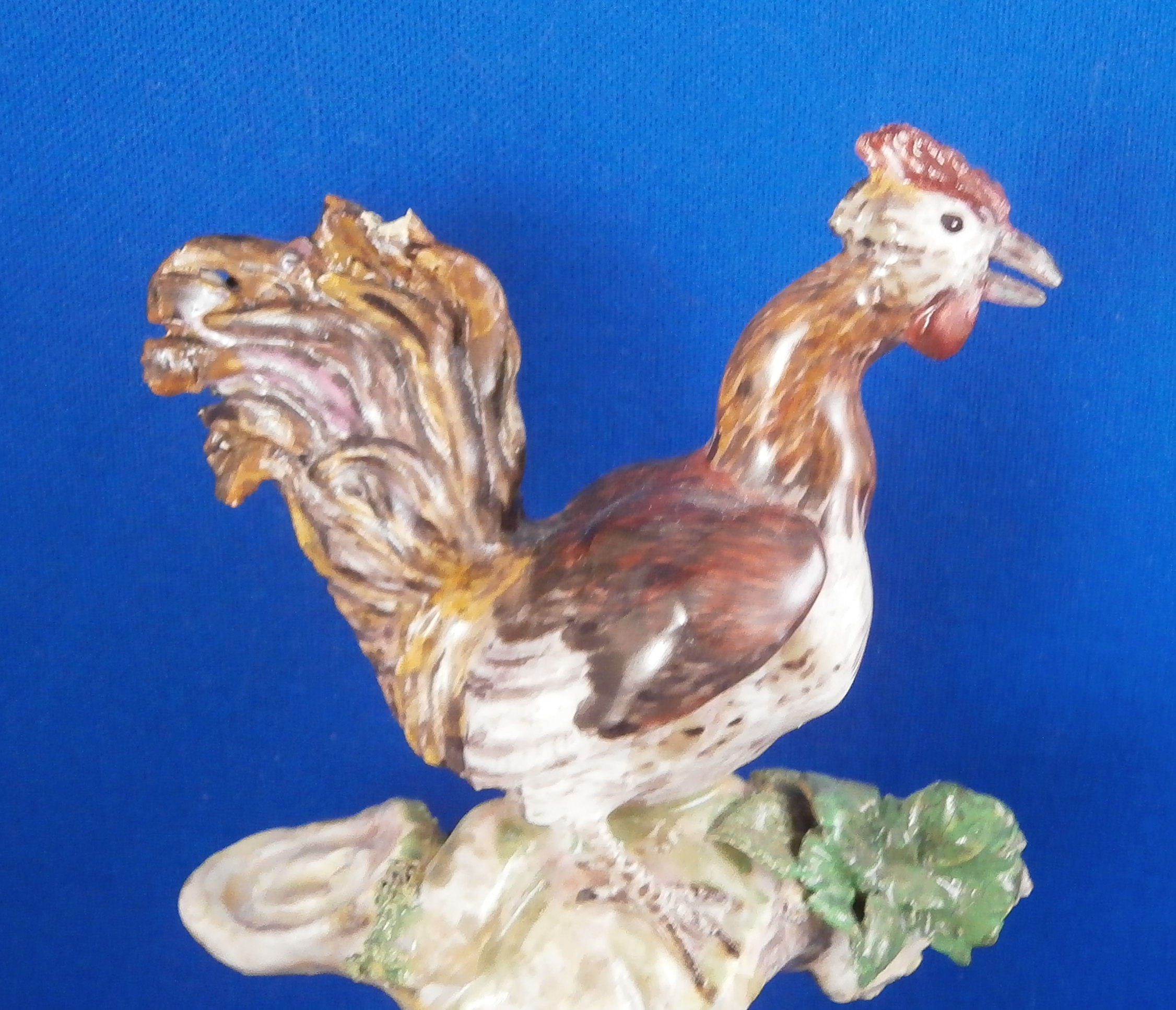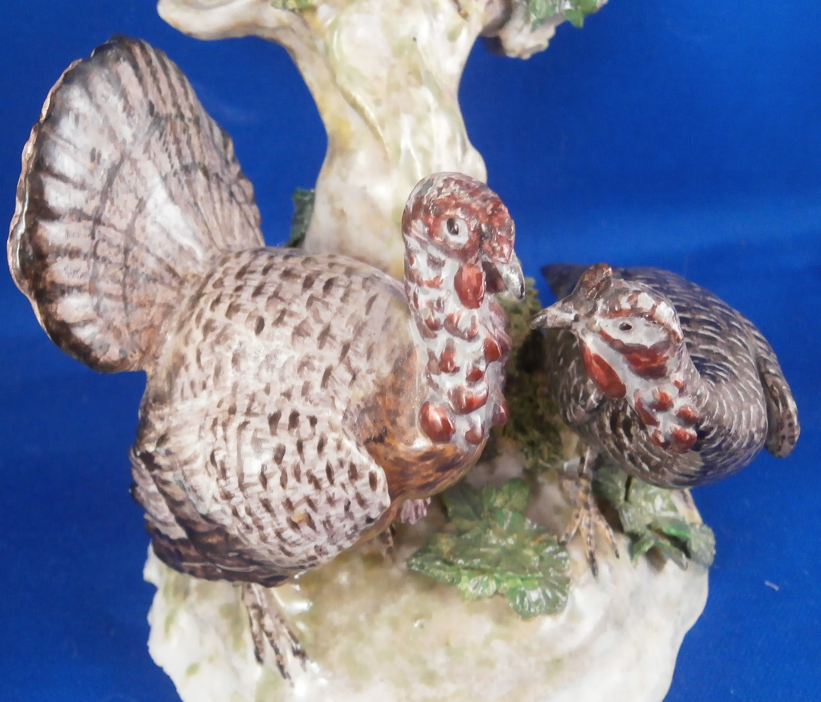 This is a figurine made by Ludwigsburg in about 1770 after a model by Jean Jacques Louis. The peice has a turkey couple on a nice base with a rooster sitting on a tree stump above them. A rather hard to find model that is just plain fun and fits into my table design for turkey day :) The figure is marked with the crown over CC mark in underglaze blue as well as an incised N2. A superbly modeled and painted piece! The figure is 5.75 inches tall, 4 inches wide and 4 inches deep. Displays very nicely but there have been some restorations - the tail of the Tom was restored, the bottom of the back tail of the turkey hen, the rooster's tail ahs been worked on as has been one of his feet and the beak. Some leaves have had work done to them as has the beak of the turkey male. Very well done so it's not taking away from the piece! Comes from the collection of Dr. Flach which is a nice bonus. Please email me for more information or photos.