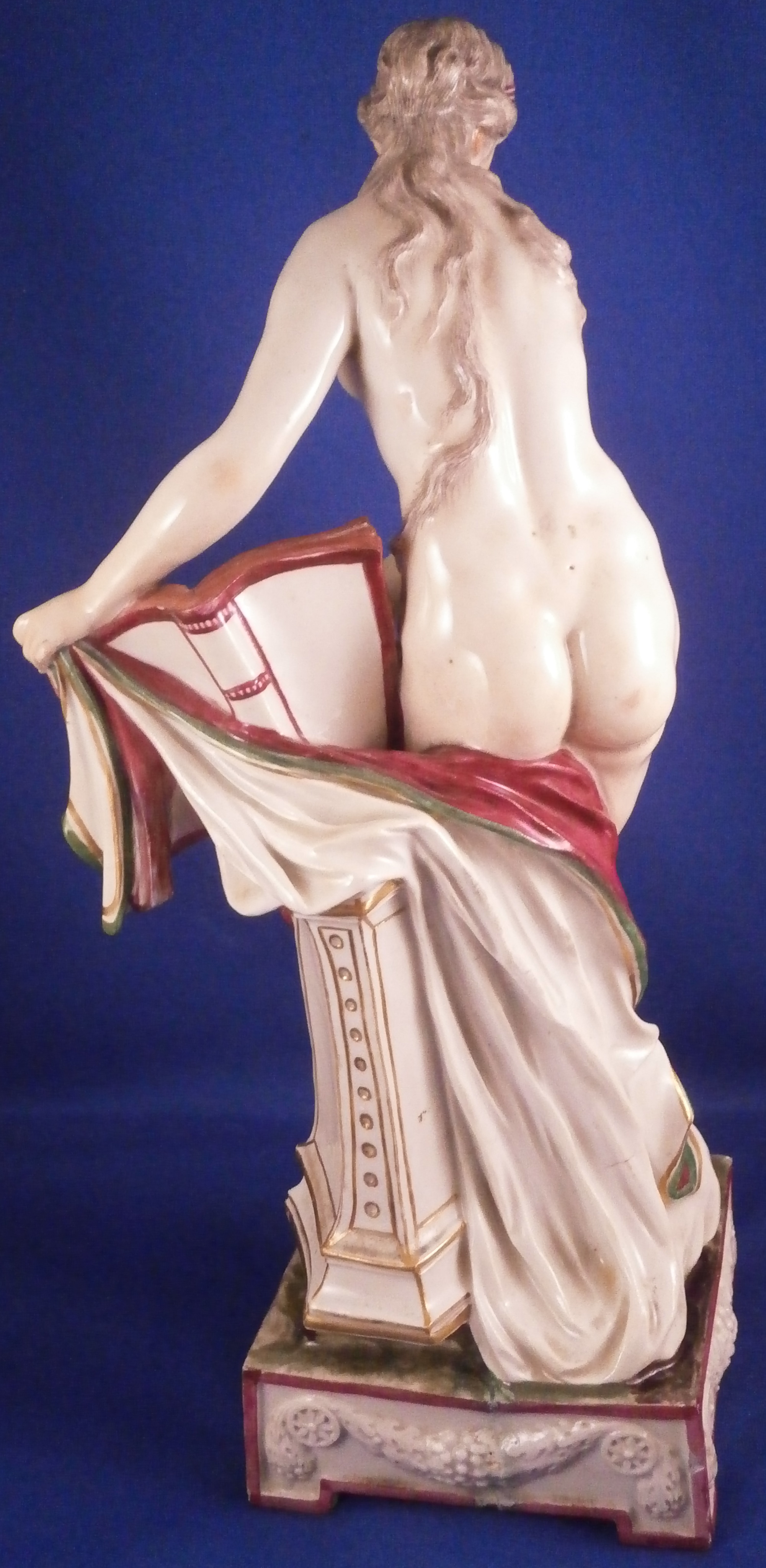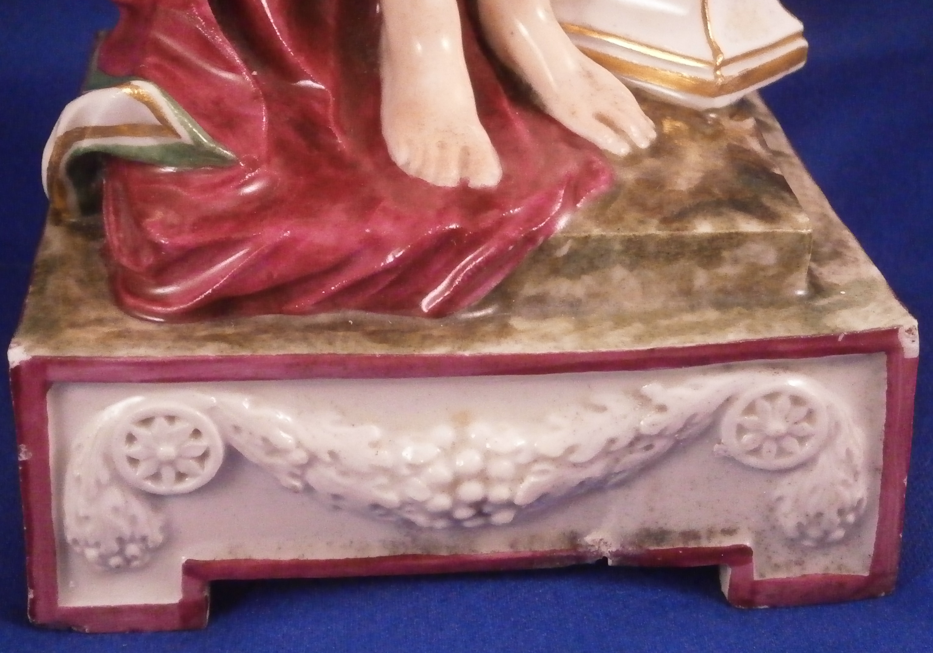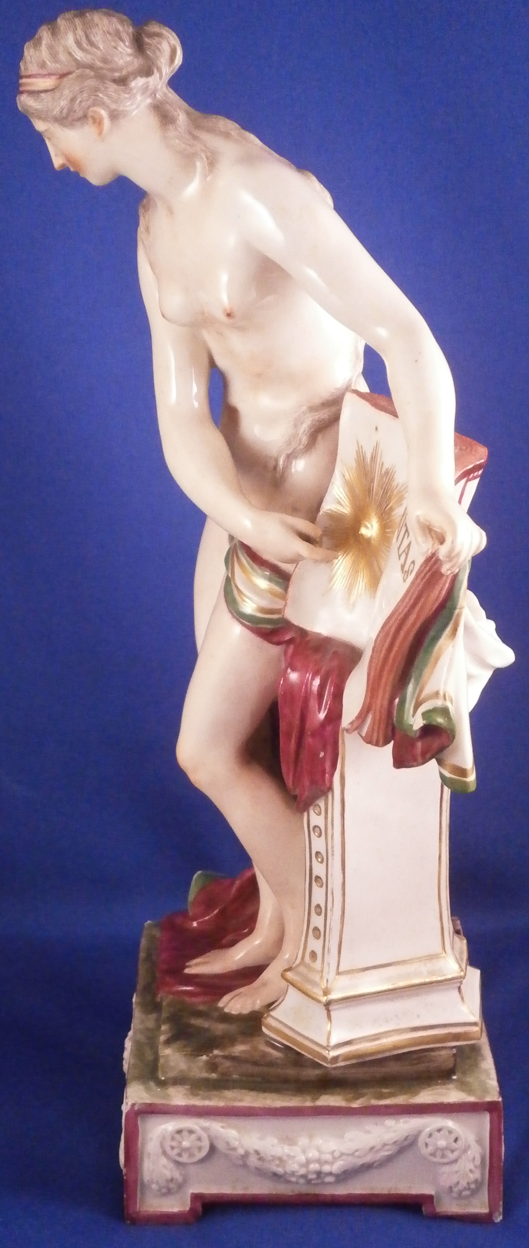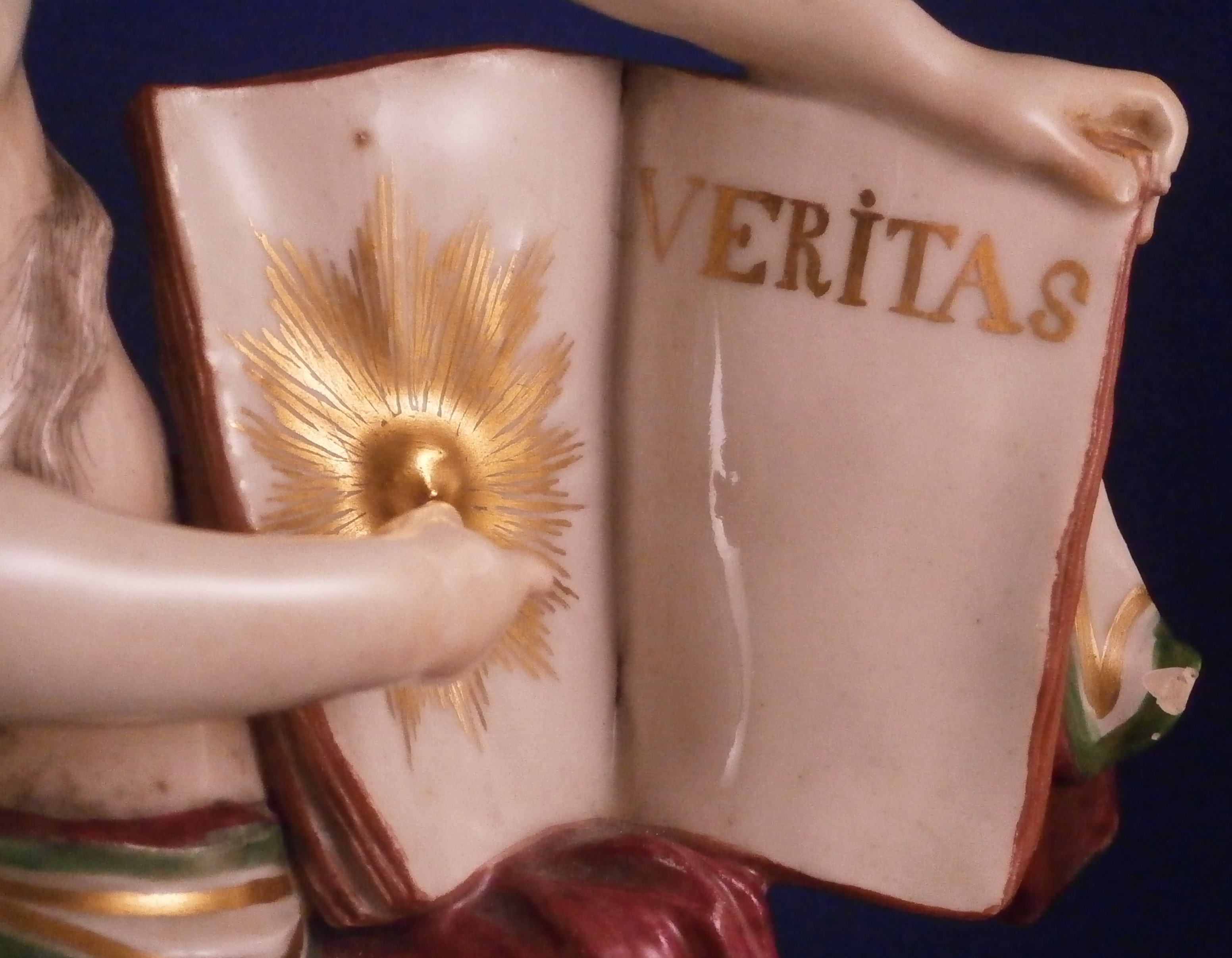 This is a nice large figurine made by Ludwigsburg in the 18th century. It is of a lady standing on a nice base holding an open book in her hands with a large sun symbol on the one side and the word VERITAS written on the other. The mostly nude lady is modled very much in the normal manner for this maker and just covered a bit in her mid section with a puce, green and gold cloth that drapes from her left hand behind the back behind her down to the base. There is a nice pedestal below the book with some gold highlights and the base has a puce trim to the edges and a molded raised detail to each side. The figure is of a ncie size being 10.375 inches tall, 5.5 inches wide and 4 inches deep. The piece is in great condition with some minor damage - a small chip to the edge of the cloth to the right of the book, another tiny one to the front right top corner of the base as well as a couple of tiny munchers to the base edges. A minor well done repair to the fingers on top of the book as well as the the tip of the cloth showing on the right side of the book. Some minor firing flaws and a large firing crack to the middle of the base which was repaired at the factory. This happened because the center supports are lowers than the corners of the base - someone didn't pay attention. Some black firing specs mainly to her mid section and by her neck common to these larger pieces. The figurine is marked with their under glaze blue interlaced double C mark as shown underneath on the underside of the base. A nice figure in a nice size! Please email me for more information or photos.