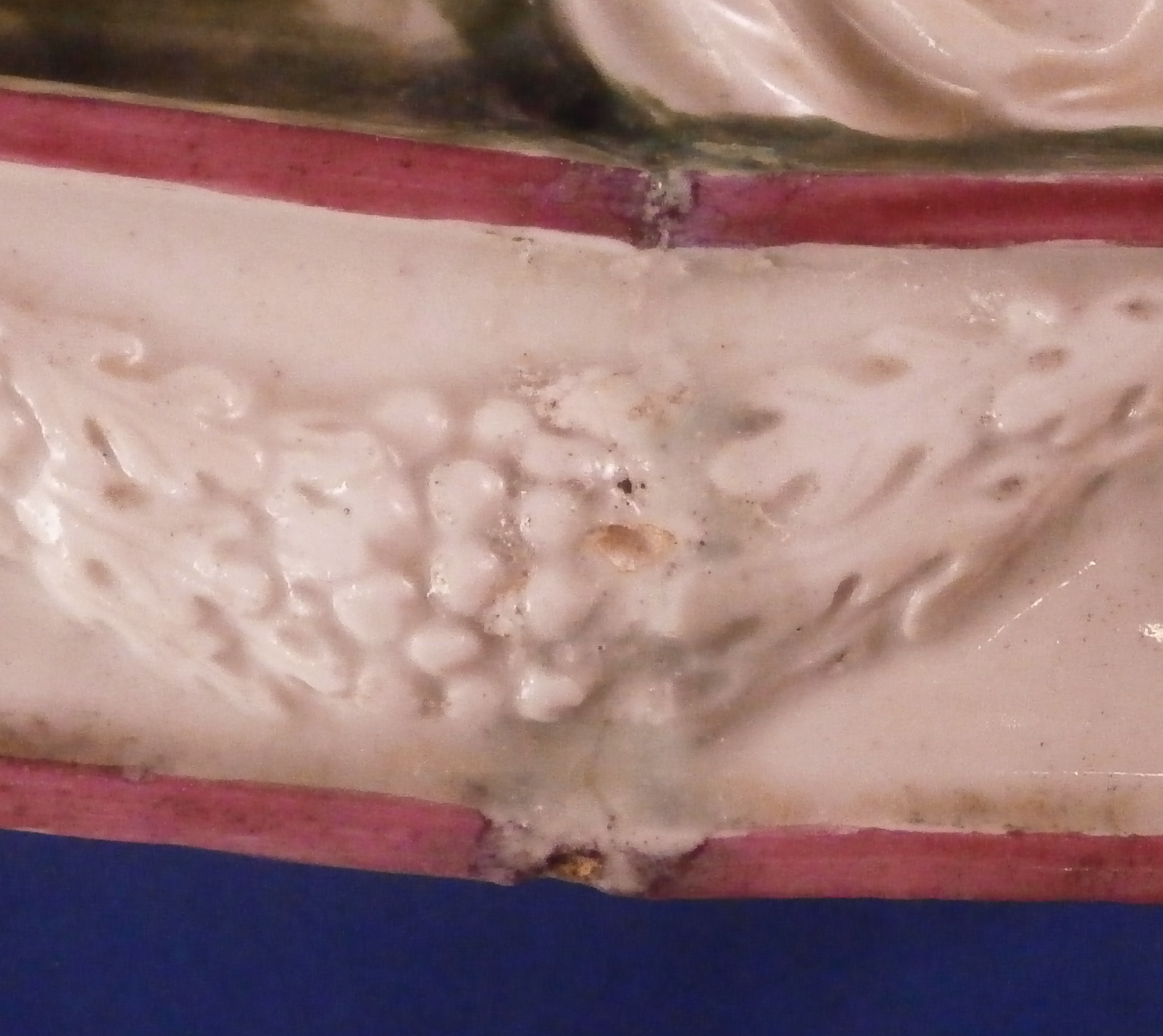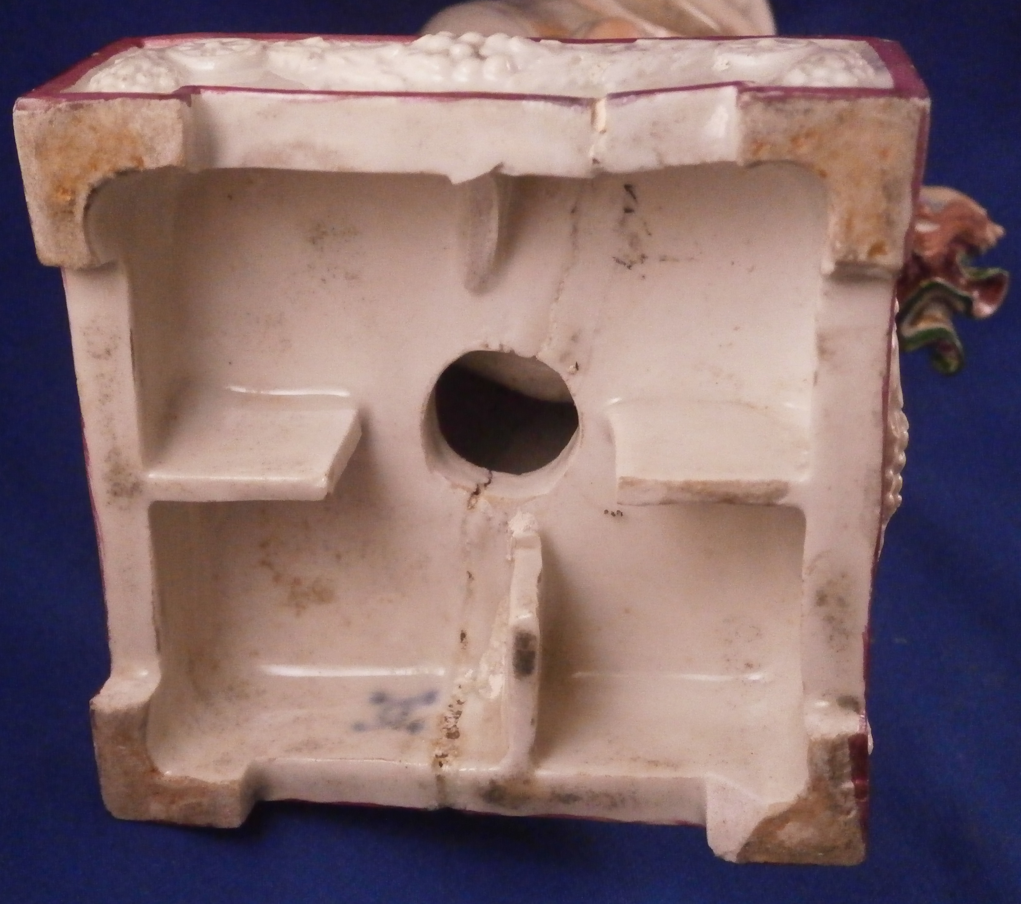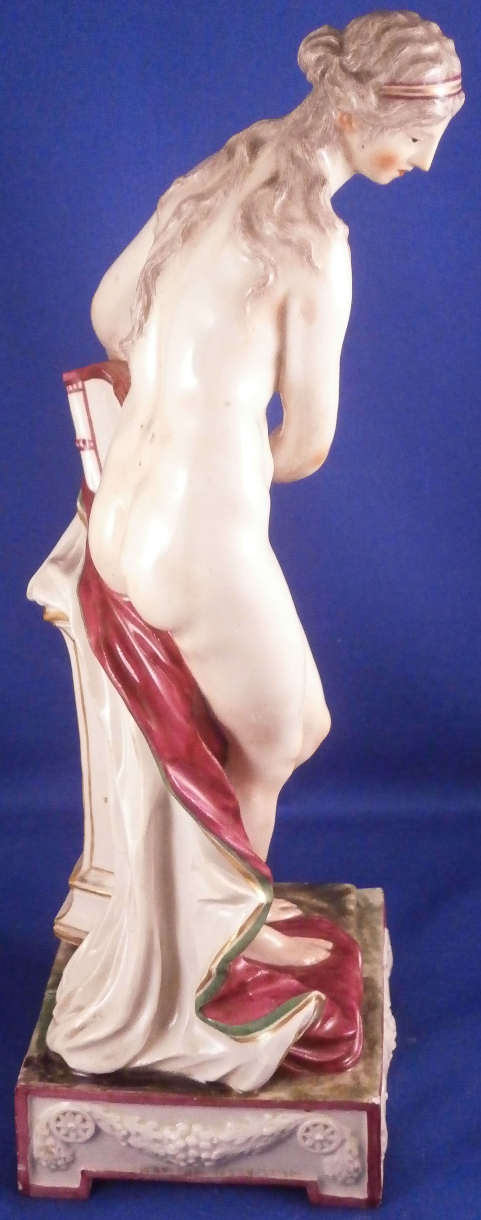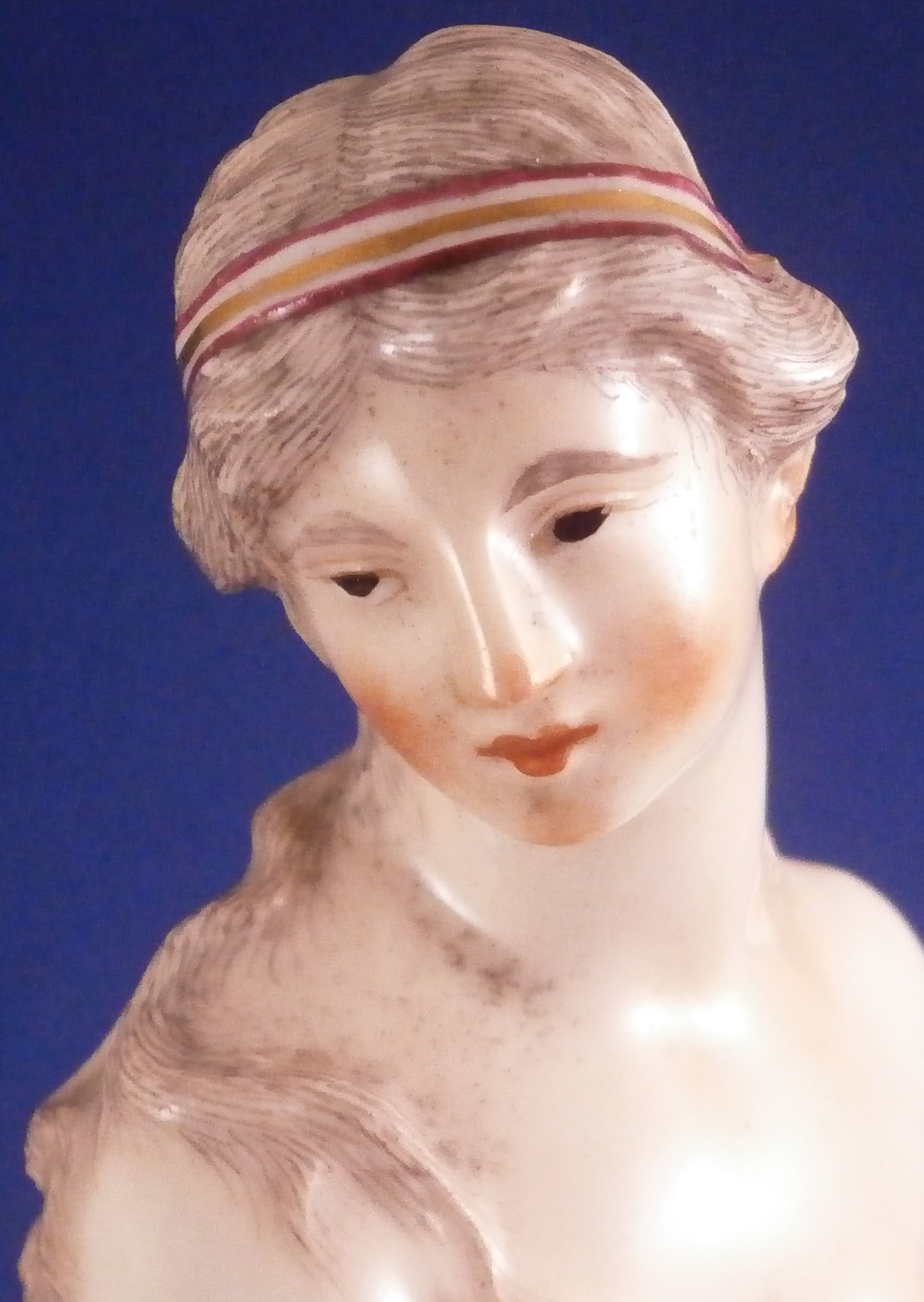 This is a nice large figurine made by Ludwigsburg in the 18th century. It is of a lady standing on a nice base holding an open book in her hands with a large sun symbol on the one side and the word VERITAS written on the other. The mostly nude lady is modled very much in the normal manner for this maker and just covered a bit in her mid section with a puce, green and gold cloth that drapes from her left hand behind the back behind her down to the base. There is a nice pedestal below the book with some gold highlights and the base has a puce trim to the edges and a molded raised detail to each side. The figure is of a ncie size being 10.375 inches tall, 5.5 inches wide and 4 inches deep. The piece is in great condition with some minor damage - a small chip to the edge of the cloth to the right of the book, another tiny one to the front right top corner of the base as well as a couple of tiny munchers to the base edges. A minor well done repair to the fingers on top of the book as well as the the tip of the cloth showing on the right side of the book. Some minor firing flaws and a large firing crack to the middle of the base which was repaired at the factory. This happened because the center supports are lowers than the corners of the base - someone didn't pay attention. Some black firing specs mainly to her mid section and by her neck common to these larger pieces. The figurine is marked with their under glaze blue interlaced double C mark as shown underneath on the underside of the base. A nice figure in a nice size! Please email me for more information or photos.