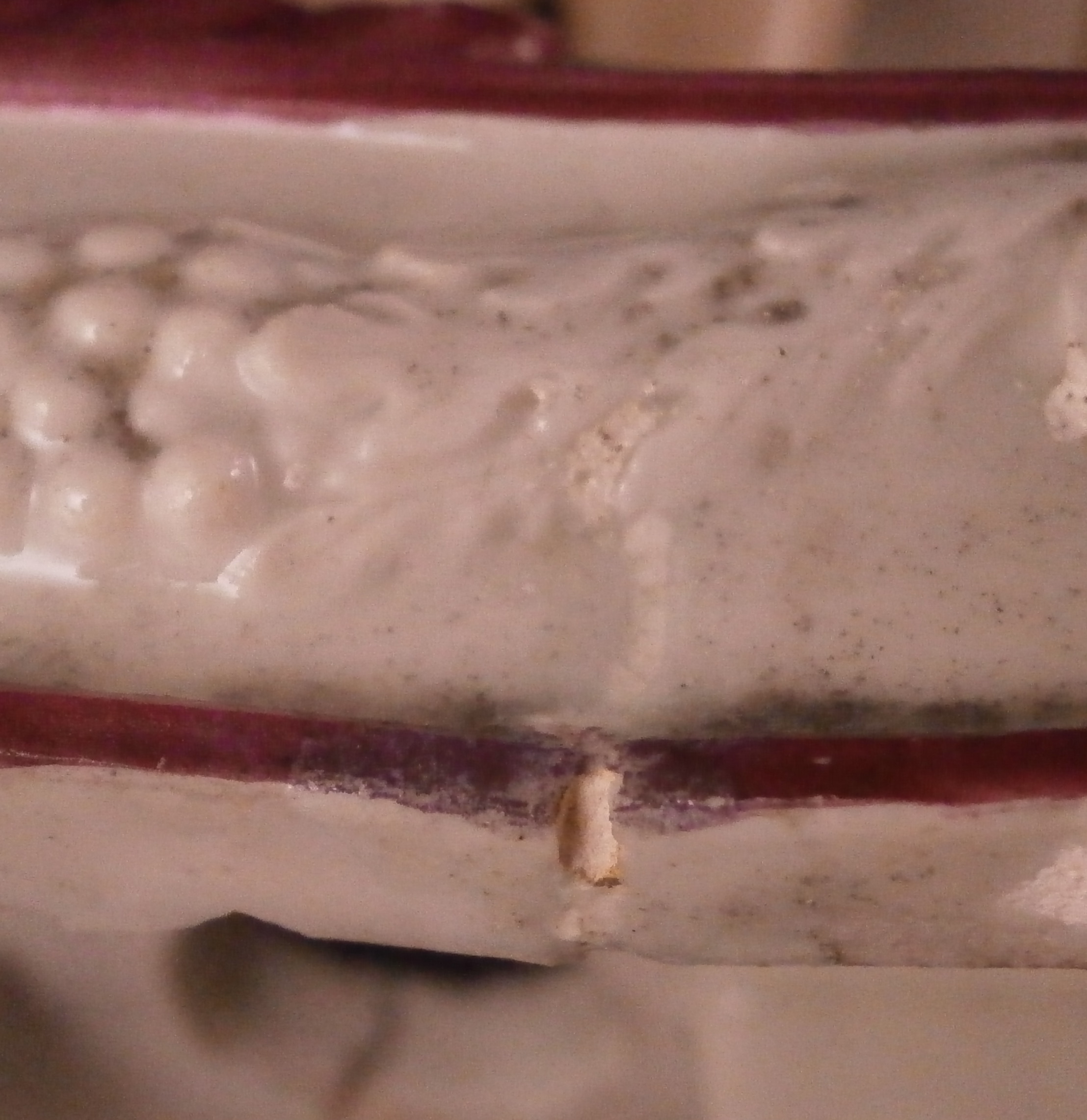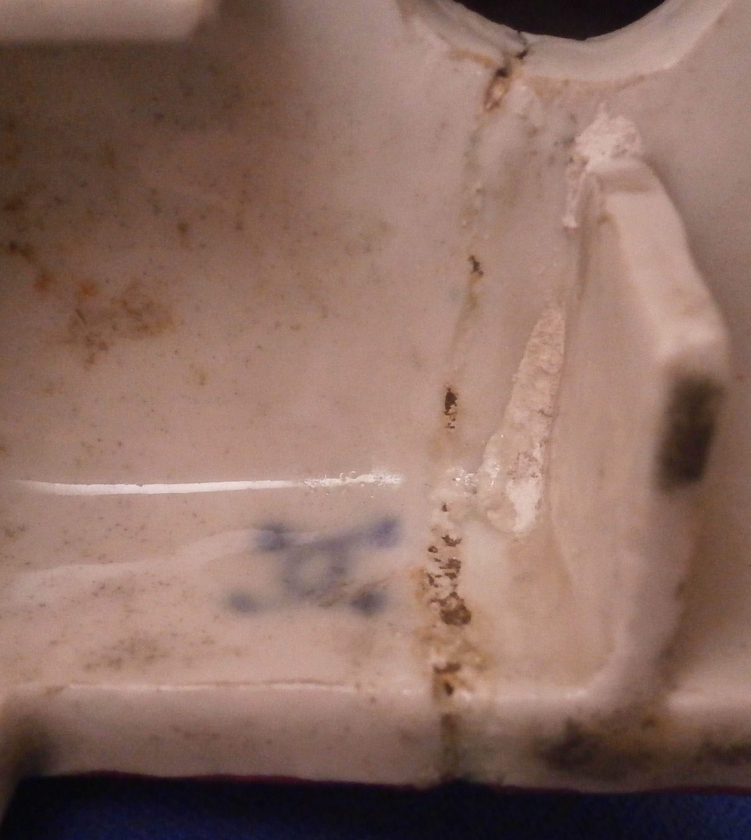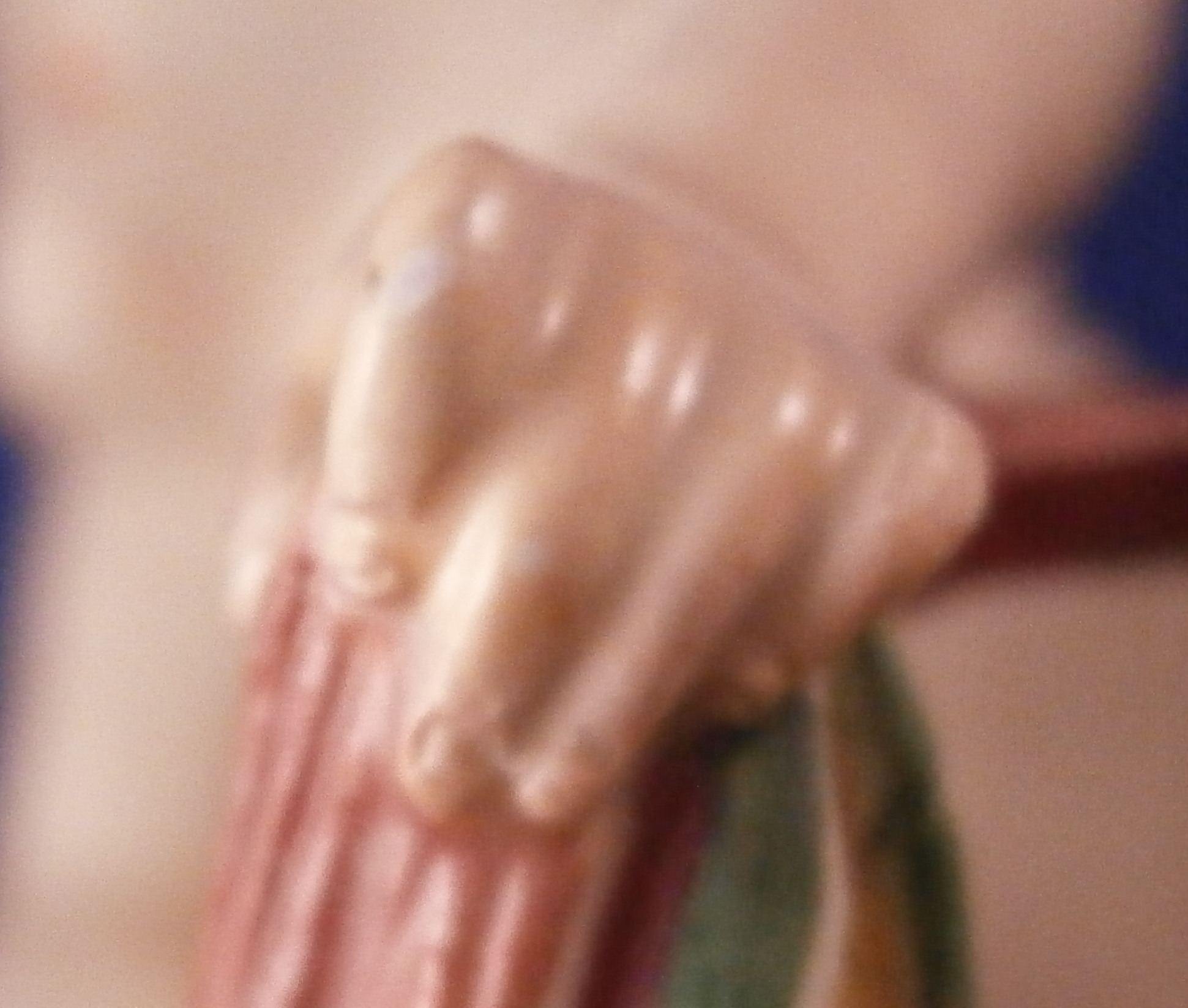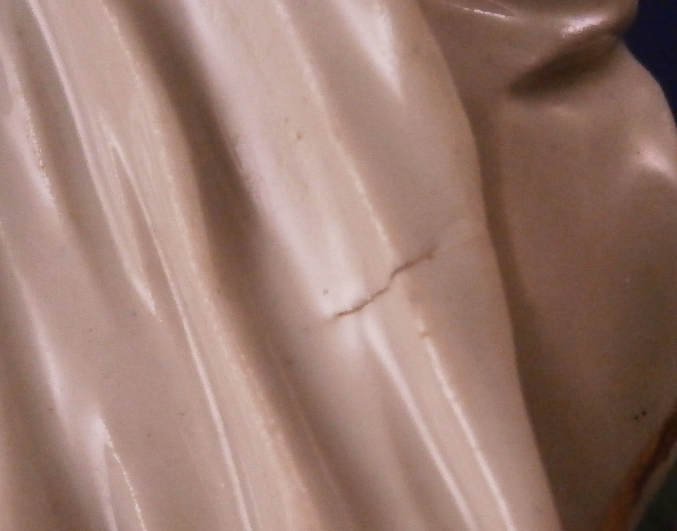 This is a nice large figurine made by Ludwigsburg in the 18th century. It is of a lady standing on a nice base holding an open book in her hands with a large sun symbol on the one side and the word VERITAS written on the other. The mostly nude lady is modled very much in the normal manner for this maker and just covered a bit in her mid section with a puce, green and gold cloth that drapes from her left hand behind the back behind her down to the base. There is a nice pedestal below the book with some gold highlights and the base has a puce trim to the edges and a molded raised detail to each side. The figure is of a ncie size being 10.375 inches tall, 5.5 inches wide and 4 inches deep. The piece is in great condition with some minor damage - a small chip to the edge of the cloth to the right of the book, another tiny one to the front right top corner of the base as well as a couple of tiny munchers to the base edges. A minor well done repair to the fingers on top of the book as well as the the tip of the cloth showing on the right side of the book. Some minor firing flaws and a large firing crack to the middle of the base which was repaired at the factory. This happened because the center supports are lowers than the corners of the base - someone didn't pay attention. Some black firing specs mainly to her mid section and by her neck common to these larger pieces. The figurine is marked with their under glaze blue interlaced double C mark as shown underneath on the underside of the base. A nice figure in a nice size! Please email me for more information or photos.