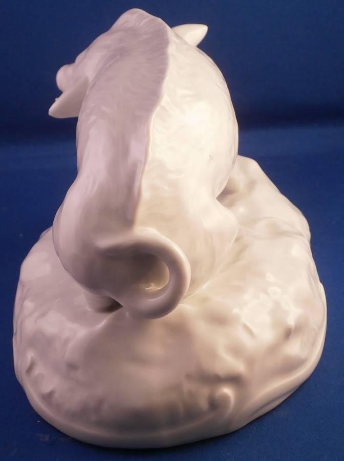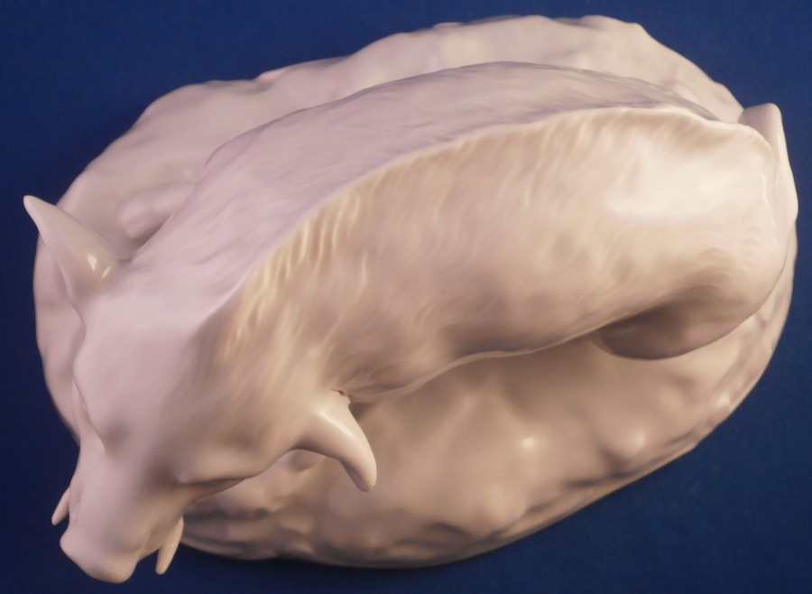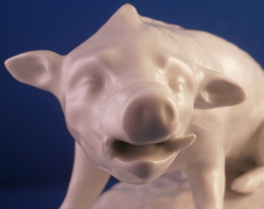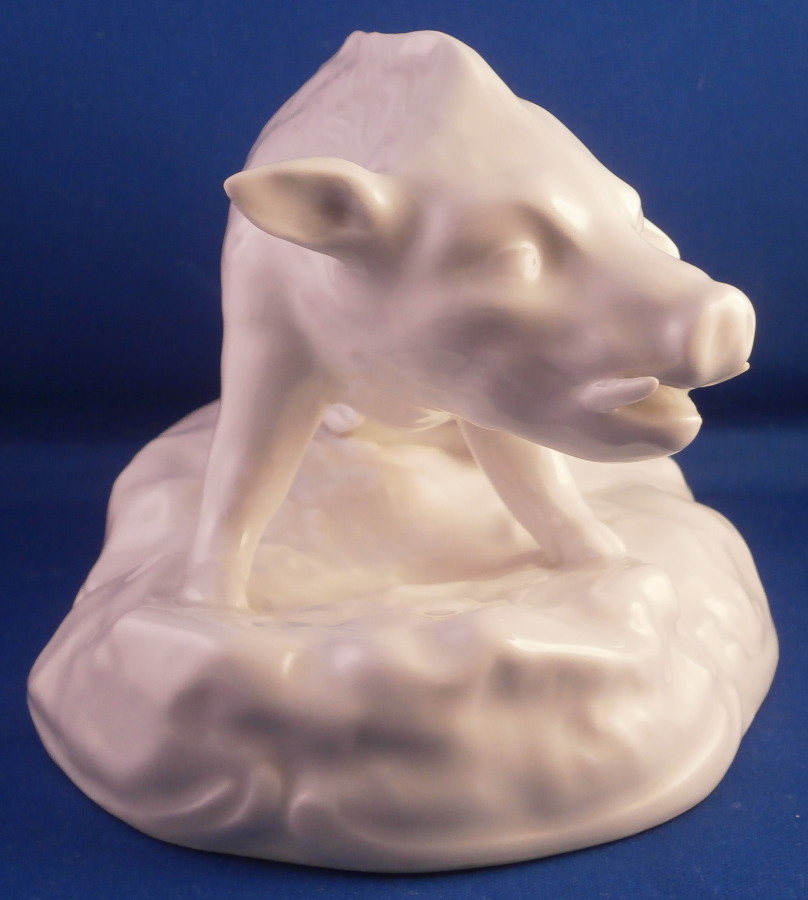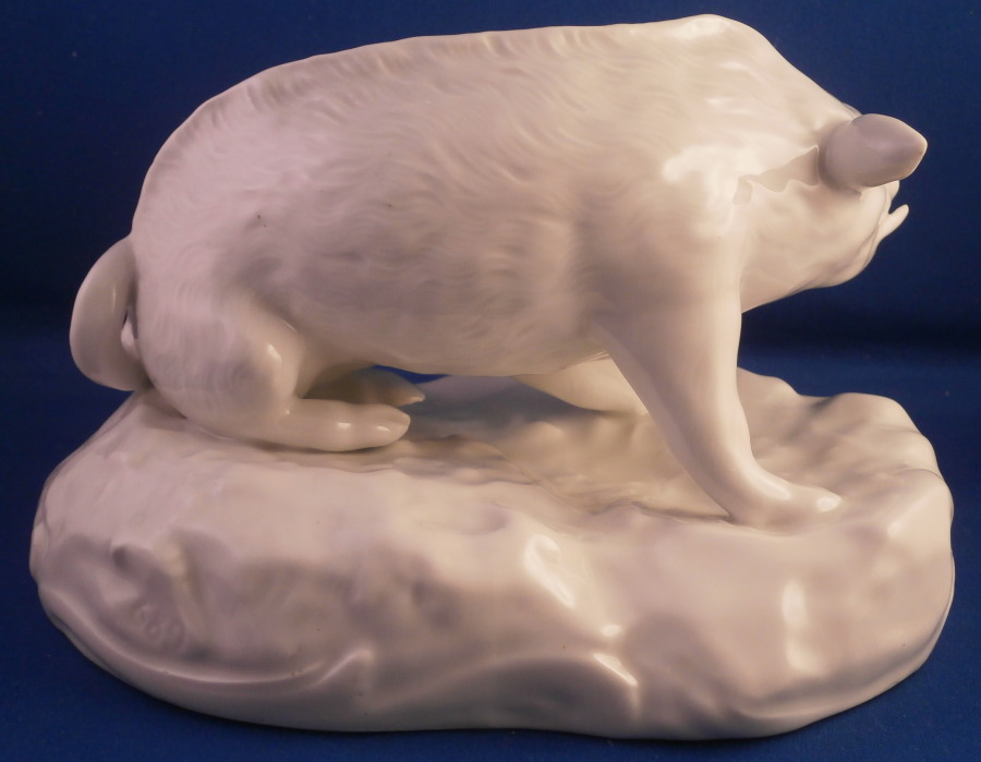 This is a very rare figure of a wild boar made by the Rheinische Porzellanfabrik Mannheim in about 1907. Only reason I could even figure that out is that I owned a painted version a few years back that was marked. This maker bought a few of the original Frankenthal molds around 1907 after which they started making copies of these right away which were sometimes marked with the crown over CT mark just like the original pieces. In a very rare occasion they also marked them with their own shield mark with a star above it and the letters RPM inside but this piece here is unmarked except for a model number on the side of the base as shown. I think about 20 molds were bought by this maker of which about half were figures and all are very rare! In the books only white pieces are shown including this wild boar piece. The figurine is superbly modeled since it is a Frankenthal piece but they had a firing issue and it has a firing crack behind they left ear - probably why it was never marked. Also a tiny rough spot to the tip of that same ear. Otherwise is is in great condition and displays nicely. The figurine is of a nice size being 4.5 inches tall, 7.5 inches long and 5 inches wide. This is a very rare piece and shows us again how complex the field of porcelain really is. The owner of the Mannheim factory tried to sell the pieces to Nymphenburg but they had no interest except in that they used the CT mark under a crown which was owned by Nymphenburg and thus they told them to grind all these marks out of their pieces or else, which they complied with. The mold were soon after sold to a museum group by 1908 so very few pieces were even made and fewer are marked. A great piece! Please email me for more information or other pictures.
