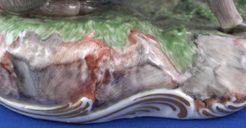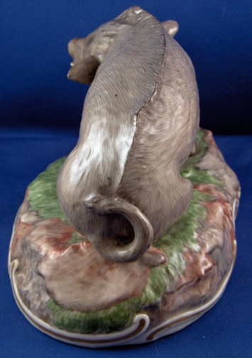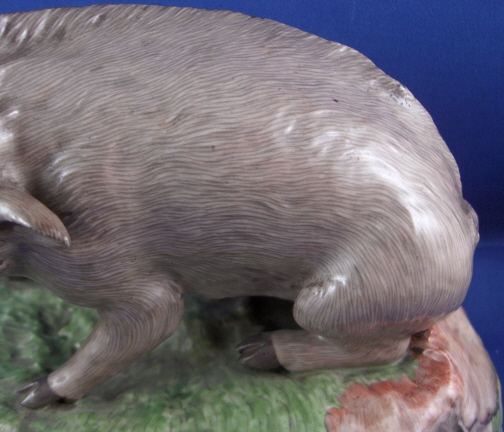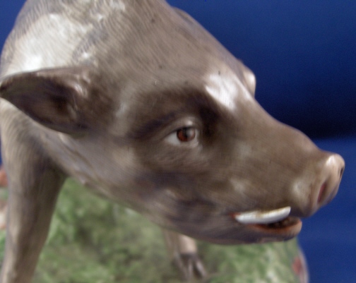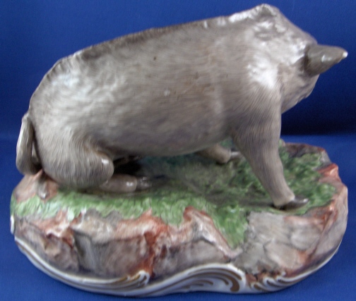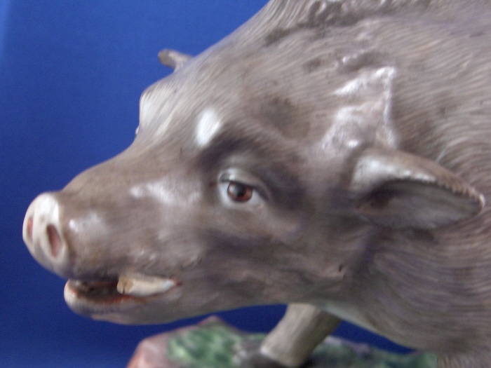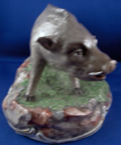 This is a very rare figure of a wild boar made by the Rheinische Porzellanfabrik Mannheim in about 1907. I never even knew this place existed until I started doing a bit of research on this piece. This maker bought a few of the original Frankenthal molds around 1907 after which they started making copies of these right away which were marked with the crown over CT mark just like the original pieces. In a very rare occasion they also marked them with their own shield mark with a star above it and the letters RPM inside which are hard to see. I first thought this was a very early Nymphenburg redo of the Frankenthal models but they didn't start until about 1920 with that and always added the year mark. So I was stumped until I finally found things out about the Mannheim maker and here it is. I think about 20 molds were bought of which about half were figures. In the books only white pieces are shown including this wild boar piece but it does say they also painted some. The figurine is superbly modeled since it is a Frankenthal piece but the painting is also amazing much better what one usually sees so someone in Manheim was an ace in that department! The figurine is of a niee size being 5 inches tall, 7.5 inches long and 5.25 inches wide. The piece is in great condition with the left tusk have been restored at some point and the tip broken off again. This is a very rare piece and shows us again how complex the field of porcelain really is. Learned something new again even after all this time :) The owner of Mannheim tried to sell the peices to Nymphenburg but they had no interest except in that they used the CT mark under a crown which was owned by Nymphenburg and thus they told them to grind all these marks out of their pieces or else which they complied with. The mold were soon after sold to a museum group by 1908 so very few pieces were even made and fewer are painted and marked with both the CT mark and their impressed mark. A great piece! Please email me for more information or other pictures.
