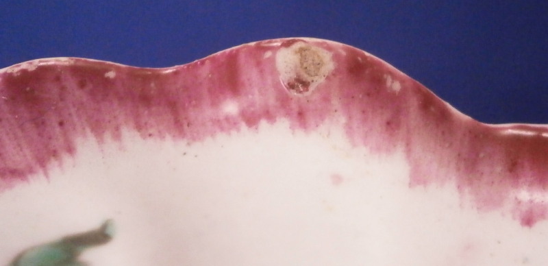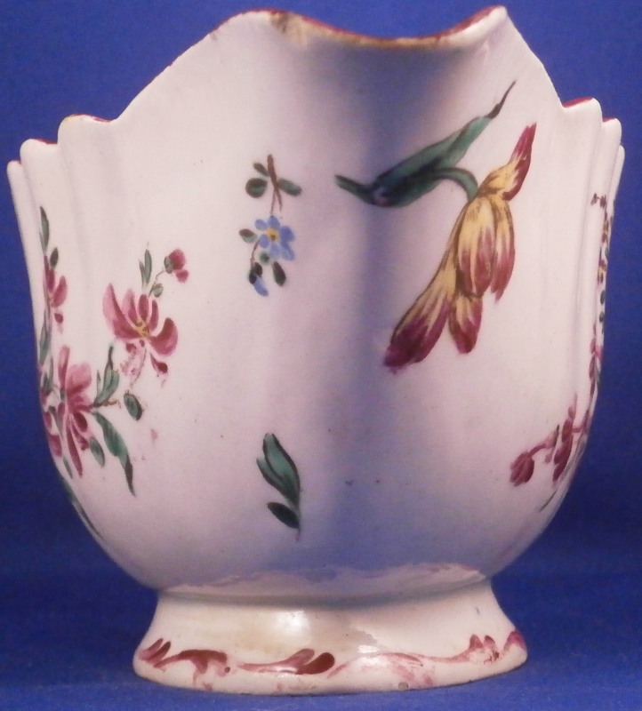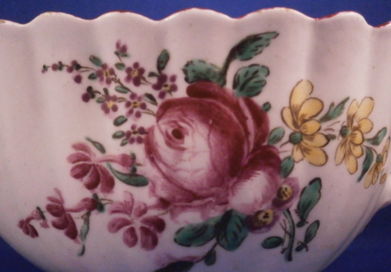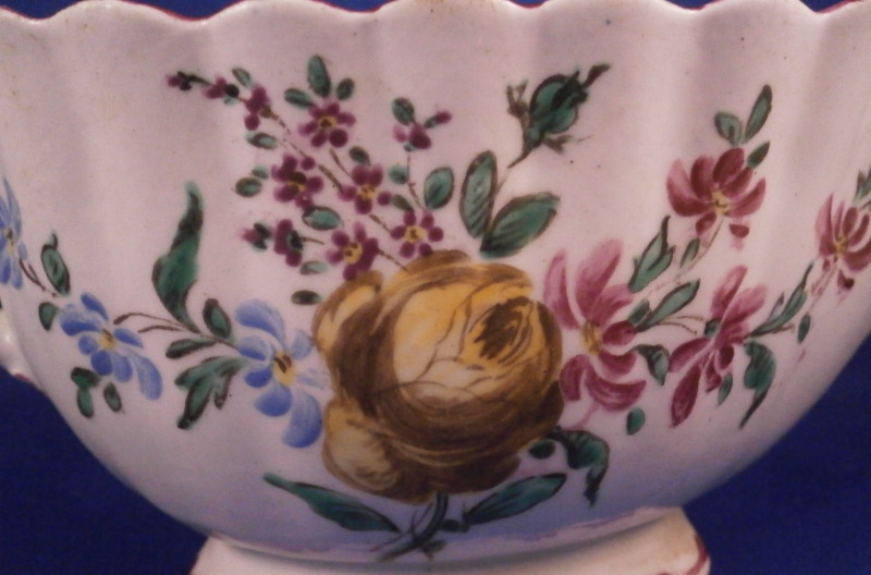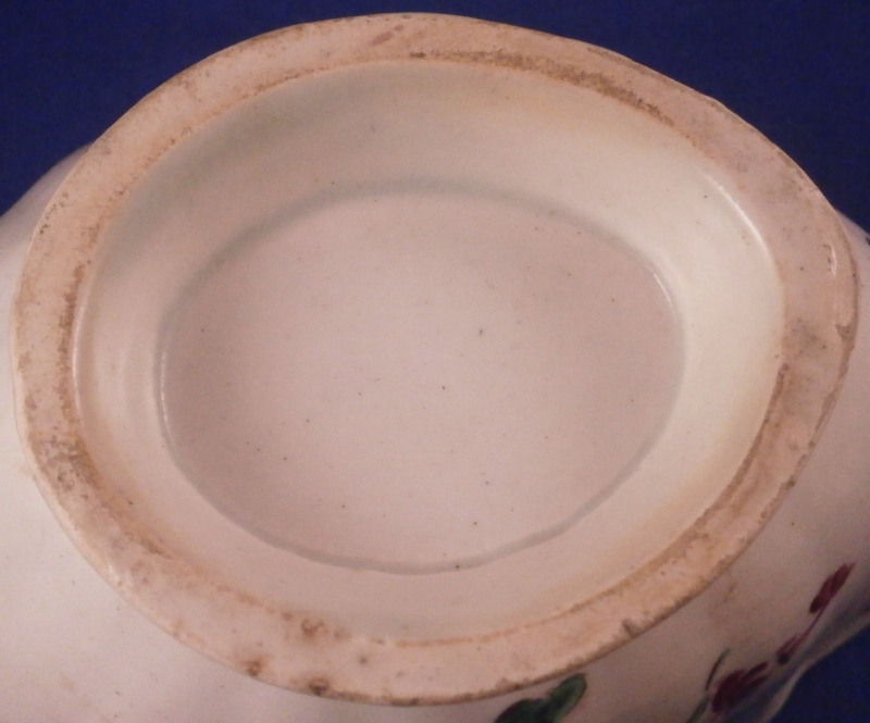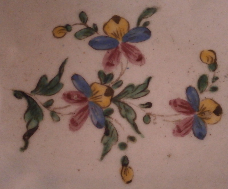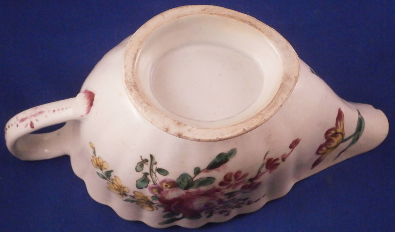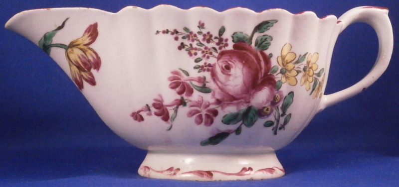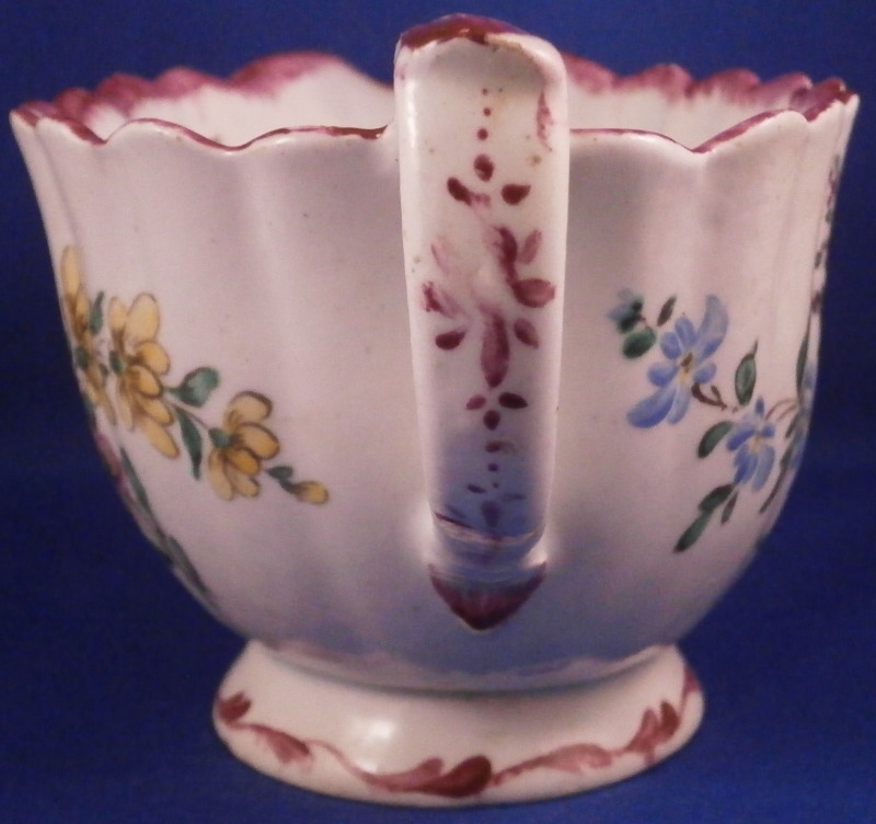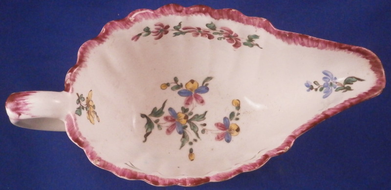 This is a superb faience sauce / gravy boat dish made in the Marseilles region of French in the 18th century likely by Veuve Perrin or someone of that caliber. The dish is nicely modeled with simple handle on one side and spout to the other. The main body is hand painted with a superb floral arrangement to either side as well as some single flowers under the spout, single flowers to the rim of the inside and another larger flower to the bottom inside. Puce trim to the edges and the handle. If it were made of porcelain I would have said it was made by Bow - the colors and style are very similar. The piece is in superb condition with jsut a small chip to the outside edge of the spout and some very minor glaze flakes here and there. The dish is sadly not marked which means it is that much harder to ID perfectly especially for me who is more into porcelain normally than this sort of ware. Seems to be fairly normal though to have unmarked pieces. The sauce dish is above 3.25 inches tall, 7.375 inches long and 3.625 inches wide. Please email me for more information or other pictures.