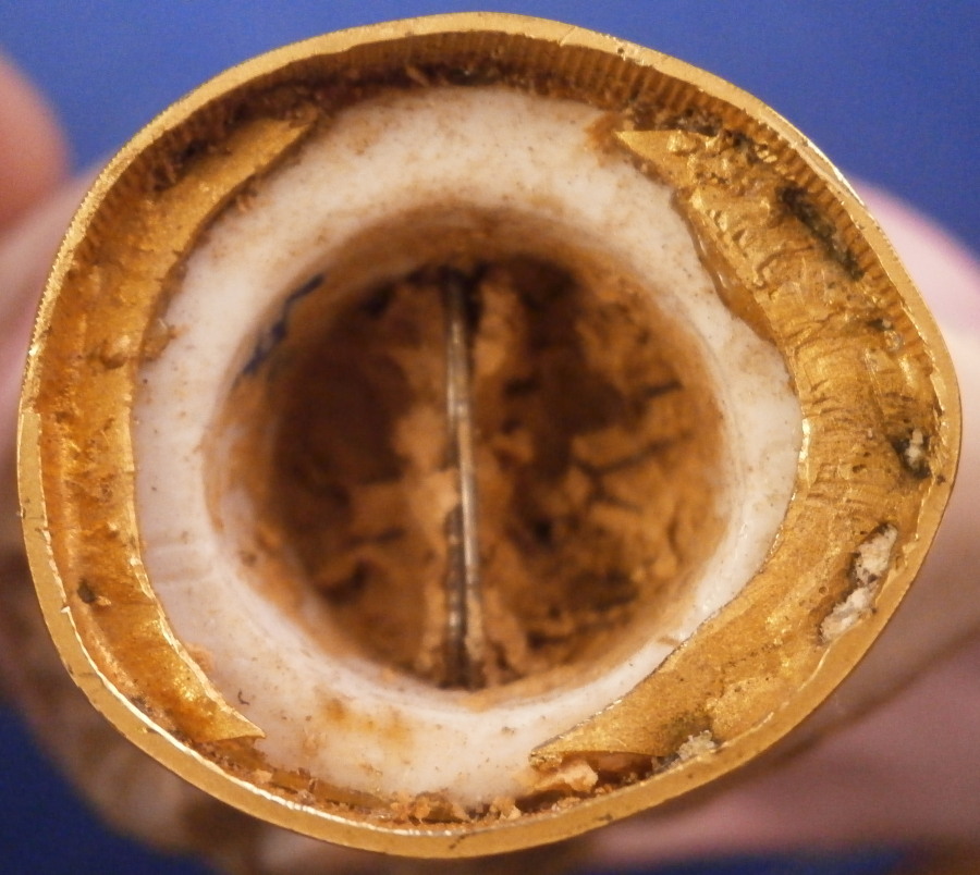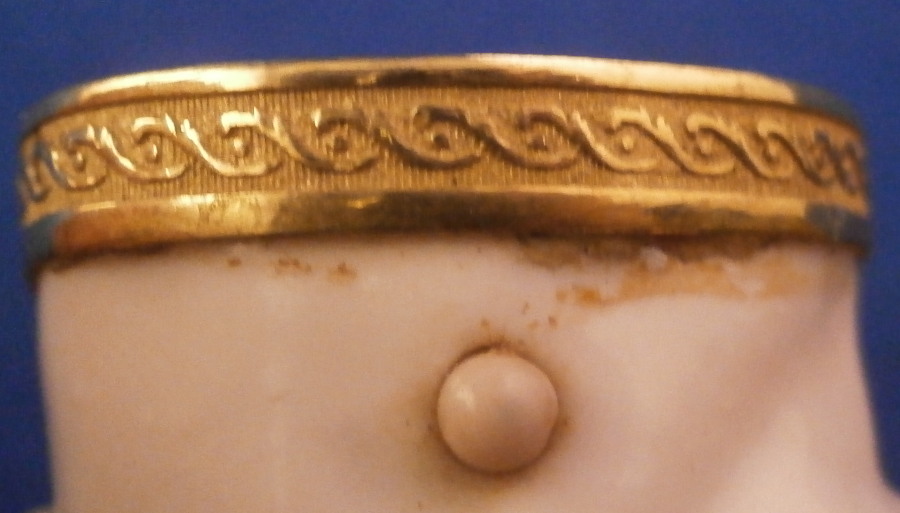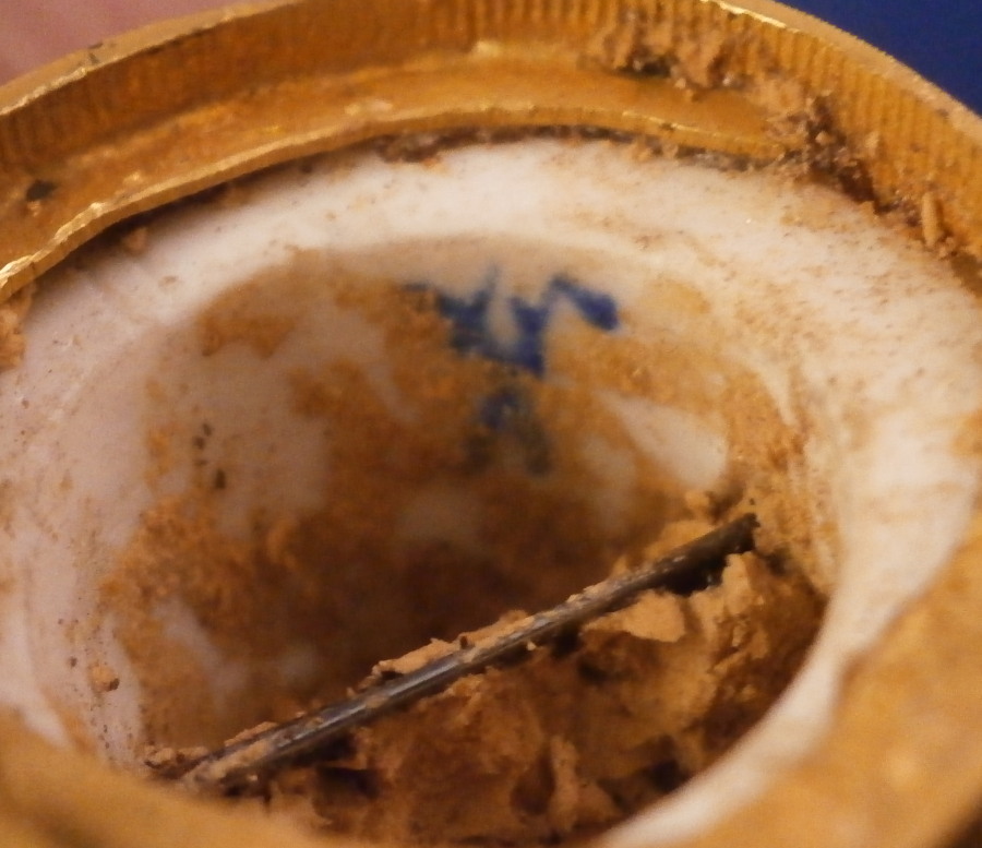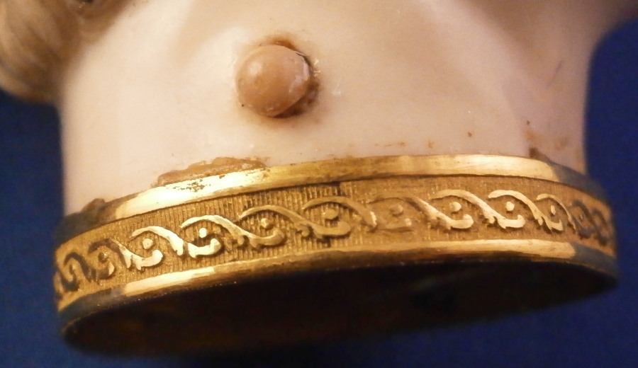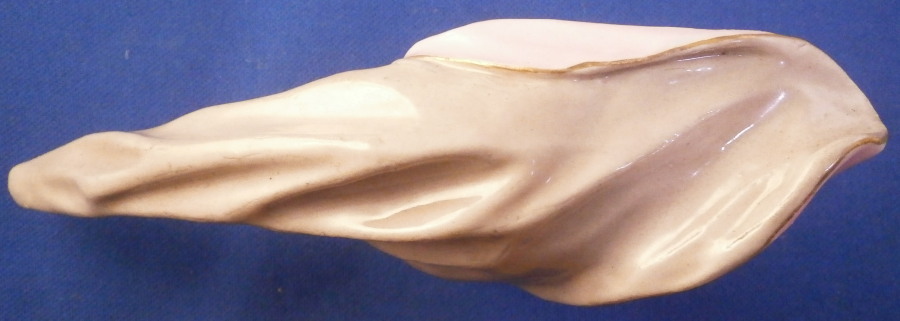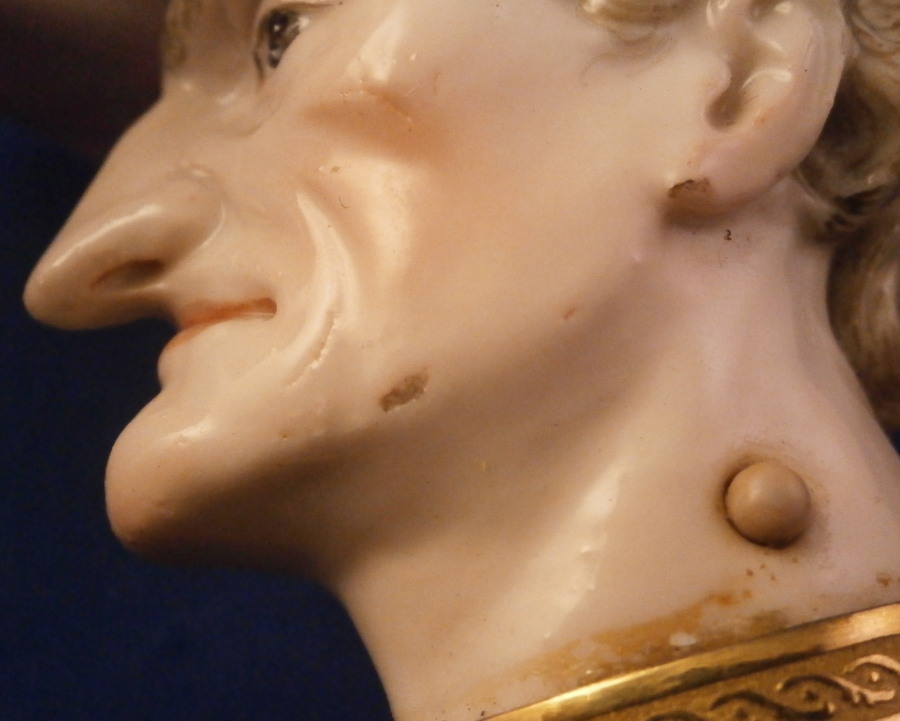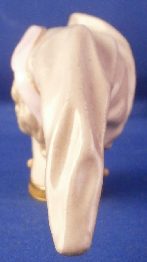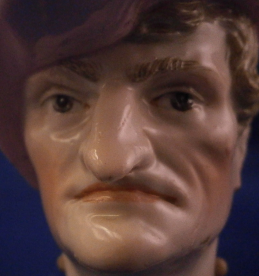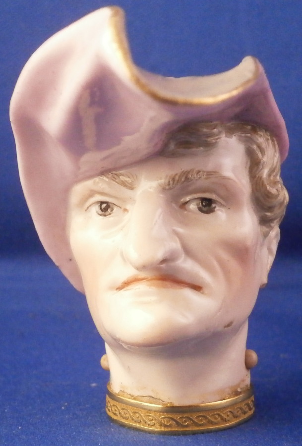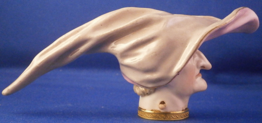 This is a rare figural cane handle made by Meissen in the 19th century. It is of a gentleman's head with pointy oversized hat making the shape of the handle. It is a rare piece to find and I found a couple described as it being a commedia dell'Arte character but I don't think it is. Looks more like a grotesque head with a nose larger than my own and a huge pointy hat. A really fun piece and not one you'll find again anytime soon. The piece is superbly modeled and hand painted with lots of detail as one would expect from the top maker. The hat is just silly but it works perfectly together! The bottom edge has a gold piece attached to it. I have no way to test it but it is definitely a high grade gold. There are two holes on the sides of the bottom end in which someone has inserted two needles to the ehads fill the holes. This would ahve been to attach the wooden cane to the handle securely. At some point is seems to ahve been used as a bottle stopper since there was some cork left in it which I dug out a bit to show the mark on the inside. The piece is in great condition with no damage but it does have some manufaturing flaws. A few black rough spots along the side of the hat and two glaze missed on his face - one on the lower cheek and another on the ear lobe as shown. These have been there since it was made and are not later damage! The piece is 2.375 inches tall, 5.125 inches long and 1.625 inches wide. It is marked on the inside with the blue crossed swords mark as shown. The inside hole diameter is about 0.625 inches and the inside gold collar size is about 0.875 inches by 1 inch. Please email me for more information or other pictures.