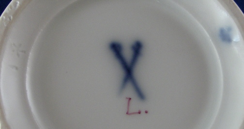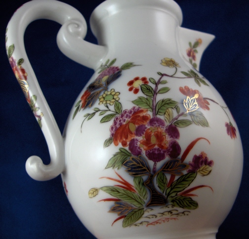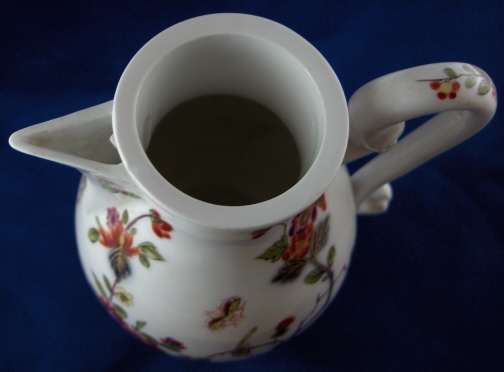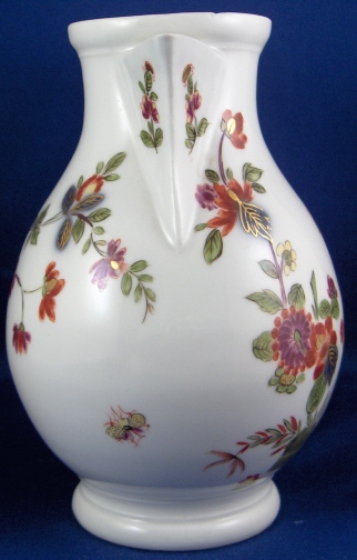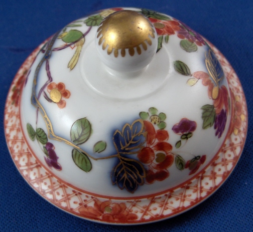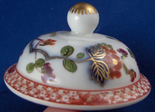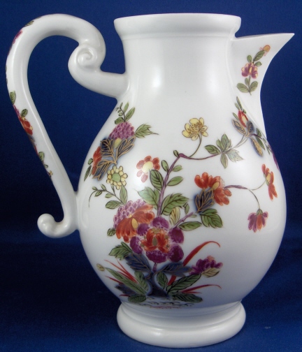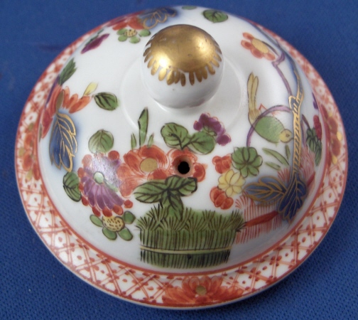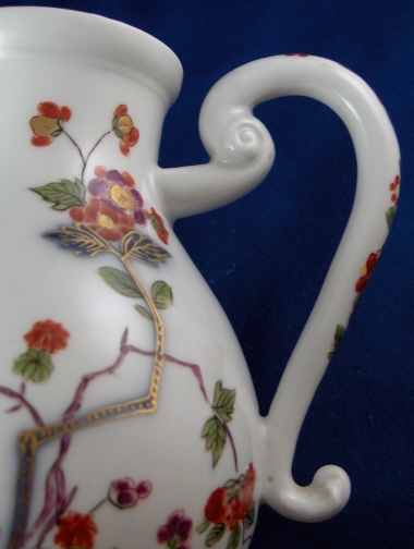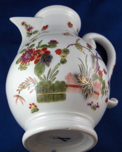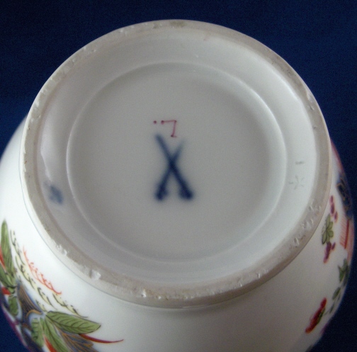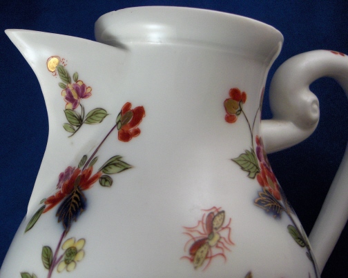 This is a a special treat - an extremely rare and early small coffee pot and its lid made by Meissen in about 1725. It has a really nice shape with the early handle which I like very much and the spout is a bit different than later ones as well. It is also quite interesting that the body must have been made first then cut open at the bottom to attach the base. That is evident from the inside which I tried to show in a picture but it's hard to see there. The pot is superbly handpainted with an early Indian Flowers (Indianische Blumen) design in the Kakiemon palette. The colors are bright and fresh. The underglaze blue parts are highlighted with gilding. A real fun design with bugs and a bird included. Even the handle has plenty of flowers on it as does the lid which has an iron red and gold design to the rim and a simple finial typical to this period painted with gilding. My favorite part is that this piece is in superb condition with barely any wear even to the gild highlights. There is one tiny flat chip to the very to rim of the pot which is not obvious at all! Some roughness to the footring but that is all original from the making! On top of that it is superbly marked with about every type of mark one could wish for - the underglaze blue crossed swords (about as early a version as you can have), the bossierers marks impresed (a star and a line), a blue painter's mark (a K. I think but hard to read) and a painter's mark L. in puce. The piece is 7 inches tall and 3.75 inches in diameter. Please email me for more information or other pictures.