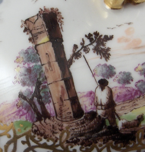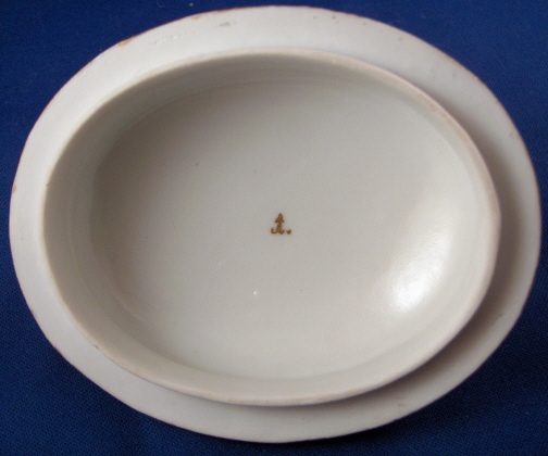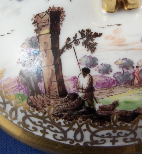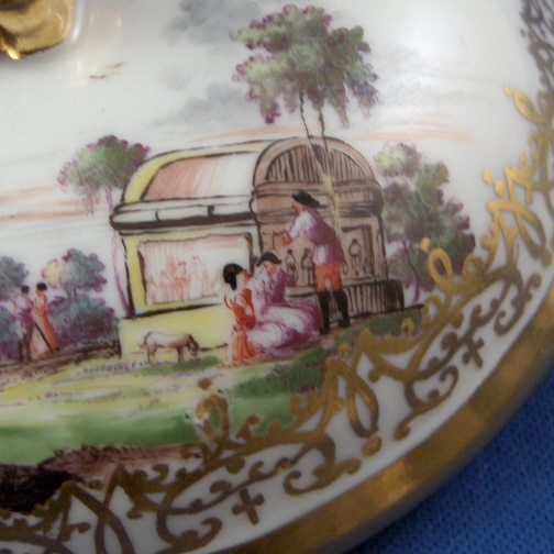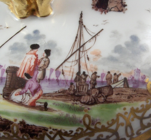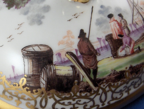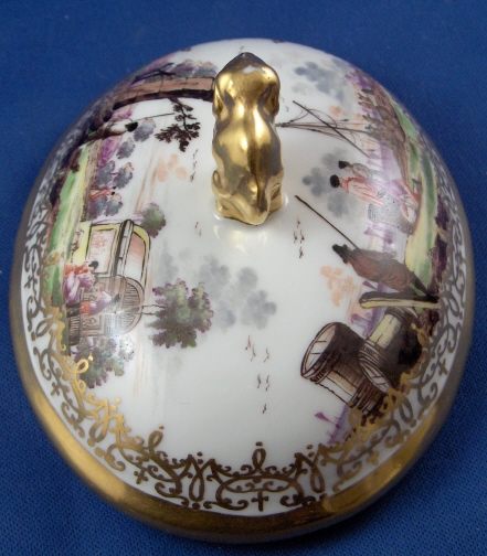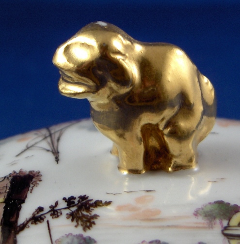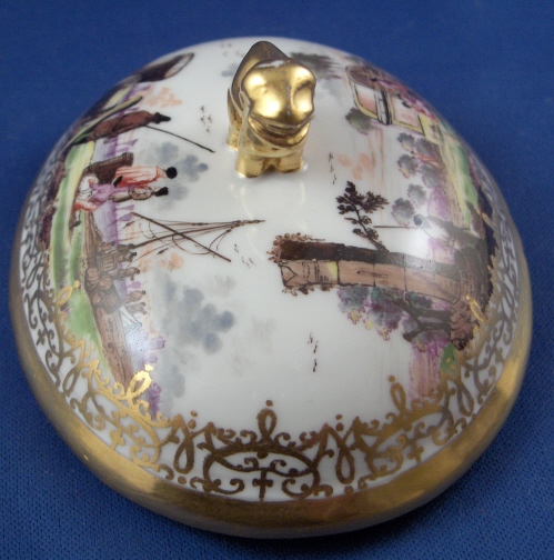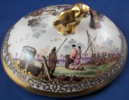 This is a very rare treat - a lid for a sugar dish made by Meissen around 1740. A top of the line example even for Meissen with two large Merchant / Harbor scenes handpainted on it and lots of fancy guilding. The quality of the painting is superb as is the gilding. The figural finial is nice and rare as well though I am unsure of what it is supposed to be - a foo dog or something out of a Star Wars movie?? Now all we need is the bottom to this and we'd be having one really nice treat! Amazingly the lid is in perfect condition with a tiny mini flat chip to the ring that fits into the bottom and one tiny spot of wear to the gilding on top of the finial's head. Neither is obvious by any means! It is even marked with a gilders mark so we have about everything one could wish on a lid :) And if someone has the bottom or a damaged top it would be an easy match. The lid is about 4.25 inches wide and 3.375 inches deep. The underside rim that would fit into the sugar box bottom is 3.5 inches (o.d.) wide by just under 2.75 inches. Please email me for more information or other pictures.
