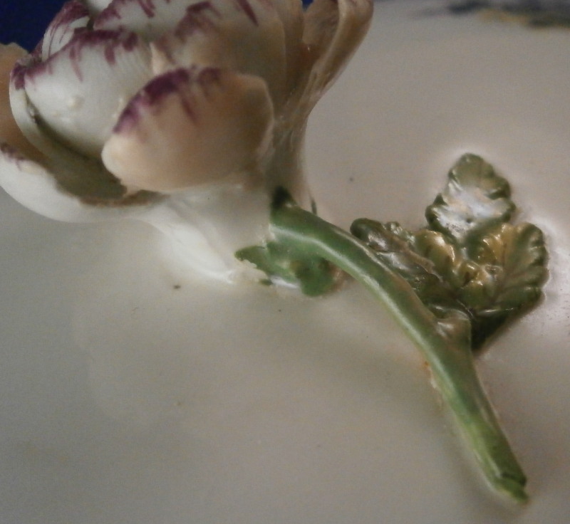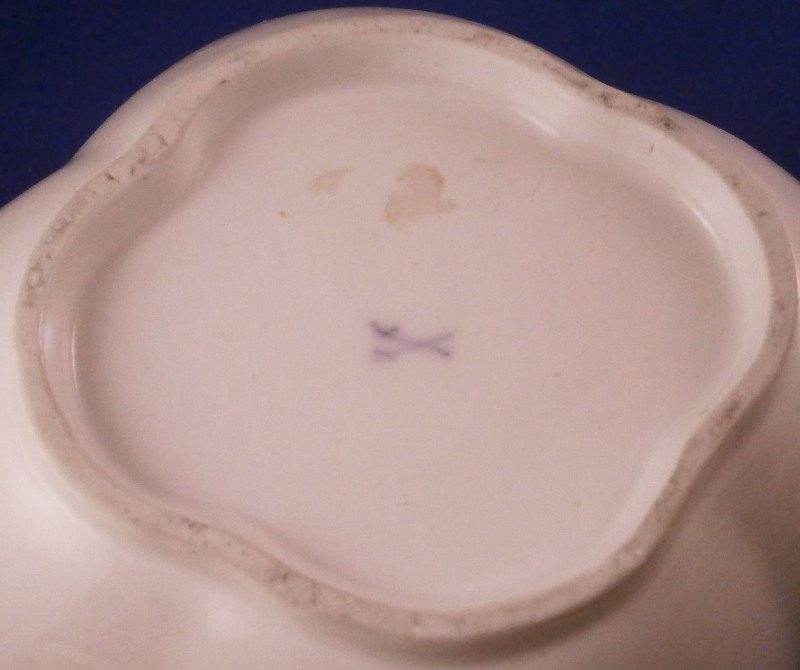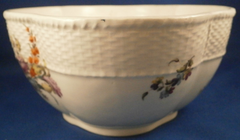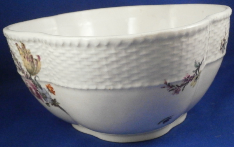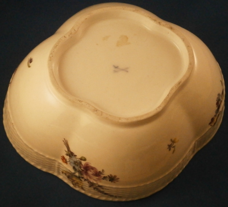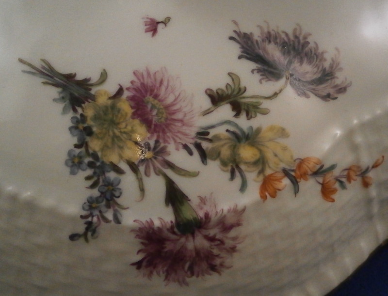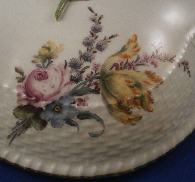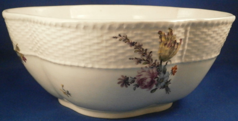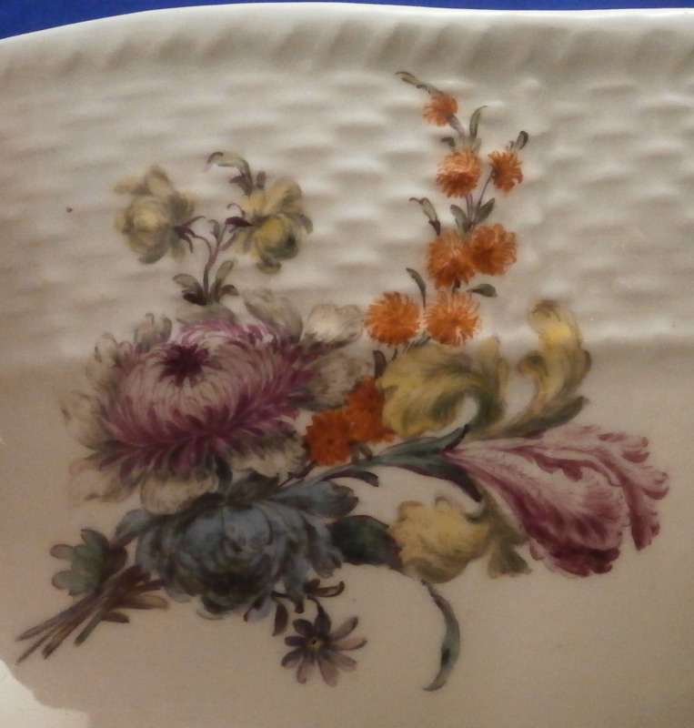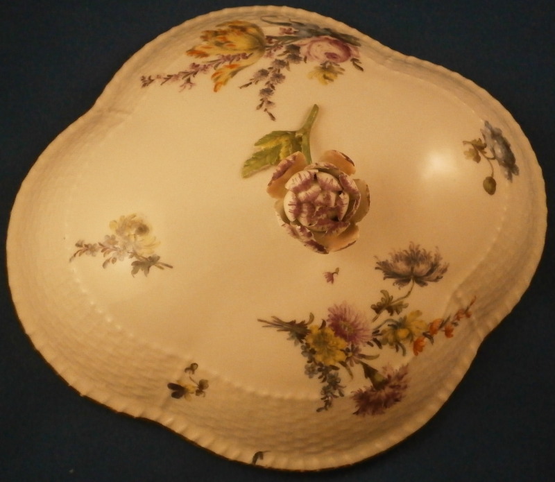 This is a really nice and early lidded serving dish made by Meissen in about 1740. The piece doesn't have a number on it yet so the piece was probably made just a touch before 1740. One does not find these lidded dishes often at all and I ahve a pair of them and will list them separately on the site. The lid and main body each have a basket weave design in relief to the paste along the rim, a gold trim to the edge and lots of superbly hand painted flowers all around. The lid and main body have two larger flower arrangements on them as well as two smaller arrangements and some single scattered flowers as well plus the occasional leaf to hide a flaw. Gold trim to the edge of the lid. The flowers are superb and in the early Deutsche Blumen style still influenced by the earlier Woodcut style flowers a bit. The lid has a really nice floral finial to it with its stem and leaves. The set is in superb condition with three petals of the finial and part of the stem having been worked on. It is well done and displays perfectly! A little wear to the gilding and a small repair to the underside ring of the lid which is completely invisible. The dish with its lid in place is about 4.5 inches tall, 7.5 inches wide and 6.5 inches deep. The main body is marked with the under glaze blue crossed swords mark as shown. Please email me for more information.