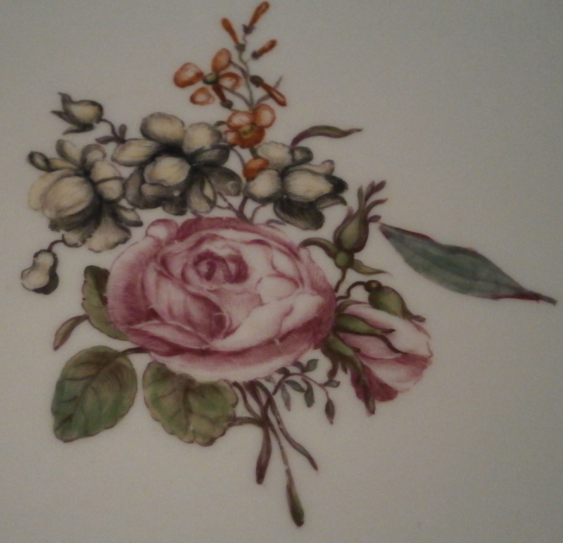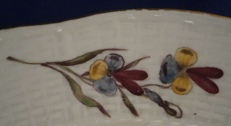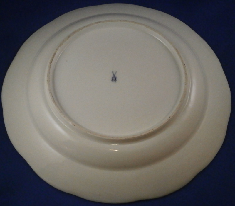 This is a really nice early plate made by Meissen in about 1740. It has a nicely shaped rim with gilding on the edge, a very nice large floral arrangement in the woodcut style in the center, a few tiny scattered flowers around the well, three larger flowers along the edge as well as a tiny blossom likely there to cover up a porcelain flaw from the firing. The rim has a molded basket weave design to it which looks very nice. The flowers are still done in the early style before the Deutsche Blumen style took hold later in the 1740's. The piece is marked with the straight blue crossed swords underneath with a dot to either end and an impressed number 16. The piece is in great condition with a bit of wear to the gold trim as well as the the flowers especially the tiny ones around the edge of the well from stacking. All in all a very nice example from this period. The plate is 1.25 inches tall and has a diameter of 9.25 inches. Please email me for more information or other pictures.