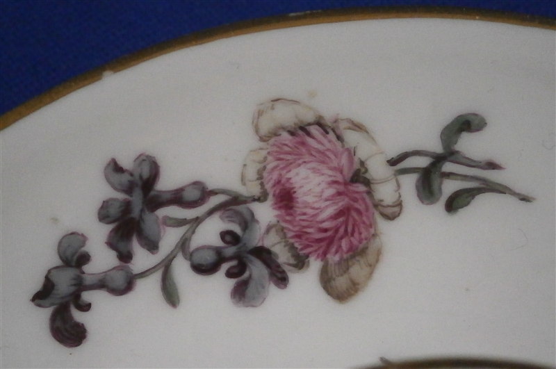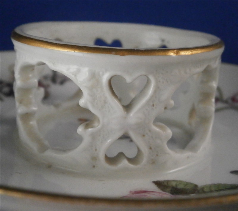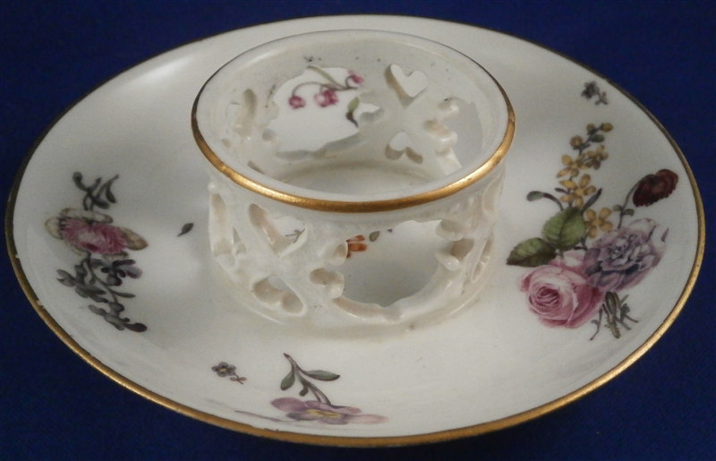 This is a rare early trembleuse saucer made by Meissen in about 1740. It is hand painted with one larger floral arrangement, one smaller one as well as three single flowers and a leaf to cover up a firing flaw. Gold trim to the edges. What makes it rare it has the extra part in the center to help keep the cup in place for older people whose hands were a bit shaky. This one would have had a beaker shaped cup with it. The center part has a nice cut out design and even the in between spaces have a design to the paste. The saucer is marked with the straight blue crossed swords underneath as shown. No impressed number yet and the flowers are still in the wood cut style so a nice early example! The piece is in superb condition same as the day it was made except for a small flat chip to the inside of the foot ring that has no meaning. The saucer is 0.875 inches tall and has a diameter of 4.875 inches. The center part stick up another half inch and has a diameter of 1.875 inches on the inside. Please email me for more information or other pictures.