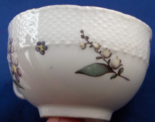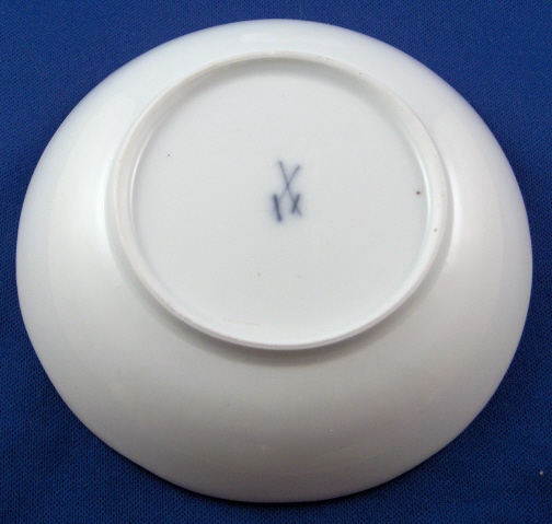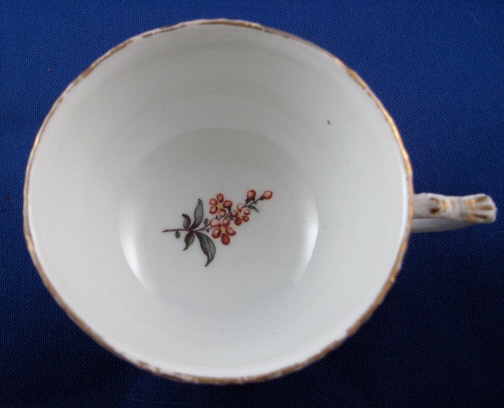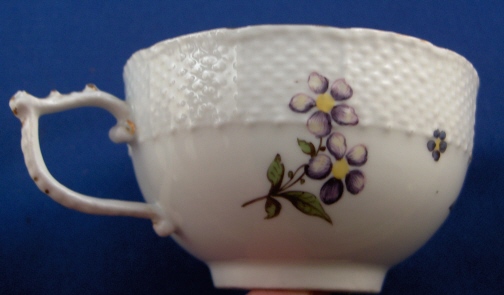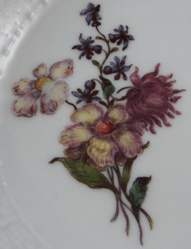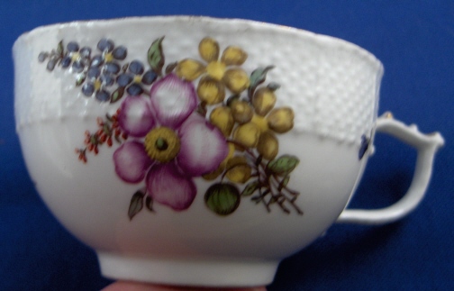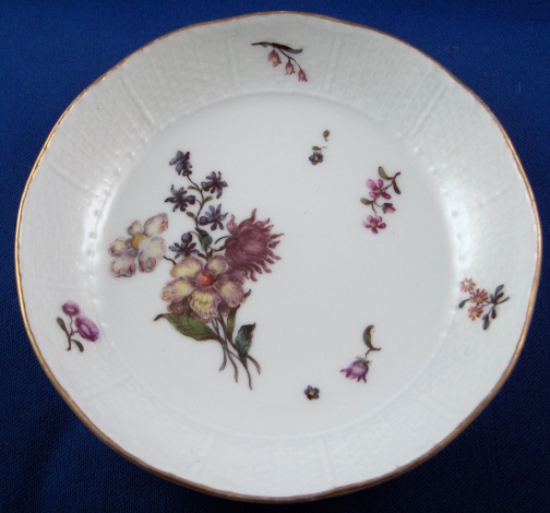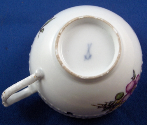 This is an early cup and saucer made by Meissen in about 1745. Both pieces are handpainted with superb floral arrangements as well as single flowers in the woodcut style before the Deutsche Blumen style took hold. These flowers are much more natural looking and much more detailed than later ones. They have a gold trim to the rim and the handle as well as a nice basket weave design to the rim area. The set is in superb condition with just a little wear - mostly to the top rim of the cup and one flower on the saucer. The saucer is about 1 inch tall and 4.5 inches in diameter. The cup is 1.75 inch tall and 2.875 inches in diameter. Both pieces are marked with the underglaze blue crossed swords mark that are straight from this period. Please email me for more information or other pictures.