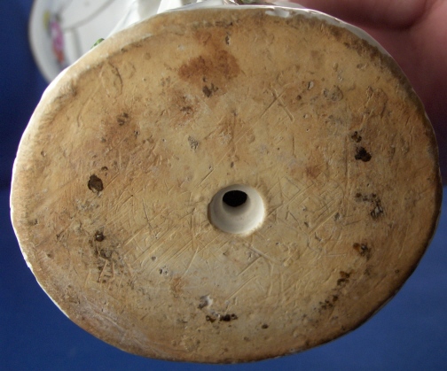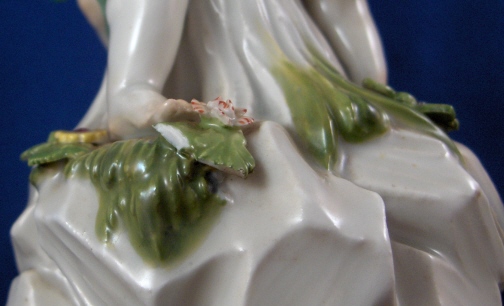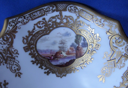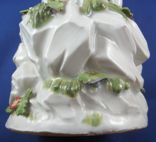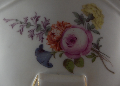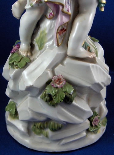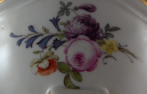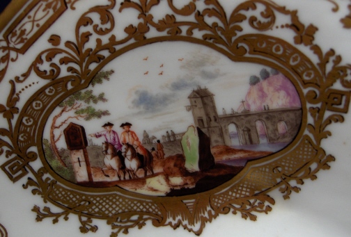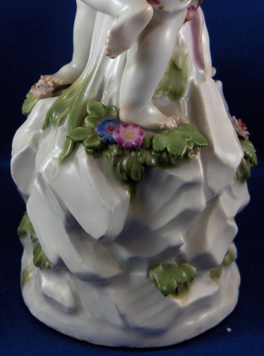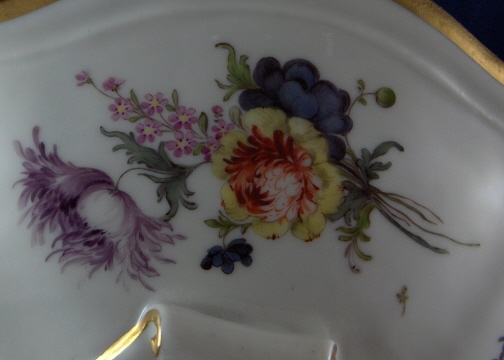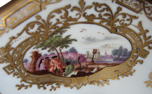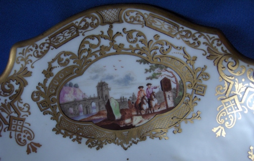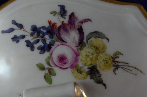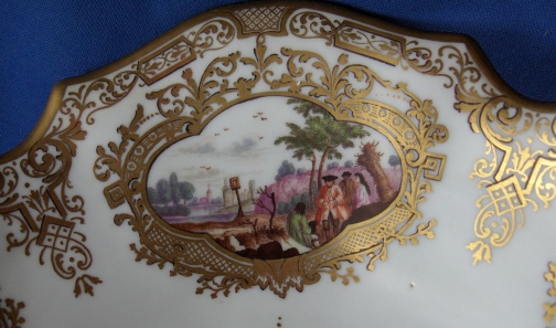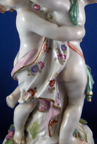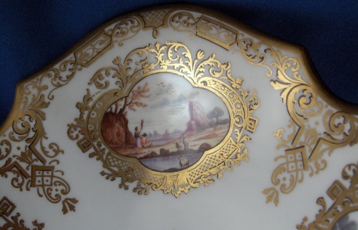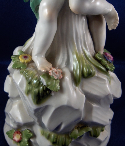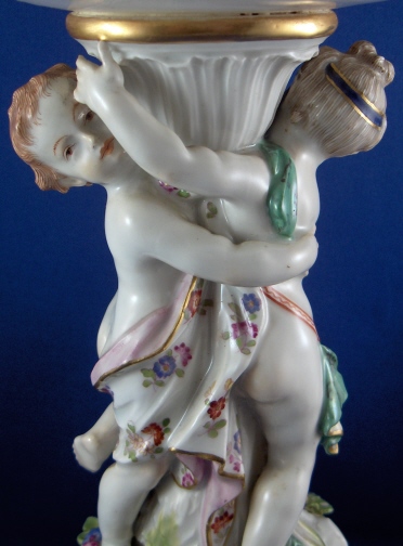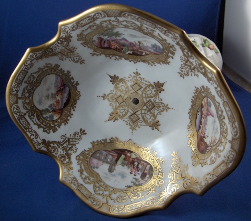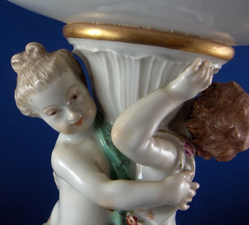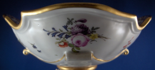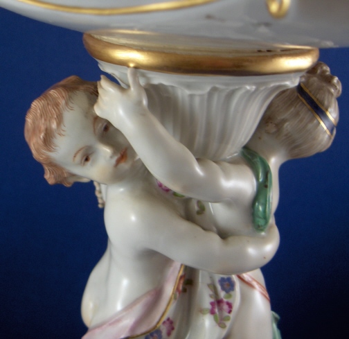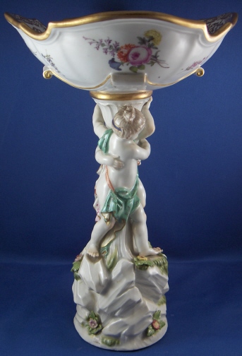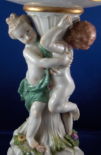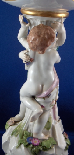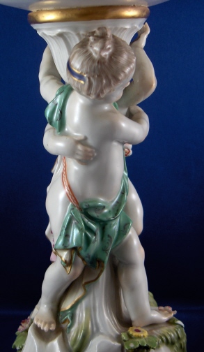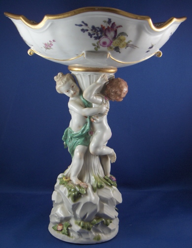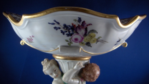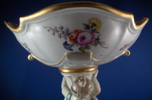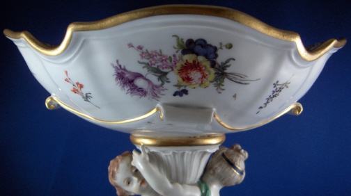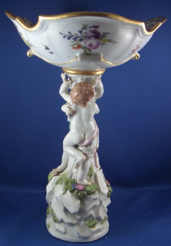This is a rare compote made by Meissen in about 1745. The sideview is superb but do scroll down to the last pictures of the inside of the bowl and it is well worth it :) The compote has a figural foot of two putti on a rock base decorated with flowers, leaves and grass. The putti are wearing just a small cloth nicely handpainted in the style of the time but what makes this piece amazing, is the inside bowl. The outside is decorated with four nice large floral arrangements as well as some smaller flowers and leaves. The inside is what makes this one of my favorite pieces ever. It is decorated with four harbor / merchant scene cartouches surrounded by some of the best gilding you could want brought out with some black highlights. The rim of the bowl has the same fancy gilding on it as well. And now to the part that amazed me - it is pretty much in perfect condition. Almost zero wear to the gilding, the screw looks tp be original as does the cement holding it together. The only flaws are a few chips to the leaves on the rock base underneath the putti! There are six leaves chipped of which 5 are minor and one is missing a good bit. None of it is obvious nor does it matter on a piece this old and good :) It is rather large being 10.75 inches tall with the bowl being 8.375 inches wide and 7.25 inches deep. The compote is unmarked underneath but certainly Meissen from this period. It is not uncommon for pieces to be unmarked during the early days of Meissen but the bottom of the base gives it away every time as does the quality! Please email me for more information or other pictures.