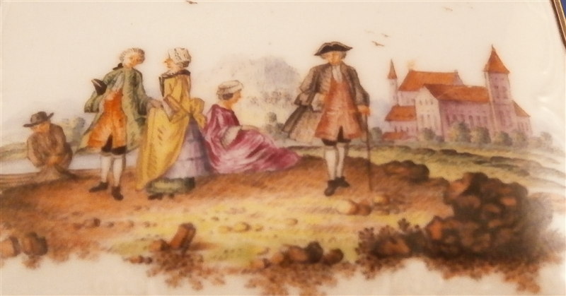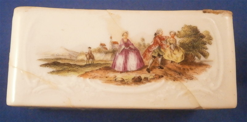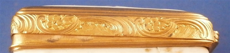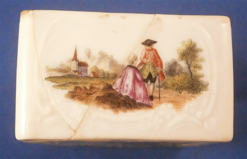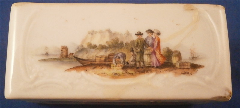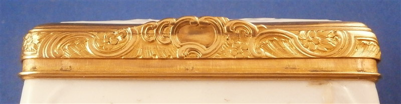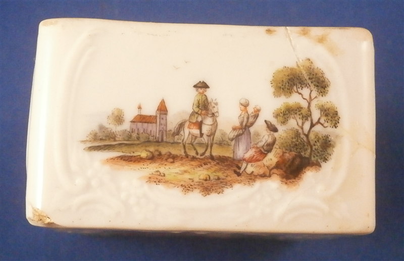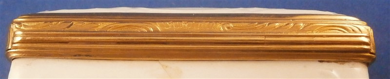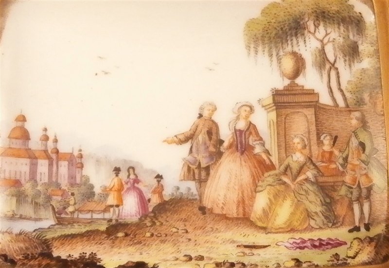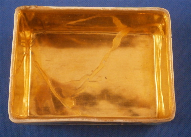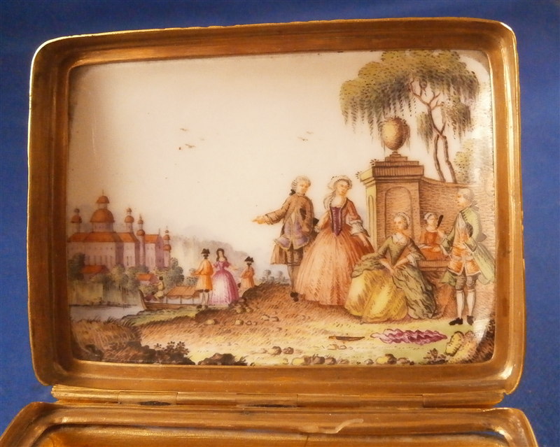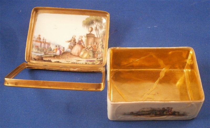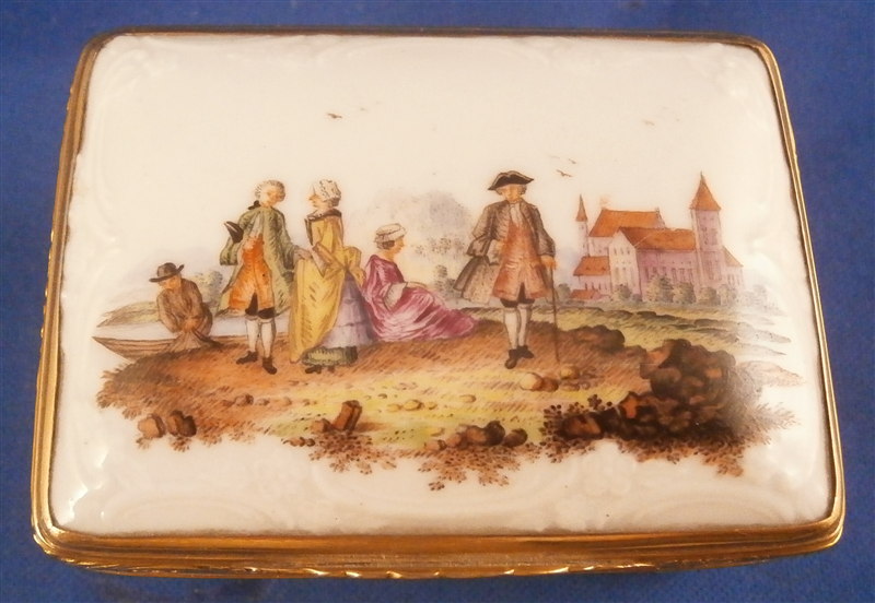 This is a snuff / patch /pill box made by Meissen around 1750. This is a really nice example in terms of the painting. It has seven handpainted nice quality merchant / harbor scenes on it as well as some nice relief scroll work and gilding on the inside. There are large scenes on the top, the inside of the top and the bottom and four smaller scenes on all four sides. The inside part is entirely gilded. The quality of the scenes is very nice but not s good as on my other piece! The mounts on this piece are gold which means it must have been very special even back then since many were just gilded silver and very few were actual gold. The gold mounts are marked as shown with a number 8 or something along those lines. The box is in OK condition - the lid is perfect as are the mounts but sadly the bottom was broken and is reglued something I will probably have improved by my restorer! The gold mounts come off the bottom part easily which is probably how it was damaged. The box is not marked which is normal but the piece speaks for itself. The snuff box is about 1.625 inches tall, 2.625 inches wide and 2 inches deep. The gold mounts are superbly decorated as well as can be seen in the pictures. They work perfectly! Sorry about the lousy pics - am still learning the ins and outs of the new camera! Please email me for more information or other pictures.