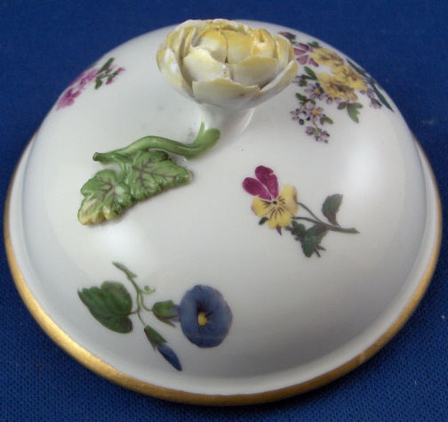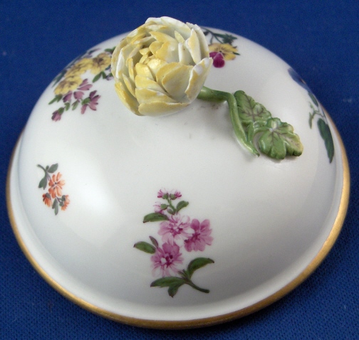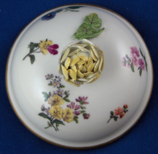 This is a nice early lid made by Meissen in about 1750. It is nicely handpainted with a floral arrangement as well as four flowers scattered all around and a nice gold trim to the bottom edge. Great floral finial to the top with two leaves. The lid is in perfect condition with just a few nibbles to the petals of the floral finial. The lid is 1.625 inches tall including the finial and has a diameter of 3 inches and the footring has a diameter of 2.5 inches. It's not often one just find a lid so this might be the rare chance to give your coffee pot its missing one :) Please email me for more information or other pictures.