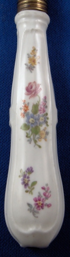 This is a superb and rare knife made by Meissen in about 1750 (well the handle part at least :). The handle is nicely modeled with some raised detail and then handpainted with a floral arrangement on the front and back along with lots of smaller scattered flowers. The ferrule between the handle and the blade has a nice circular design to it and is likely made of silver though it is unmarked. The blade is of early steel and marked with a star mark as well as another impressed mark I cannot make out. The blade goes into the handle and there is a spot coming out on the other end to fasten it in place which was only done on early knives! The knife is in superb condition! It is 8.125 inches long of which 3.25 are from the porcelain handle. The handle is about 0.75 inches wide. It is not marked where one could see it though it is definitely made by them and by the colors and style one can see it is from about 1750. Please email me for more information or other pictures.