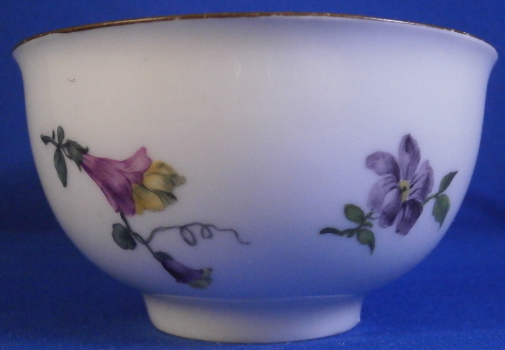 This is an early teabowl shaped cup (aka Koeppchen ) and saucer made by Meissen in about 1750. Both pieces are hand painted with superb floral arrangements as well as three single flowers in the early Deutsche Blumen style. The colors and details of this early style are really nice. Much nicer than later ones. Both pieces have a brown trim to the rim. The set is in great condition with just a little wear - a couple of spots of the brown edge trim on the cup as well as to the flowers of the saucer - mainly the blue one which has some white spots from wear which were colored in slightly to hide them but not all that well. Could be improved upon! No chips, cracks, restorations, etc. The saucer is about 1.125 inches tall and 5.25 inches in diameter. The cup is 1.75 inch tall and 3.125 inches in diameter. Both pieces are marked with the under glaze blue crossed swords mark as well as an impressed number as shown. Please email me for more information or other pictures.