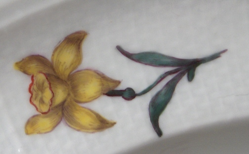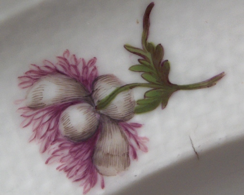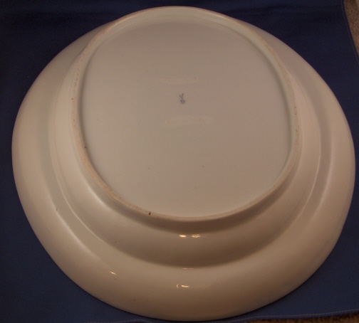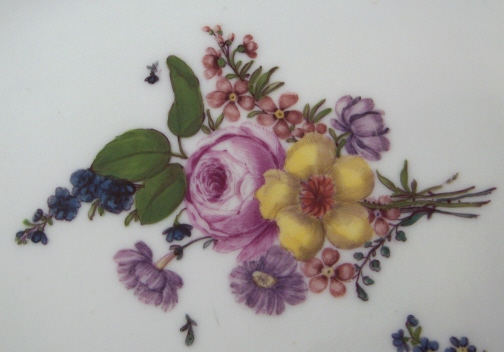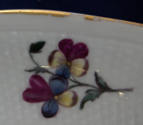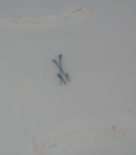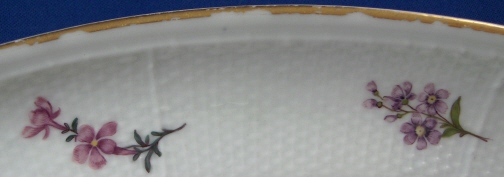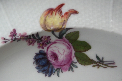 This is an early serving platter made by Meissen in about 1750. It has a nice oval shape with a basket weave relief rim design and has two large floral arrangements and lots of scattered smaller flowers handpainted on it. Gold trim to the edge. The flwoers are still influenced by the woodcut style but not quite yet the Deutsche Blumen style so that dates the piece around 1740 to about 1750. My favorite flower of all time and one that was really only used early on is the Lily of the Valley to the right side. The dish is marked with the straight blue crossed swords underneath between two ground down firing supports. The piece is in superb condition with almost no wear except to the gold trim. There are some firing flaws like a small firing crack and the piece not being perfectly flat but that is normal on these peices and all part of the charm! The platter is 1.75 inches tall, 14.5 inches wide and 12.125 inches deep. Please email me for more information or other pictures.