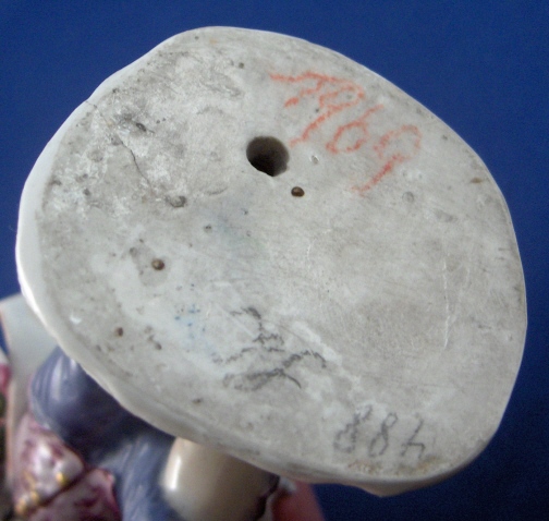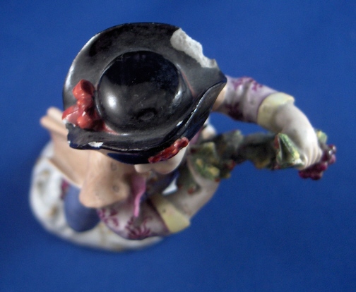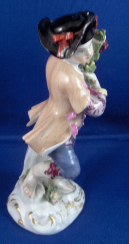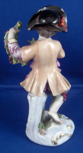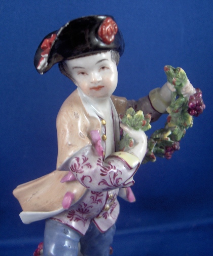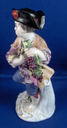 This is a figurine of boy holding a grape vine made by Meissen in about 1750. He is wearing a black hat with a red flower and bow on it, a light puce shirt with darker puce flowers on it, a tan jacket and blue pants. Lots of nice detail as one would expect from a Meissen figurine like the small gold buttons on the shirt. The figurine is in great condition for the age with some expected chips here and there. The hat has a larger chip to the back edge and two smaller ones in the front. One end of the bow is missing. There are a few spots here and there where the paint didn't take with the glaze but that is normal on the early pieces and none are bad. Two chips to leaves on the vine but they are hard to spot, a chip to the edge of the jacket, two chips to ends of the pink strings hanging off his jacket to tie it shut and that is it. The descriptions sounds much worse than it looks so have a peak at the pictures. The bottom of the base is flat and filled with only the air hole in it. There are some remnants of the blue crossed swords underneath but they are almost totally gone now. The figure is 4.875 inches tall, 2 inches wide and 1.75 inches deep. Please email me for more information or other pictures.