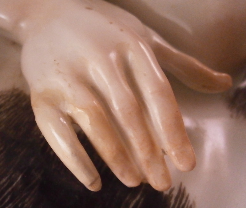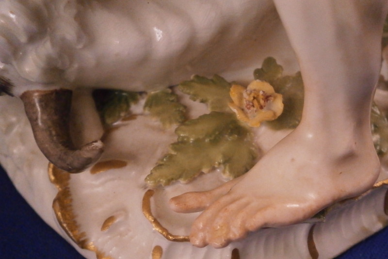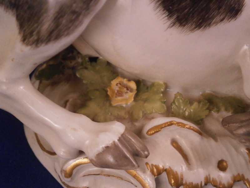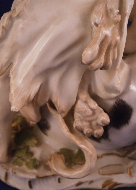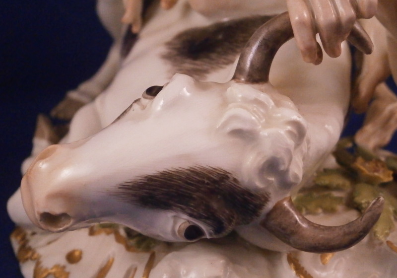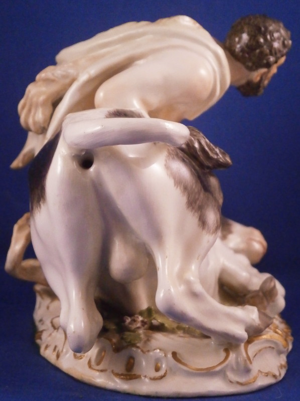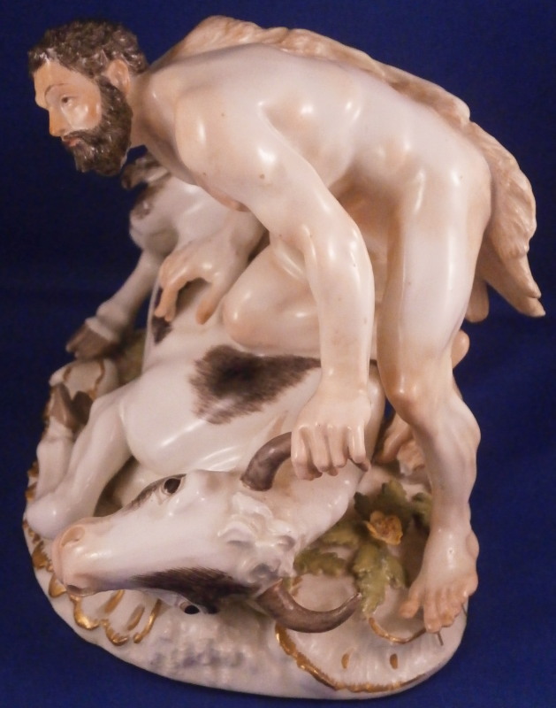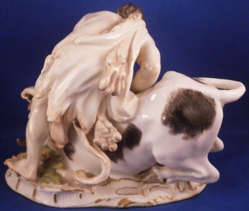 This is a wonderful figure of Hercules and a bull made by Meissen in the mid 18th century. I have seen this group called Hercules and the Caledonian bull Achelous but also Hercules and the Minotaur though I think the former is more fitting and correct. Either way the figurine is of Hercules wrestling a bull to the ground. A rally nice figurine that is very well modeled and perfectly hand painted plus the subject is nice as well. The base has some scroll work all around highlighted with gilding and some greenery and two flowers to finish it off. Hercules is wearing the lion skin which has the paws and tail in the back. Just a stunning figurine that is painted perfectly I think - less colorful than many of their peices which I think makes it perfect for display anywhere! The figurine is in great condition with just the tail of the lion having been reglued but that is not obvious at all even when seen from the back side and the pinky of his right hand has been restored but the piece displays perfectly! The figure is marked underneath with the under glaze blue crossed swords mark as well as the impressed model number as shown. It is about 5.125 inches tall, 6.5 inches wide and 4.75 inches deep. Please email me for more information or other pictures.