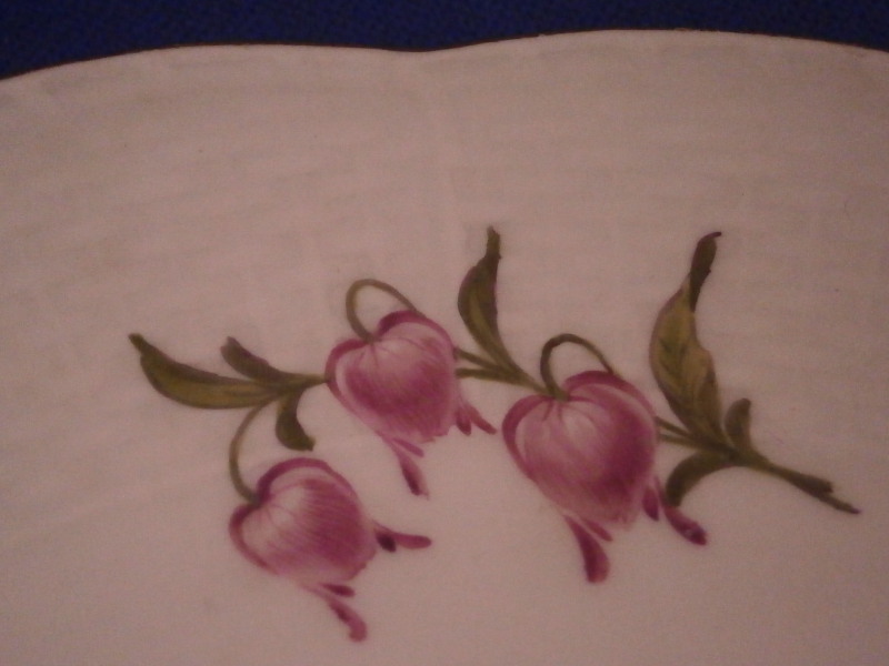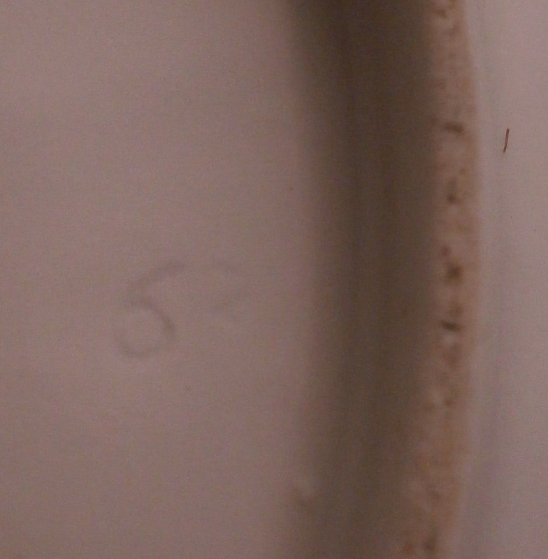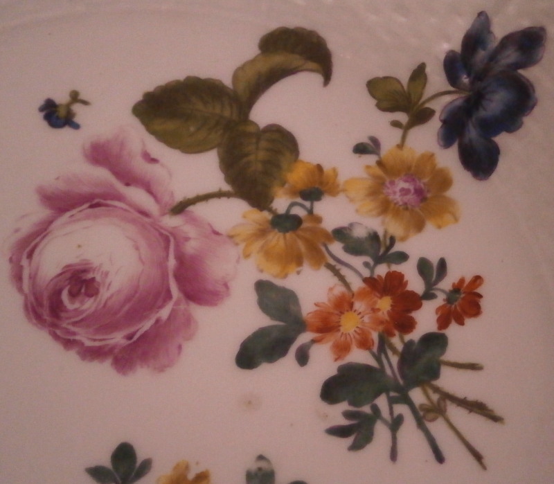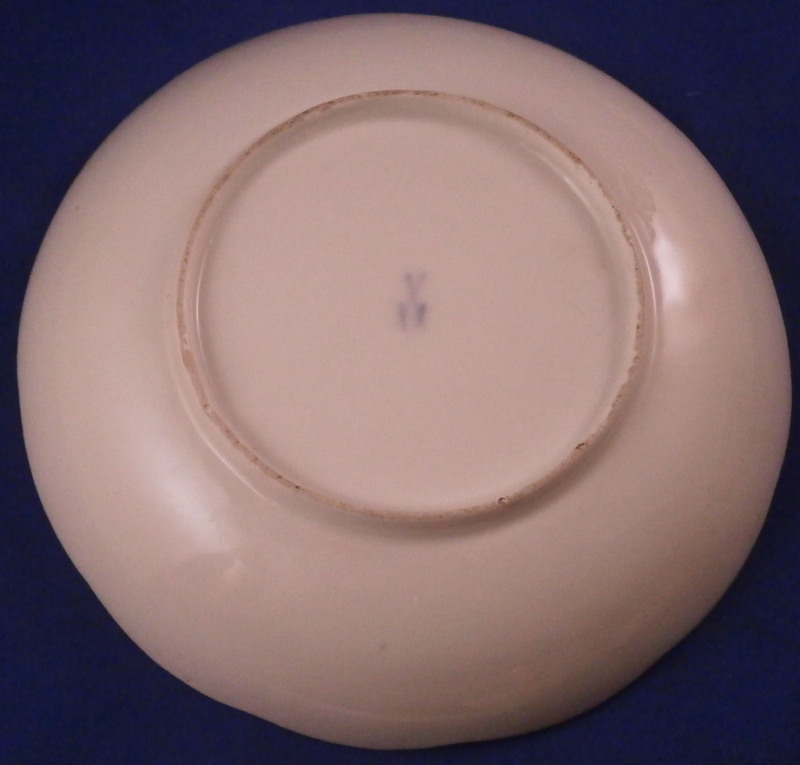 This is a nice saucer made by Meissen in the mid 18th century. The piece has a basket weave design in relief to the paste along the rim, a gold trim to the edge and is hand painted with a large floral arrangement towards the right side of the center with three smaller flowers and three tiny ones scattered throughout. The saucer is in great condition with a few black firing spots ground away when it was made and these unglazed spots have stained a bit over time. Can be cleaned but it displays well as is and it's all part of the charm of the early stuff for me at least. The saucer is about 1 inch tall and 5.5 inches in diameter and is marked with the under glaze blue crossed swords mark as shown as well as an impressed number. Please email me for more information.