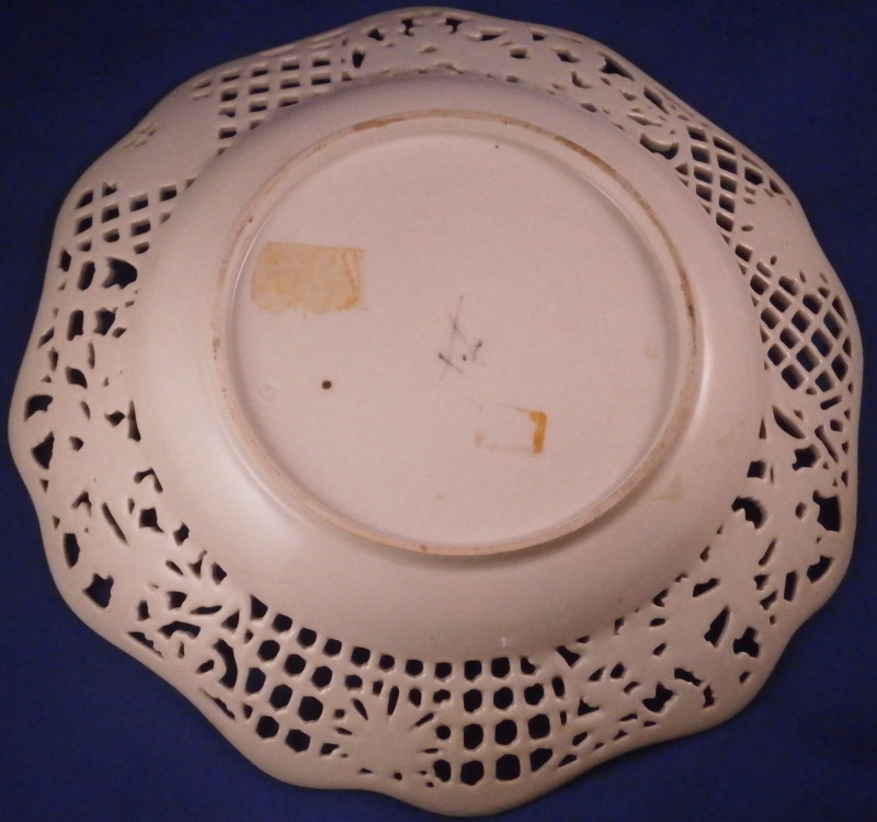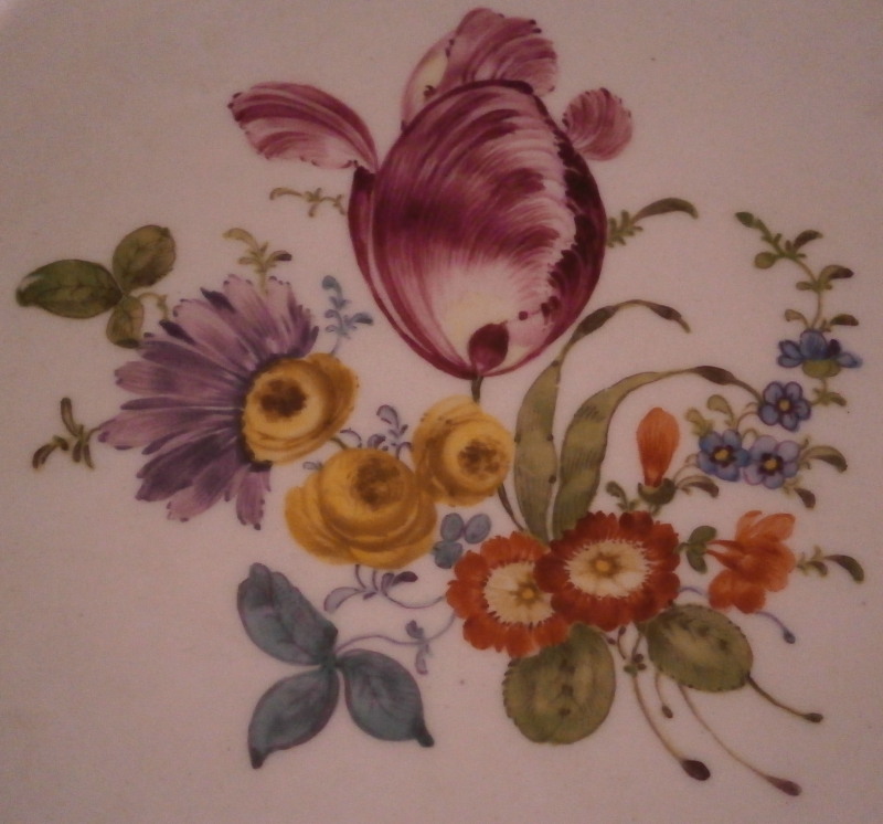 This is a superb plate made by Meissen in the 18th century around 1760. It is not often that one sees a plate with this design from the 18th century - more common are the newer examples which are still quite stunning! The plate has a reticulated rim design called Brühlsches Allerei. It has a large hand painted floral arrangement in the center as well as two smaller flowers and a very fancy reticulated rim. Brown trim to the edge. Each reticulated area is different with three that are more plain and three more that are in the shape of a floral arrangement. The Bruehlsches Allerlei design is one of the nicest rim designs one can own by Meissen - it was originally made for Count von Bruehl hence the name. The plate is in superb condition which is always a bonus. Just a touch of stacking wear to the white area of the well but it displays perfectly! It is marked with the underglaze blue crossed swords mark with the dot between the bottom ends which dates to around 1760 and the usual impressed numbers one finds on Meissen of this period. The plate is 1.625 inches tall and 9.75 inches in diameter. Please email me for more information or other pictures.