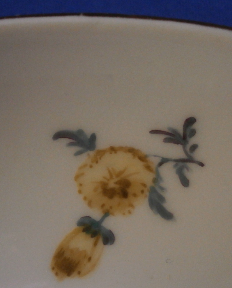 This is a saucer made by Meissen in about 1765. It is nicely hand painted with one larger floral arrangement on one side as well as three single flwoers to fill in the rest of the space, Brown trim to the edge. A fairly simple design for them but still quite nice. The saucer is marked with the under glaze blue crossed swords mark with the dots between the bottom parts underneath as well as a number impressed by the foot ring as shown. The piece displays nicely but does ahve a large chip to mostly the outside edge as shown. Your can see it from the outside edge but mostly it is hidden when on display. There is also a glaze skip near the same area that can been seen in the same pictures. The saucer is 1.125 inches tall and just over 5.25 inches in diameter. Please email me for more information or other pictures.