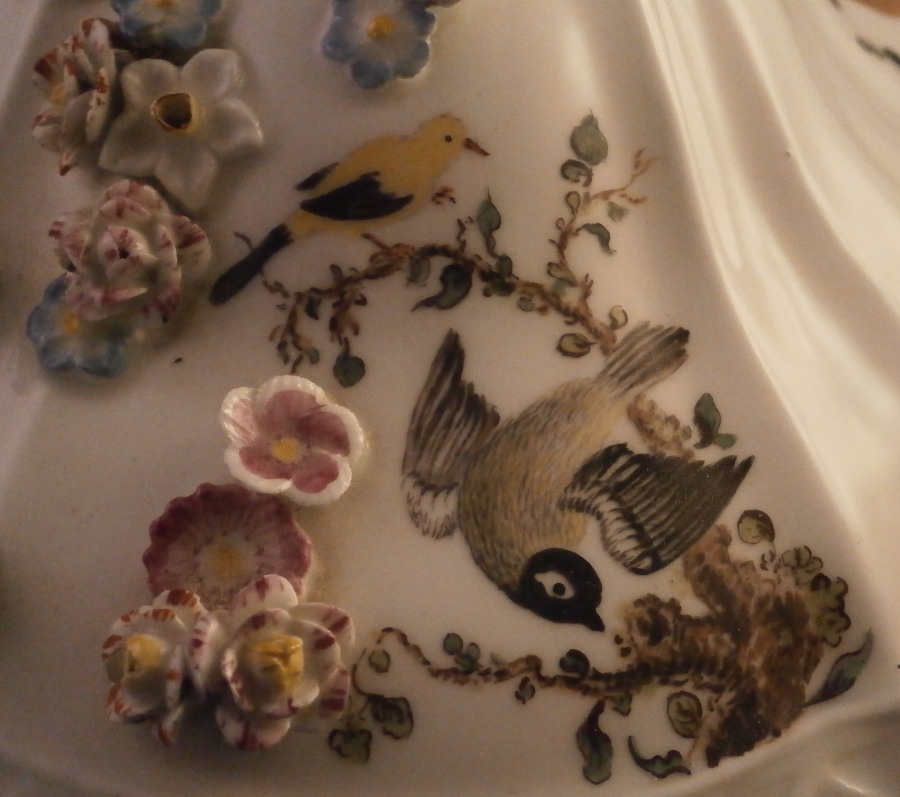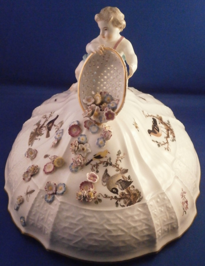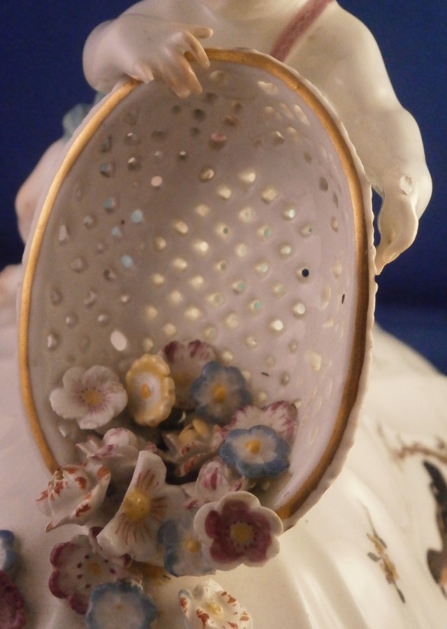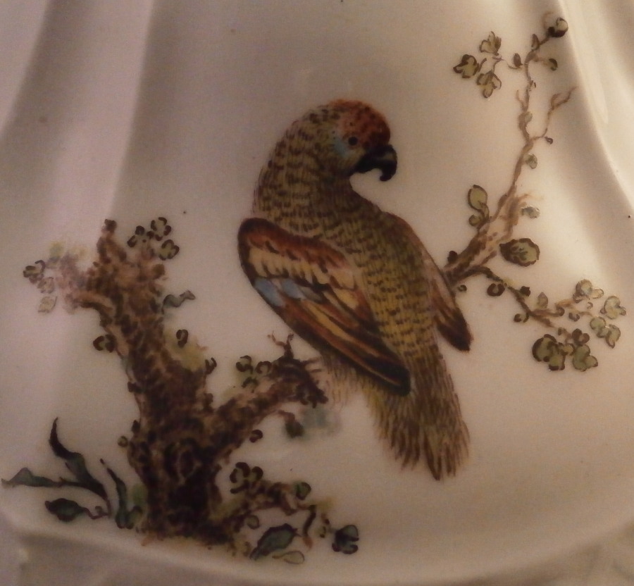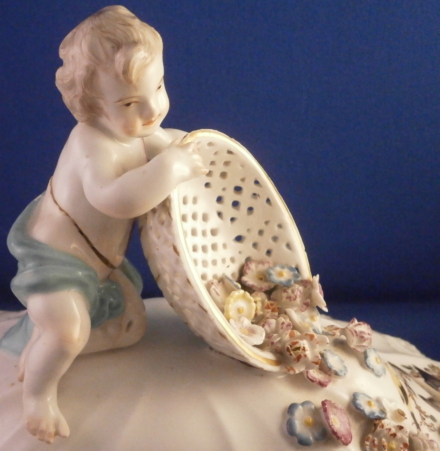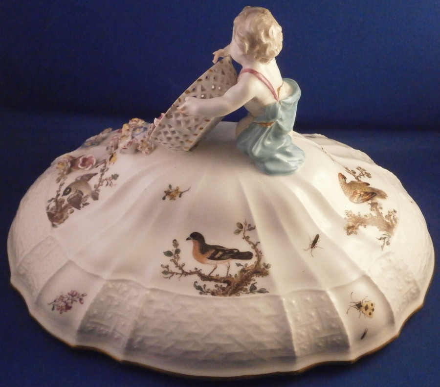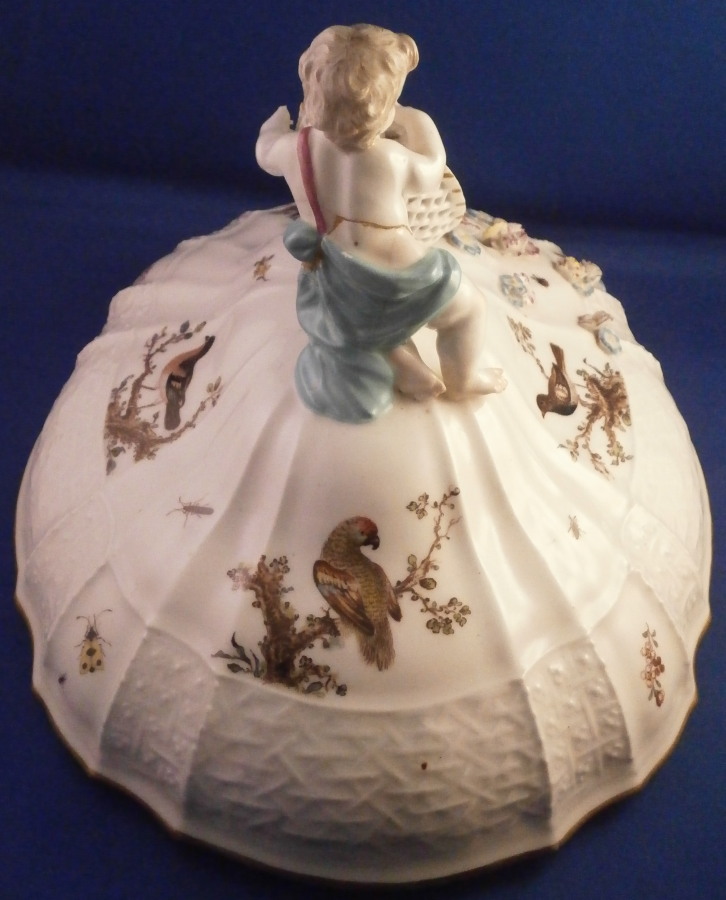 This is a rare tureen lid made by Meissen around 1750. It is superbly hand painted with four really nice bird scenes including a single bird sitting on a tree branch - my favorite being the parrot! There are a few tiny bugs in between as well as two single flowers and three bugs along the edge in panels between some nice relief design along the rim. The best part however is the figural finial of a putto holding a reticulated basket filled with flowers tumbling out and down the side of the lid. Just superb and these early pieces are hard to find. Sadly I do not have the bottom part of the tureen and the putto has been broken off with the basket at some point and crudley reglued. Oddly enough the basket has survived whole even though it broke of the lid. A bit of luck was invovled there! Still a stunning piece to display by itself or if you ahve a really damaged lid for a tureen or even just the bottom of the tureen her is your chance to make it more complete again! The lid is about 7 inches tall, 8.75 inches deep and 11 inches long so rather large and also quite heavy. Please email me for more information or other pictures.