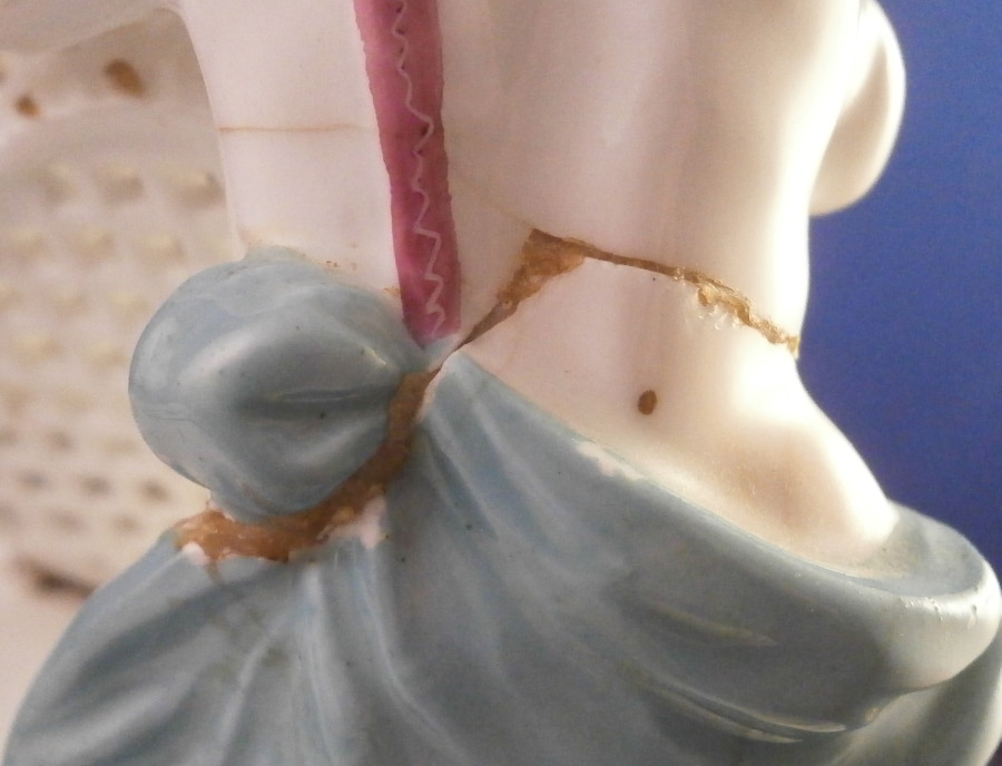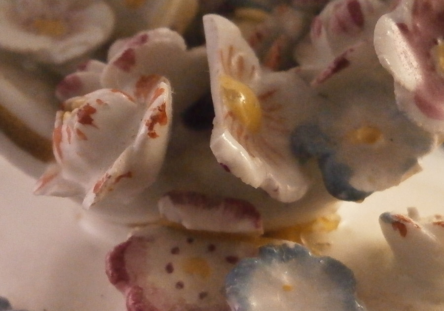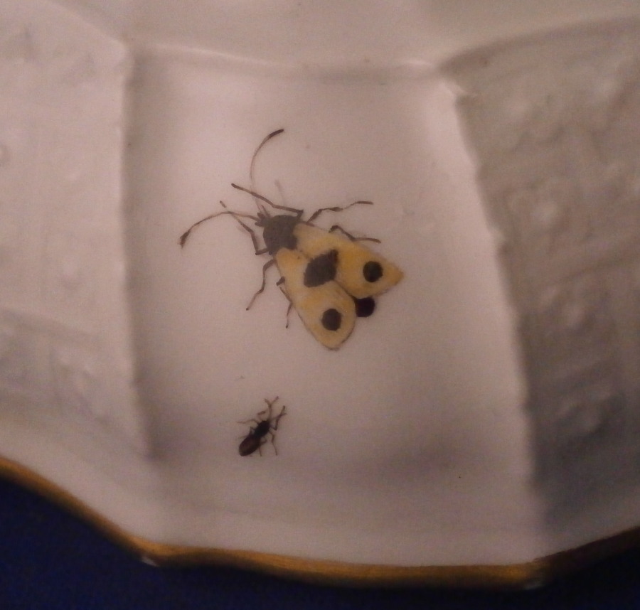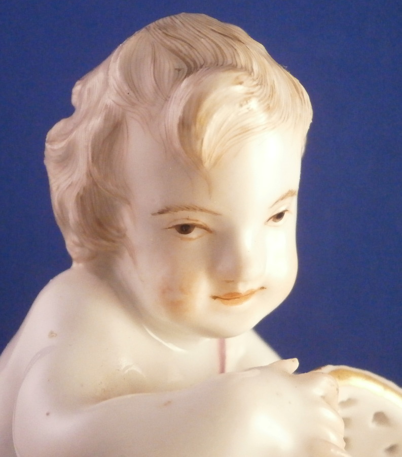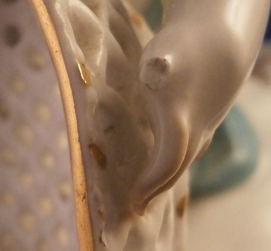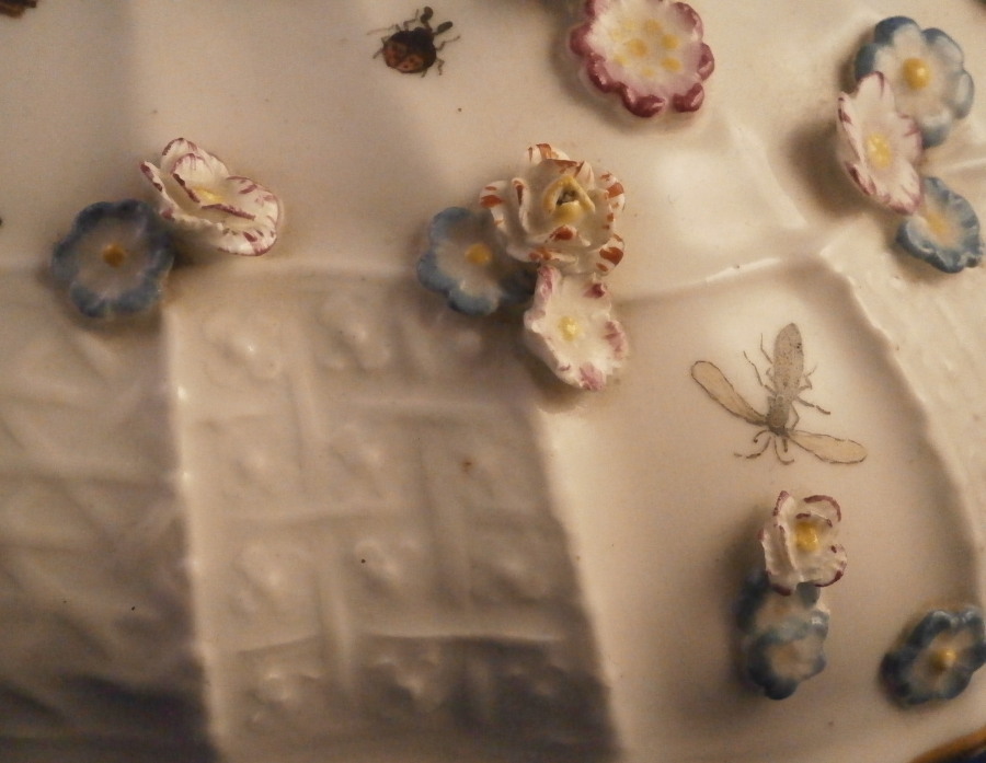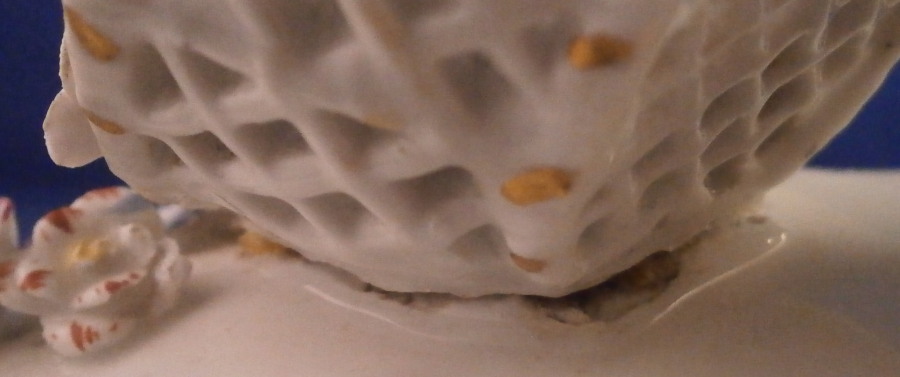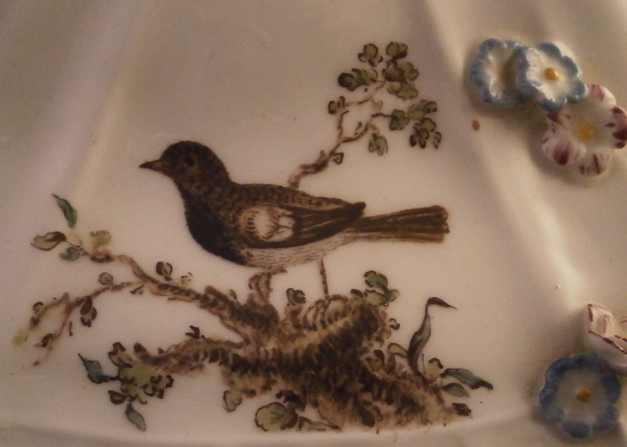 This is a rare tureen lid made by Meissen around 1750. It is superbly hand painted with four really nice bird scenes including a single bird sitting on a tree branch - my favorite being the parrot! There are a few tiny bugs in between as well as two single flowers and three bugs along the edge in panels between some nice relief design along the rim. The best part however is the figural finial of a putto holding a reticulated basket filled with flowers tumbling out and down the side of the lid. Just superb and these early pieces are hard to find. Sadly I do not have the bottom part of the tureen and the putto has been broken off with the basket at some point and crudley reglued. Oddly enough the basket has survived whole even though it broke of the lid. A bit of luck was invovled there! Still a stunning piece to display by itself or if you ahve a really damaged lid for a tureen or even just the bottom of the tureen her is your chance to make it more complete again! The lid is about 7 inches tall, 8.75 inches deep and 11 inches long so rather large and also quite heavy. Please email me for more information or other pictures.