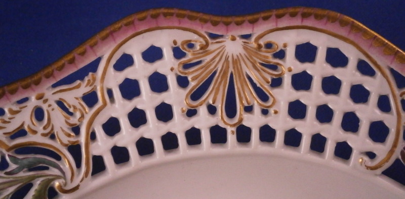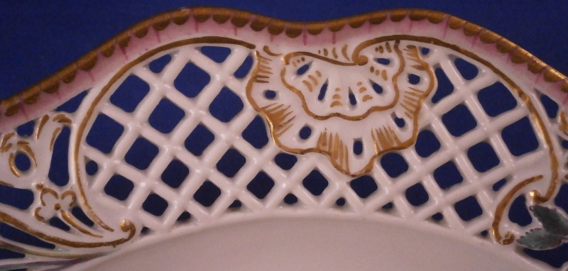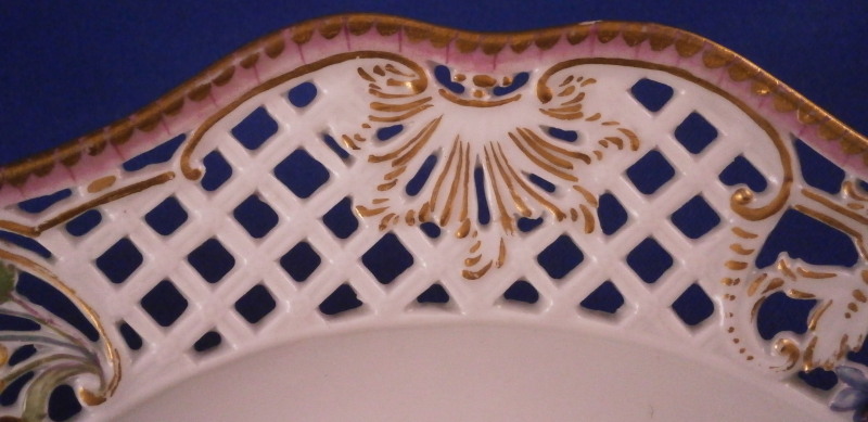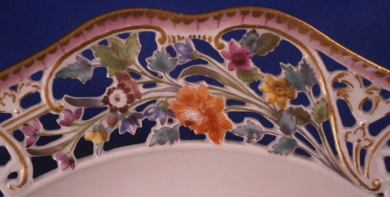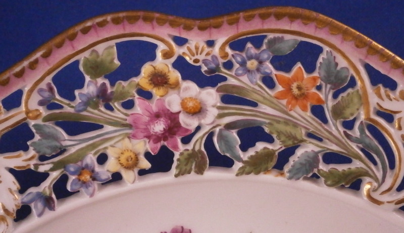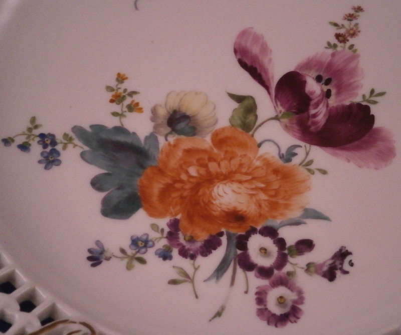 This is a superb plate made by Meissen in the mid 18th century. It is not often that one sees a plate with this design from the 18th century - more common are the newer examples which are still quite stunning! The plate has a rim design called Brühlsches Allerei which includes a large hand painted floral arrangement in the center as well as a small single flower and a very fancy reticulated rim with lots of flowers and gold highlights. Each reticulated area is different with three that are more plain with just a touch of gilding and three more that are in the shape of a floral arrangement with each flower hand painted perfectly! The Bruehlsches Allerlei design is one of the nicest rim designs one can own by Meissen - it was originally made for Count von Bruehl . The edge has a purple ground color to it which is a bit unusual and a nice touch! The plate is in superb condition which is always a bonus. Just a touch of wear to the gilding (very minor!) and a bit of stacking wear which does not distract either. Is is marked with the under glaze blue crossed swords mark with the dot between the bottom ends which dates to around 1760 and the usual impressed marks,etc. one finds on Meissen of this period. The plate is 1.625 inches tall and 10.125 inches in diameter which is a very nice size. Please email me for more information or other pictures.