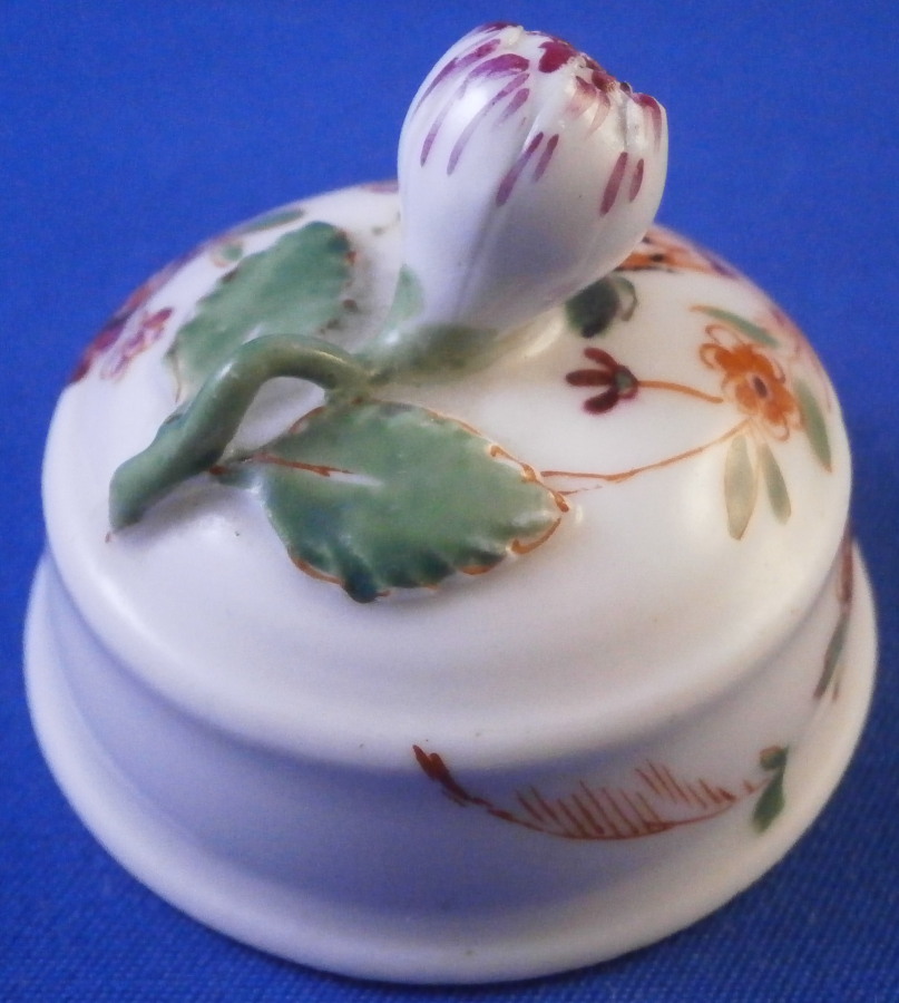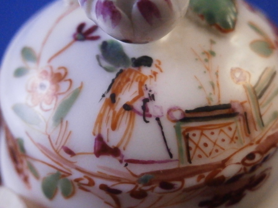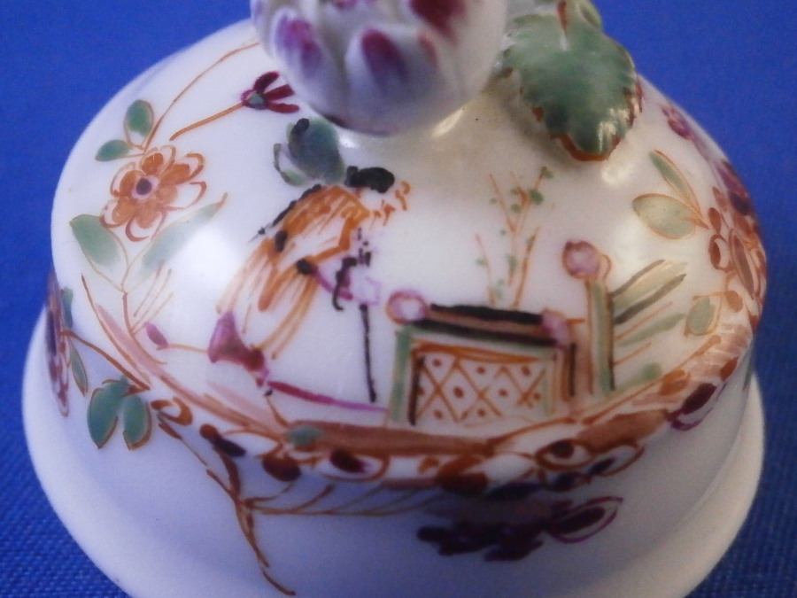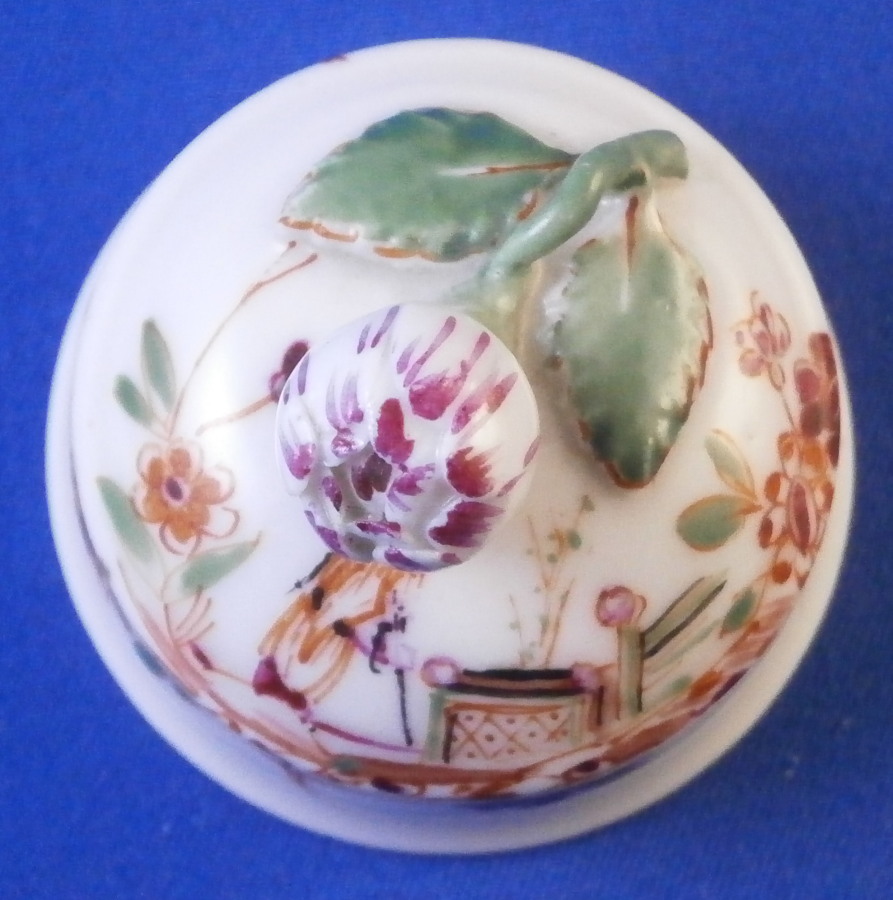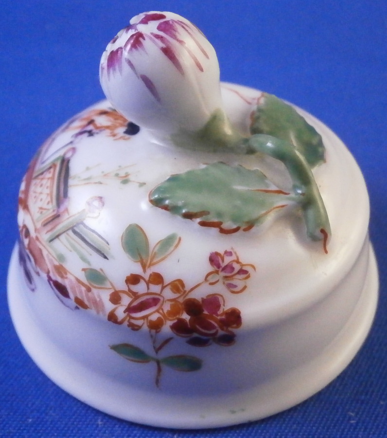 This is a tea caddy / jar lid made by Meissen in the 18th century - pre 1740. It's a very early lid that is hand painted with a Chinoiserie type design in the manner of Johann Ehrenfried Stadler with a nice floral finial including a flower bud and two leaves connected with a stem. The scene has a little Asian figure near a table with some Indian (Indianische Blumen) type flowers to either side. The lid is in perfect condition! Unmarked which is typical for lids but there is not doubt it is by Meissen from the 18th century. The quality gives it away easily. The piece 1.25 inches tall and 1.625 inches in diameter. The inner diameter of the inside that would sit on top of the opening is a bit under 1.375 inches. Please email me for more information or other pictures.