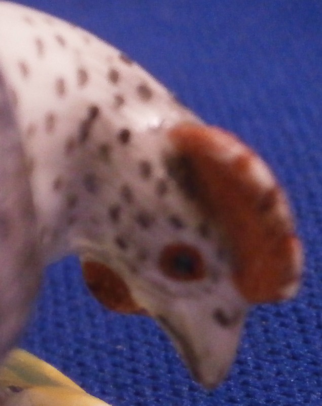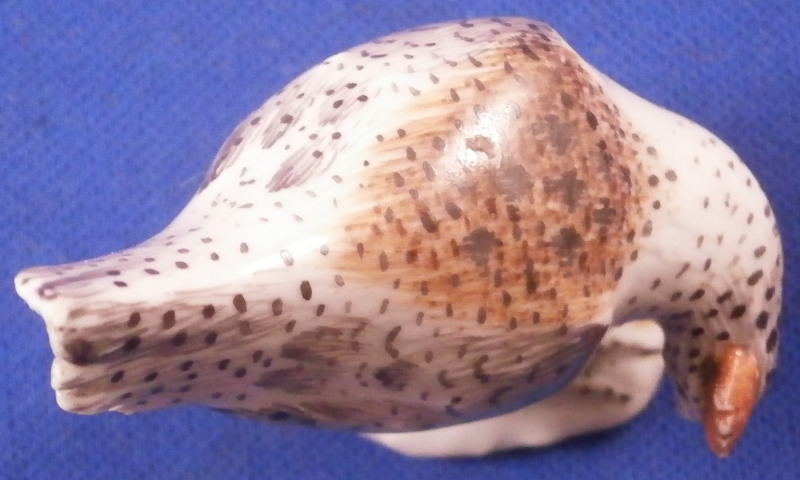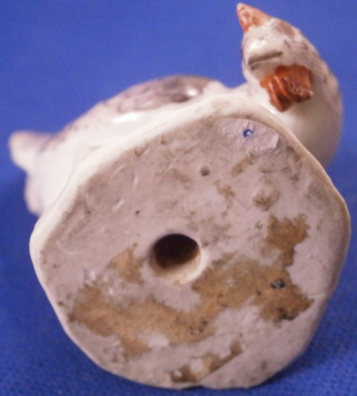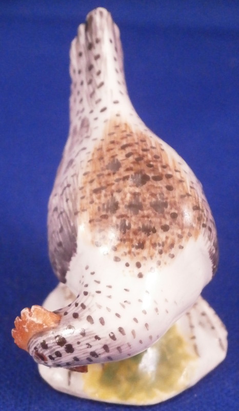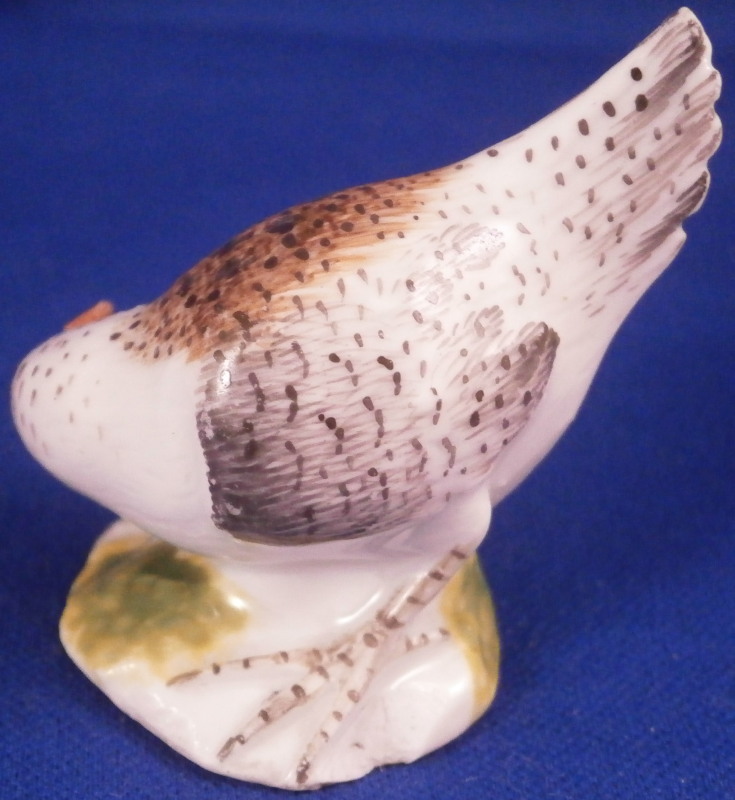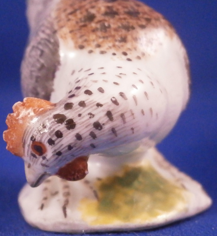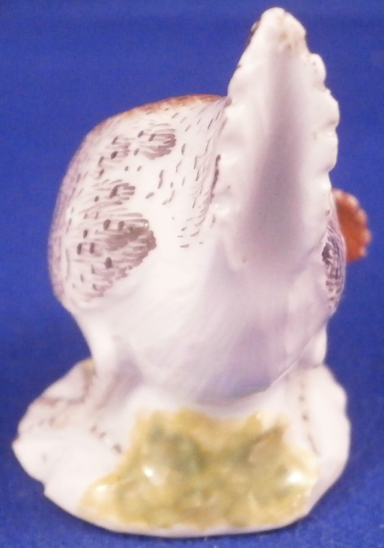 This is a rare original period miniature female chicken aka hen figurine made by Meissen in the mid 18th century. A rare treat that is superbly modeled and hand painted to perfection with lots of detail. She is standing on a little base painted with some grass. The figure is in good condition with on chip to the back of the base by her left foot. Harrd to see and the piece displays perfectly. It is not marked underneath which is not unusual for these early miniatures but the quality leaves no doubt as to the maker and the underside is typical as well. The bird is 1.625 inches tall, 1.125 inches wide and 1.5 inches long. Please email me for more information or other pictures.