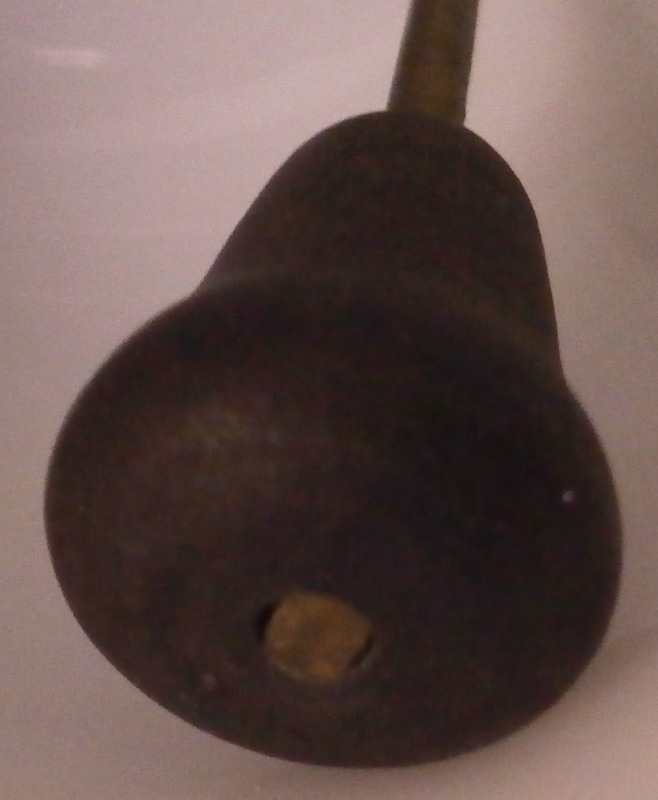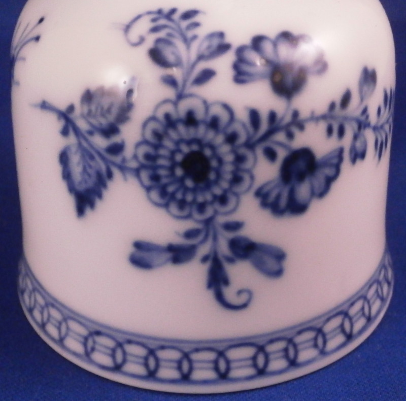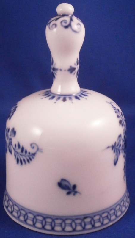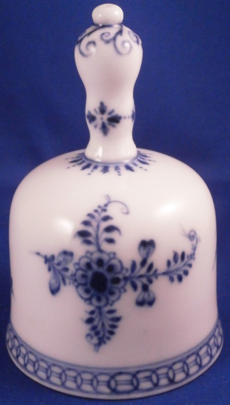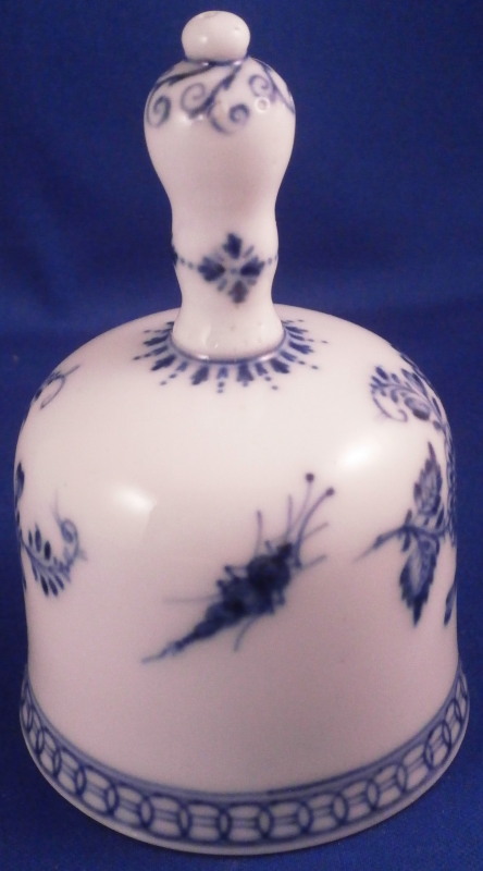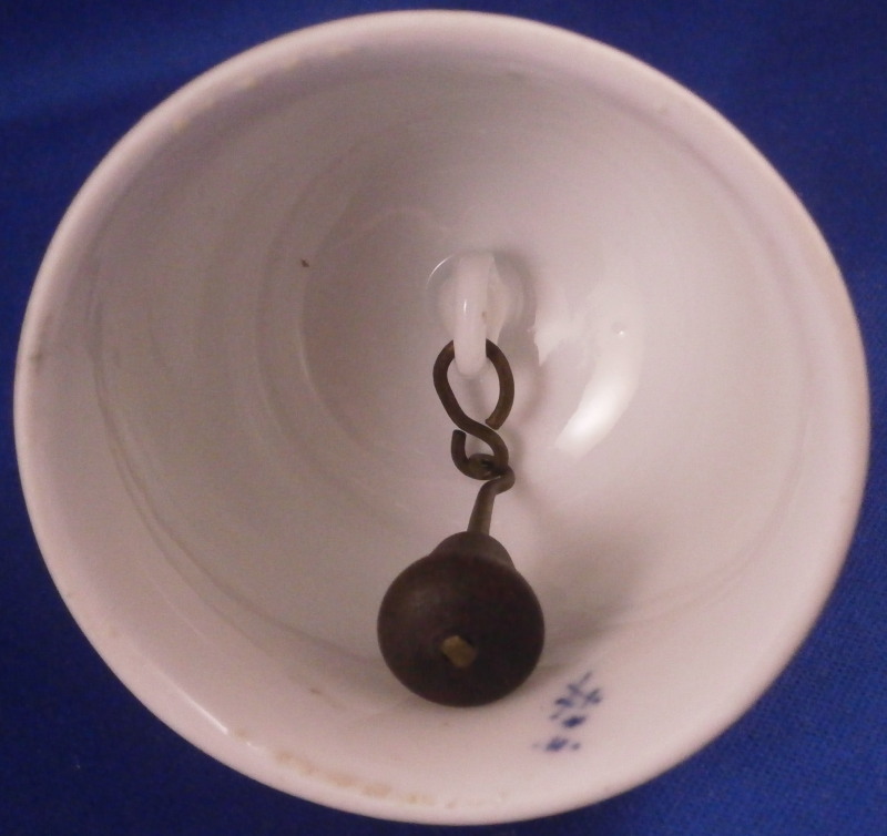 This is a rare bell made by Meissen in the 18th century. I think this is not the Marcolini mark but the one used early in the 18th century but either way it is a nice early bell and not something one sees often at all. The piece is hand painted with the under glaze blue strawflower design including two floral designs, one bug and a small flower as well as some nice blue trim to the handle and along the bottom edge. Really a fun piece! The bell is in superb condition with no real flaws except for those done when it was first made. There is a small glaze pop on the top of the handle and some impurities along the inside edge as shown where something like sand stuck to it during the firing process. The handle has a tiny hole in the top as shown. The inside is marked with the under glaze blue crossed swords with a star below as well as a blue painter's mark. The clapper is made of wood with brass metal attaching it to the liitle porcelain ring on the top of the inside as shown. The bell is 4.125 inches tall and 2.75 inches in diameter. Please email me for more information or other pictures.
