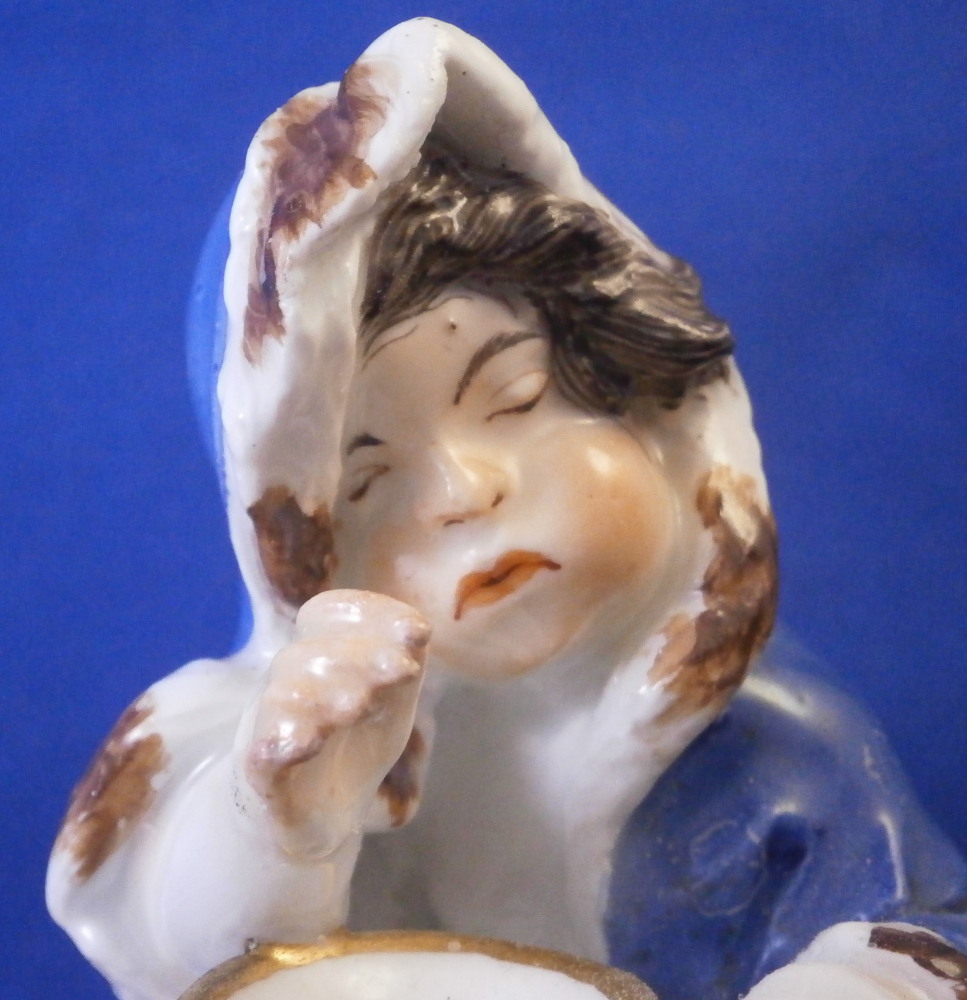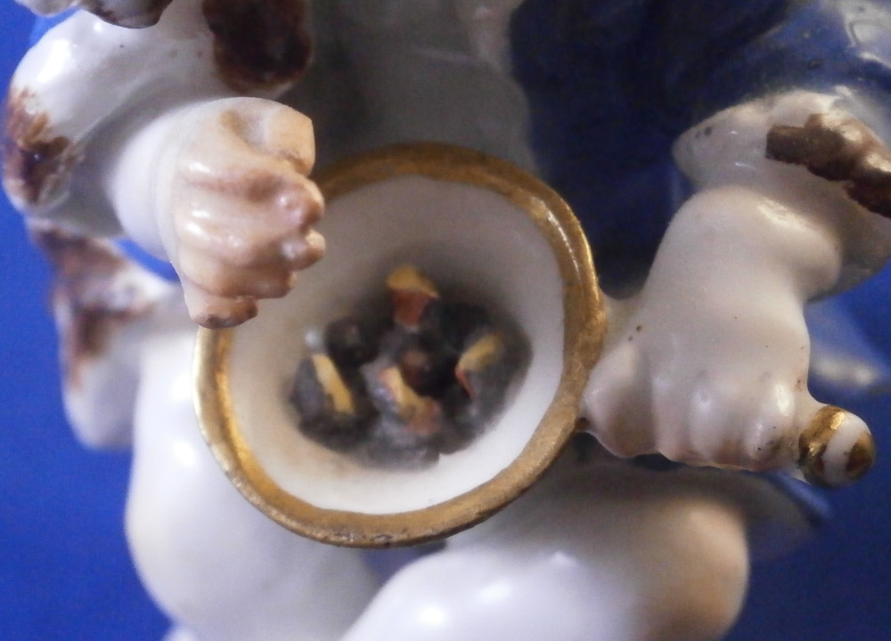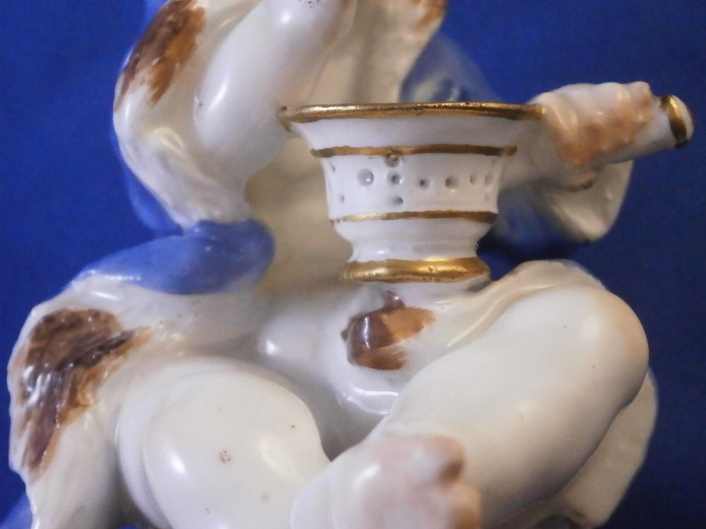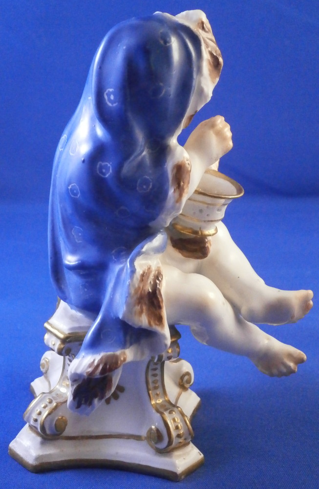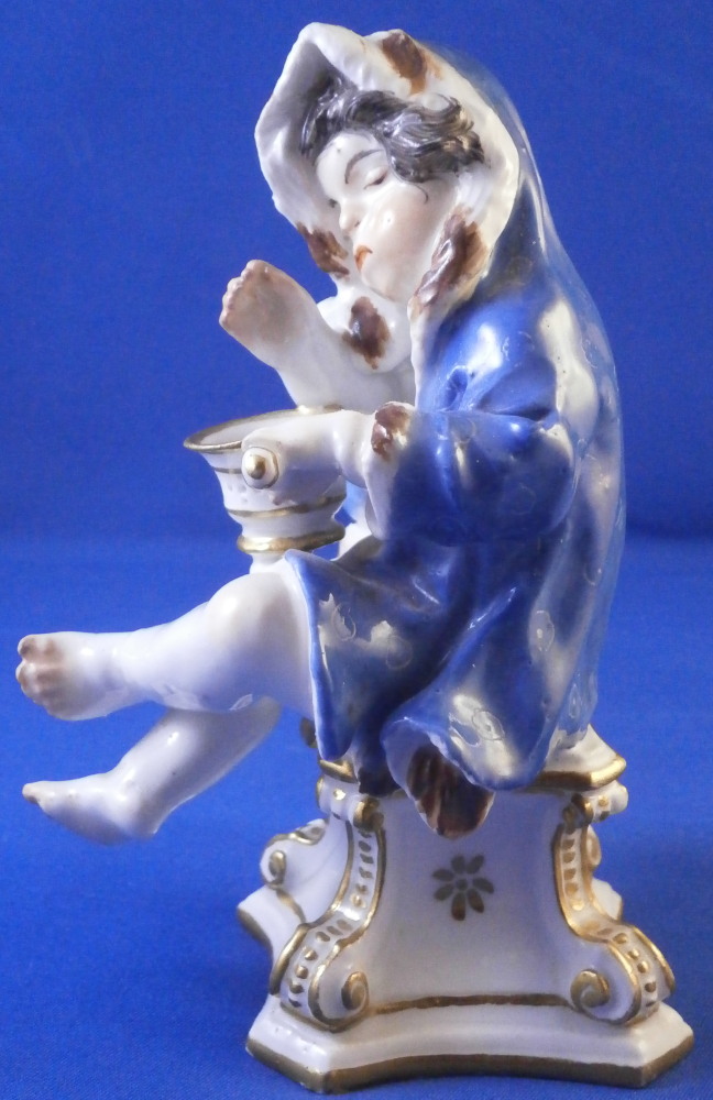 This is one figurine of a the series of four seasons made by Meissen in about 1750. This one here represents winter (obviously) and is of a putto covered in a superb blue cloth with fur lining sitting on a nice base while holding a lit coal warmer in its lap. A superbly modeled piece that is hand painted to perfection. A really nice early example! These early pieces are really getting hard to find! It is in great condition with some minor firing faults in the shape of tiny specs or tiny glaze skips normal to these very early figures and the back left bottom corner of the base has been restored fairly well. There are two very minor chips to the very bottom edge as shown. The piece displays perfectly and looks amazing! The bottom is flat and filled with only the air hole in it typical of the earliest figurines. Not marked since it would have been underneath and since it is unglazed it just kind of doesn't make it most of the time. The quality and look are easy to identify it as a nice early Meissen figure! The piece is 4.75 inches tall, 2.5 inches wide and 3.25 inches deep. Please email me for more information or other pictures.