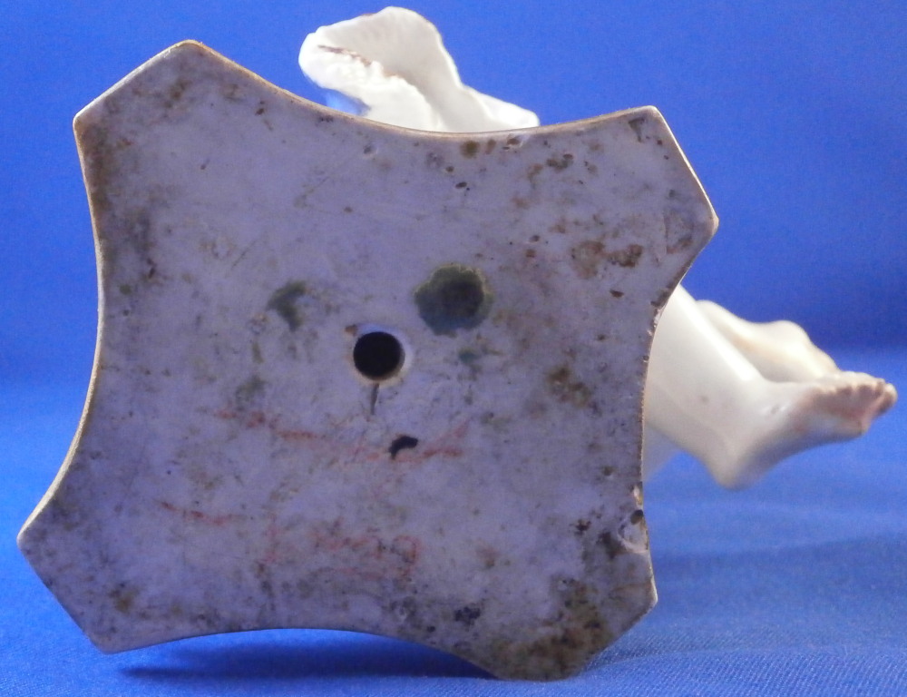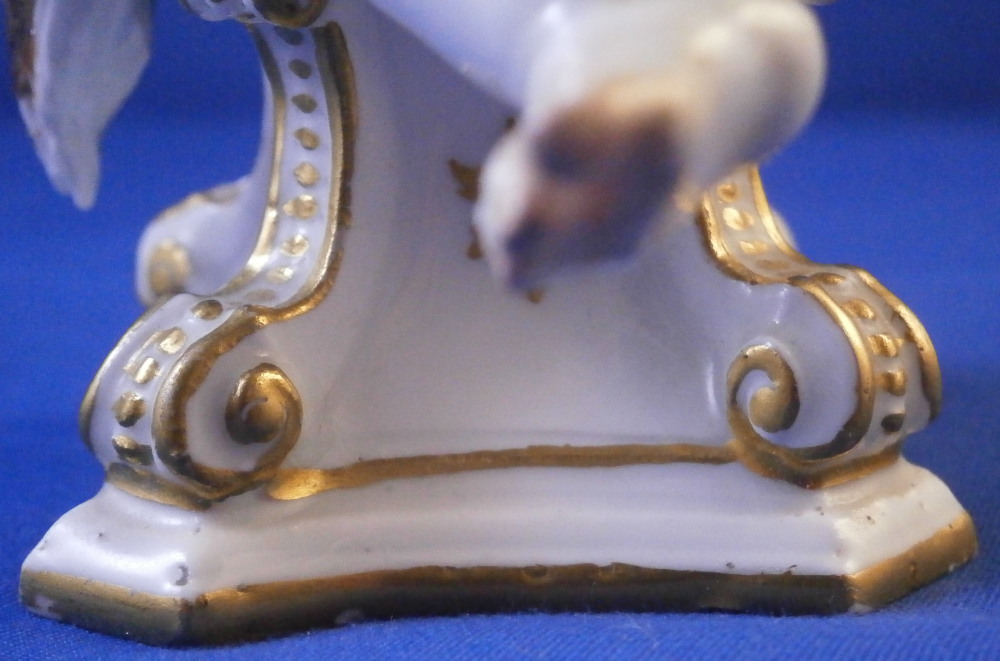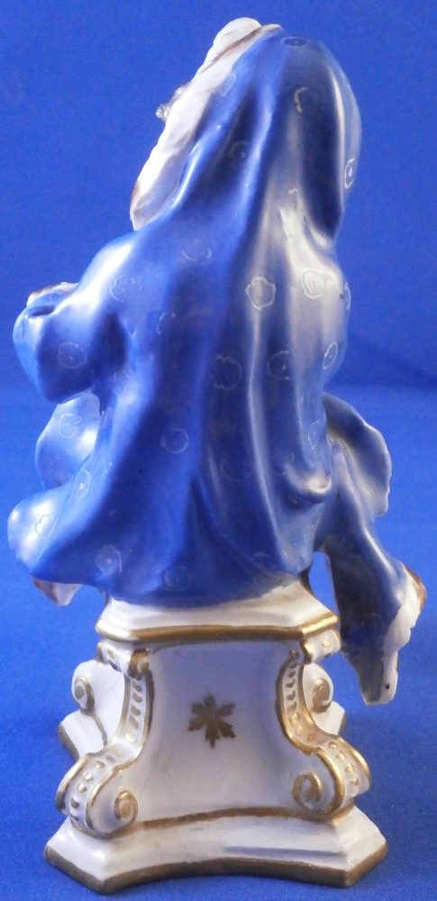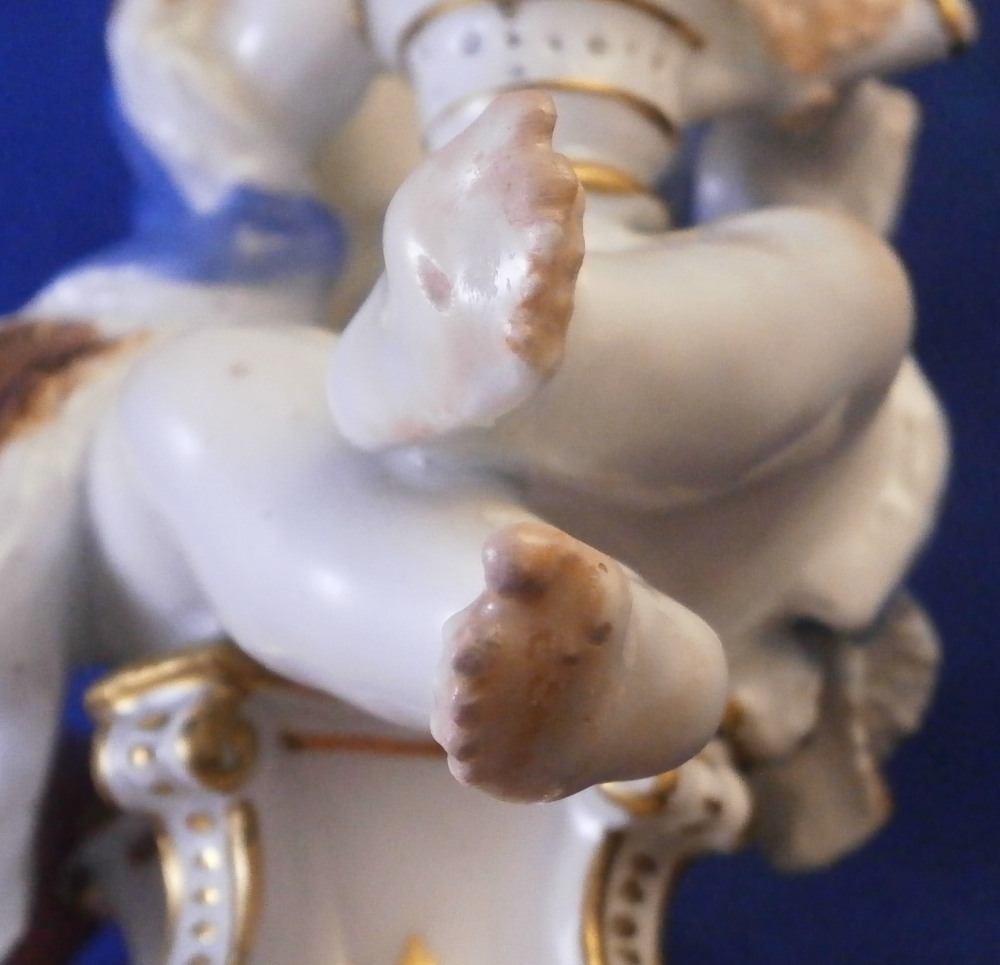 This is one figurine of a the series of four seasons made by Meissen in about 1750. This one here represents winter (obviously) and is of a putto covered in a superb blue cloth with fur lining sitting on a nice base while holding a lit coal warmer in its lap. A superbly modeled piece that is hand painted to perfection. A really nice early example! These early pieces are really getting hard to find! It is in great condition with some minor firing faults in the shape of tiny specs or tiny glaze skips normal to these very early figures and the back left bottom corner of the base has been restored fairly well. There are two very minor chips to the very bottom edge as shown. The piece displays perfectly and looks amazing! The bottom is flat and filled with only the air hole in it typical of the earliest figurines. Not marked since it would have been underneath and since it is unglazed it just kind of doesn't make it most of the time. The quality and look are easy to identify it as a nice early Meissen figure! The piece is 4.75 inches tall, 2.5 inches wide and 3.25 inches deep. Please email me for more information or other pictures.
