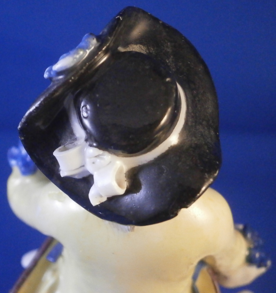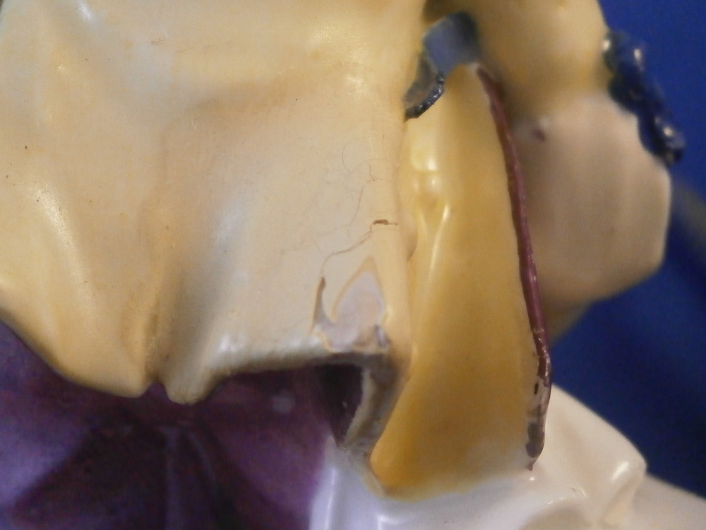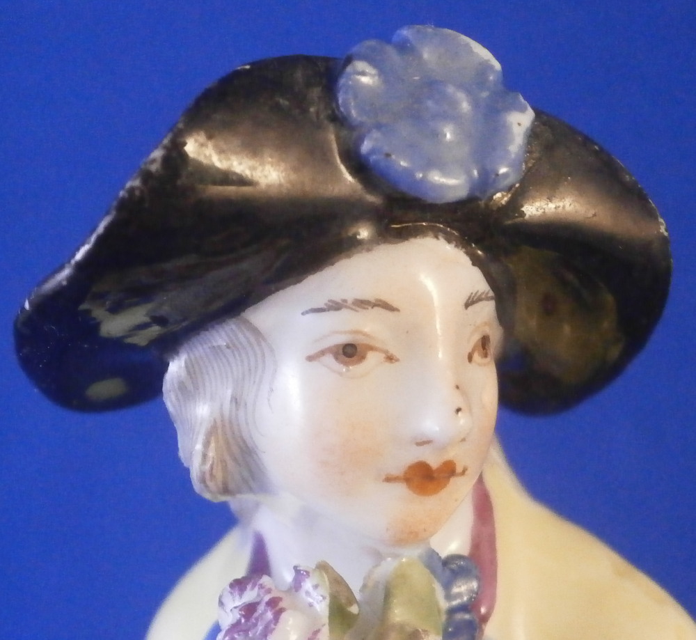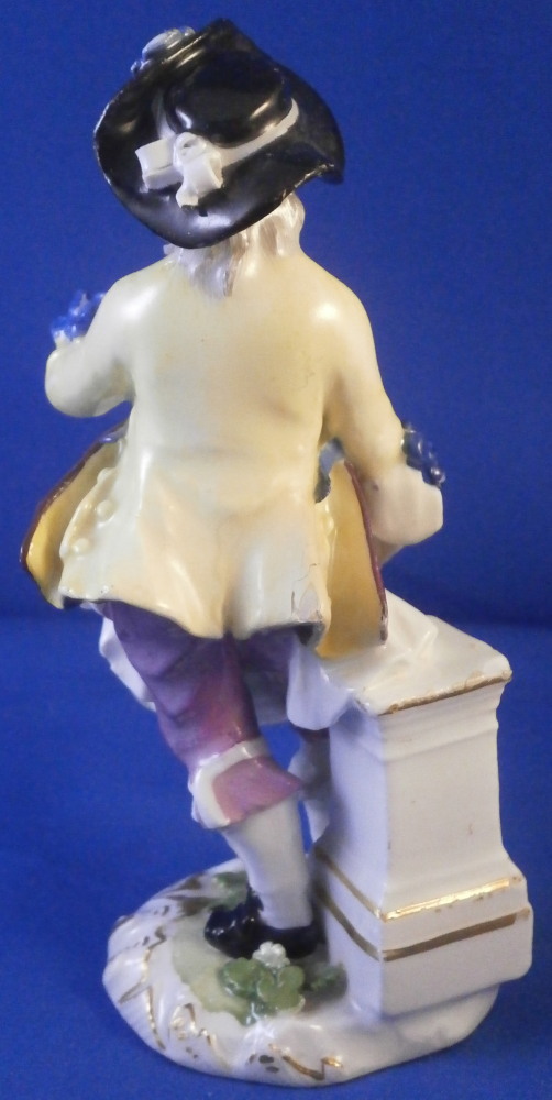 This is a nice early figurine made by Meissen in about 1750. It is a figure of a gentleman holding a bunch of flowers in his left hand and has a basket in front of him. He is nicely dressed with a black hat, a fancy yellow and purple jacket with blue bows and light purple pants. Standing on a typical base with gilded scrolls to the front plus some flowers and leaves to the top and a column in the back. A nice example from the mid 18th century. Lots of nice detail as one would expect from a Meissen figurine. The figurine is in good condition for the age with some expected small issues. The back of the hat has a tiny chip to it, both bottom corners and the bottom of one of the fold of the jacket have been restored, a flat chip to the corner of the top of the column and his right hand was off and has been reattached. That could have been done better. Too much over paint there. The fingers are all OK so it's an easy fix. The bottom of the base is flat and filled with only the air hole in it. There are some remnants of the blue crossed swords underneath but they are fairly hard to see. The figure is 5.25 inches tall, 2.25 inches wide and 2.625 inches deep. Please email me for more information or other pictures.