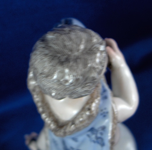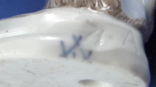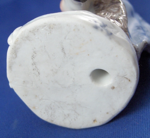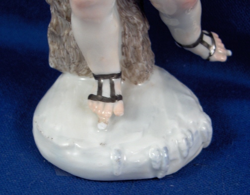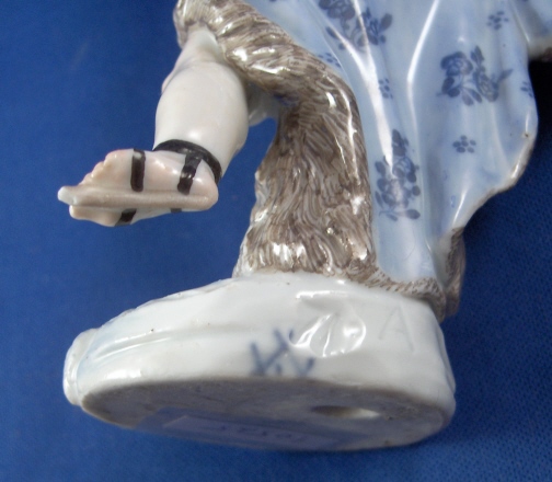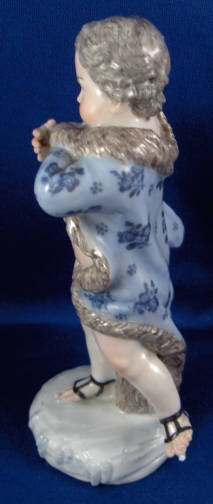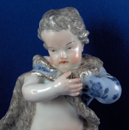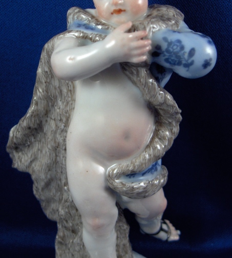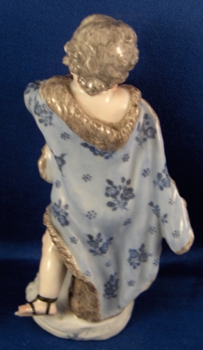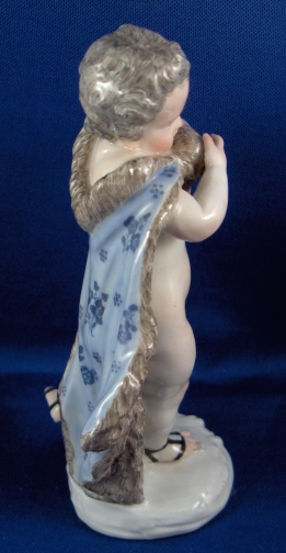 This is a figurine of an ice skater made by Meissen in about 1760. The putto is naked and just draped with a fur lined cloth that is painted with blue flowers on the outside. Unlike the newer versions of this model the base looks like ice with icicles hanging off the front. He is skating barefoot with just the skates strapped to his feet - a bit chilly for my taste! The figurine is in superb condition with the tips of the skates chipped and one spot of either wear on top of his head or a very very shallow small glaze nick. The rest is perfect! The bottom of the base is flat and filled with only the air hole in it. He is marked on the back of the base with the underglaze blue crossed swords with the dots between the bottom as well as the model number A71 and this is a first pull of this figurine meaning he was first modeled during this period and not earlier. The figure is 5.25 inches tall, 2.375 inches wide and 2 inches deep. Please email me for more information or other pictures.
