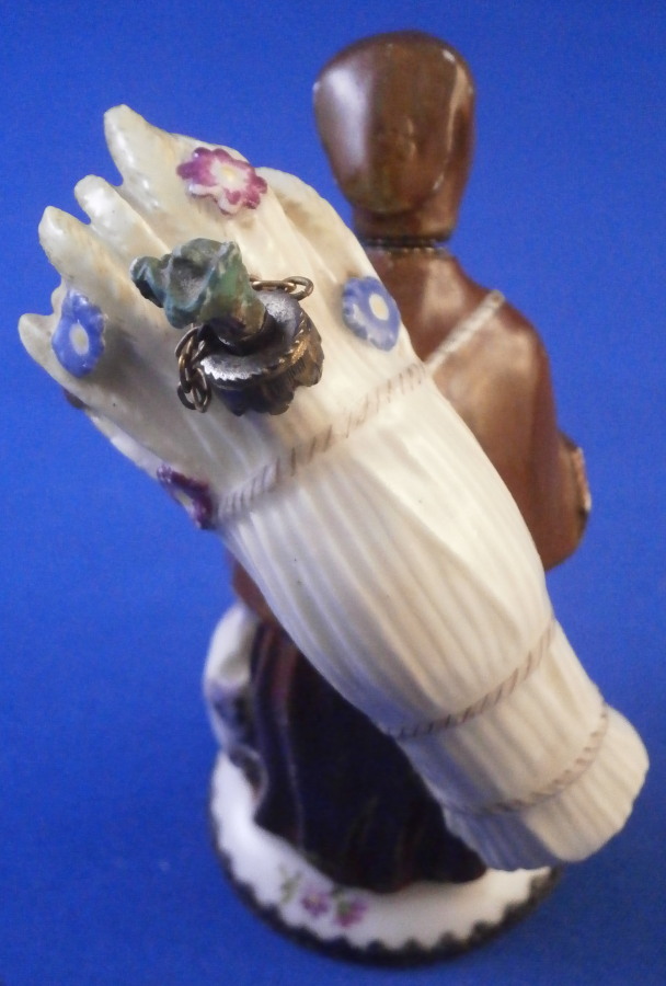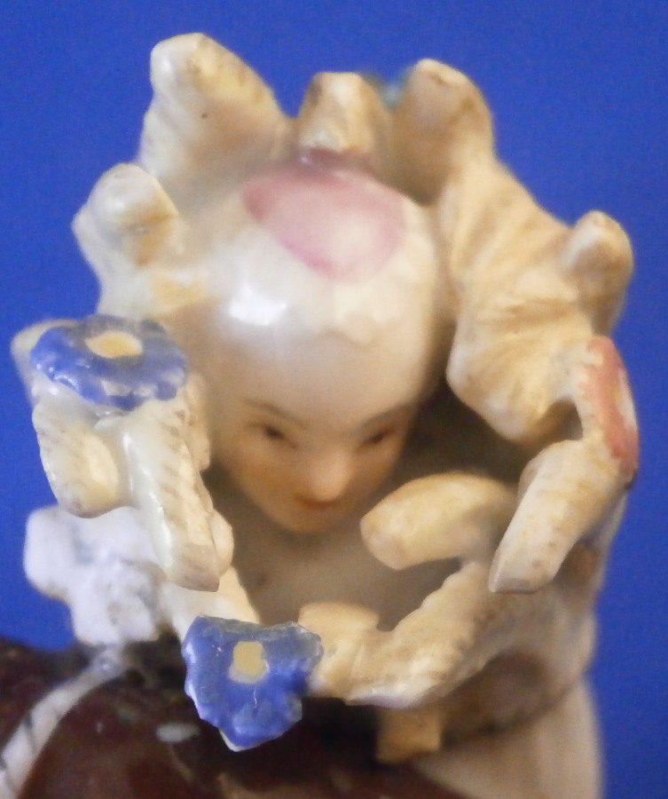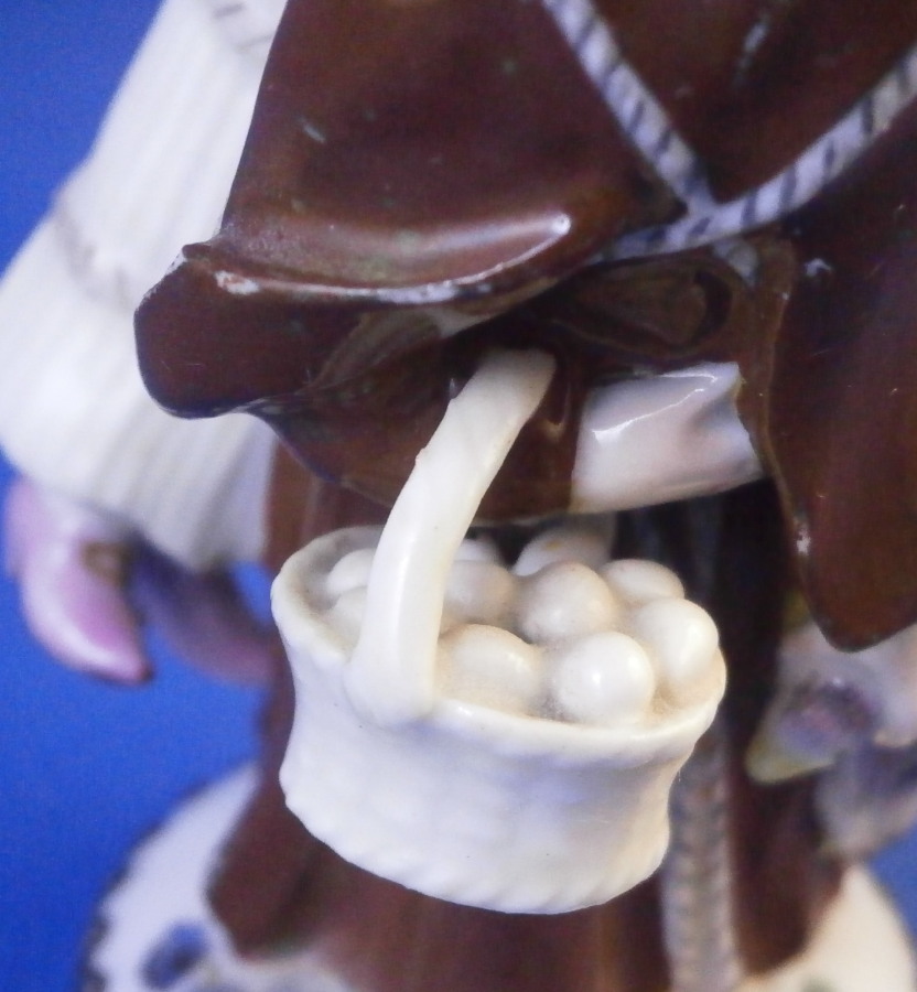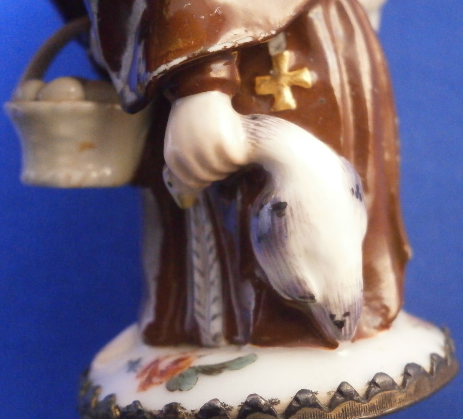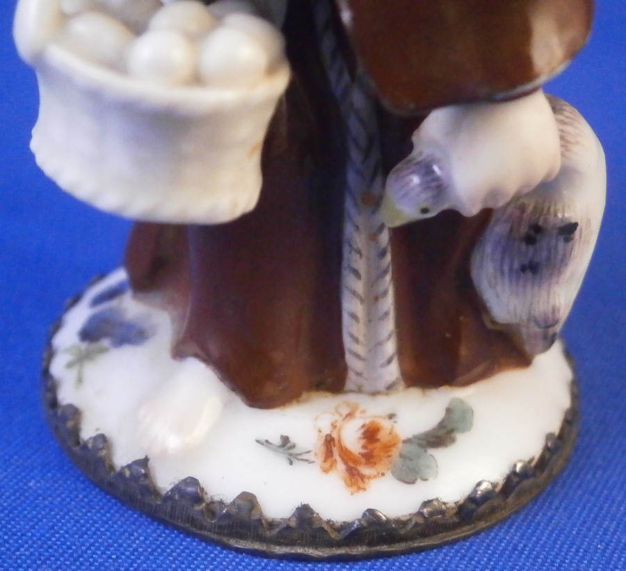 This is a superb figural perfume bottle made by Meissen in in the mid 18th century. It's a piece you come across from time to time but almost all are more modern including the anniversary addition I own from 1910. So here we have the original period piece which is great. Much ncier detail! The piece is known as the "The Bawdy Monk" and is of a monk carrying a young child on his back that is concealed in a wheat sheaf. The monk is carrying a dead duck by its neck in his left hand and a basket of eggs in his other hand. The piece is based on a folk tale. The child's head is barely visible in the wheat. The wheat sheaf is more sideways oriented and has the addition of nice flowers compared to the newer versions. The base has three single flowers painted on the top and a superb floral arrangement to the underside. The edge has a silver trim to it, The one scent bottle is opened by taking off the monk's head while the other has the greenery as the stopper on top of the wheat. The child's feet dangle underneath! Nice silver stoppers keep the perfume safe. The piece is in great condition considering the age. There is some minor damage to the tips of the wheat, a chip to the edge of the monk's robe as well as a bit of wear to the edges, the stopper of the greenery is a bit rough looking with some small chips and overpaint and there is a crack along the side of the base but that is perfectly held in place by the silver trim around the base. I am just being picky as always and the piece displays wonderfully and looks amazing! Unmarked but unmistakably Meissen from this period! The flakon is 2.875 inches tall, 1.75 inches wide and 1.625 inches deep. Please email me for more information or other pictures.