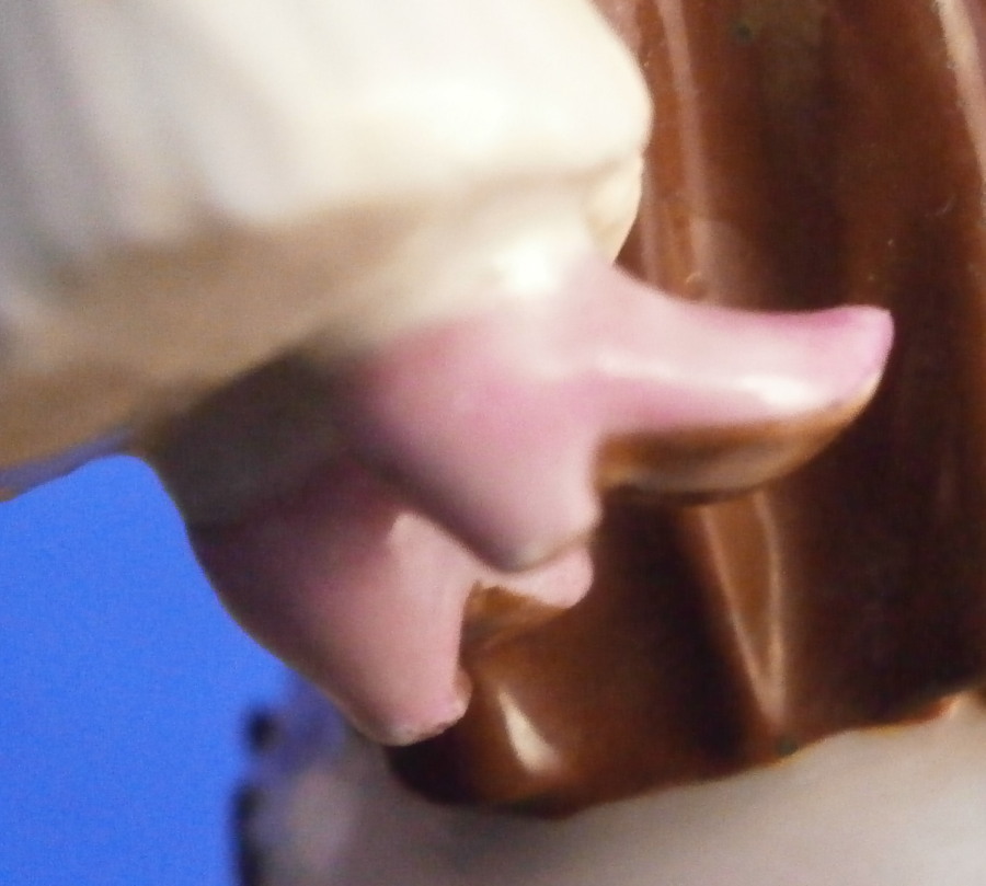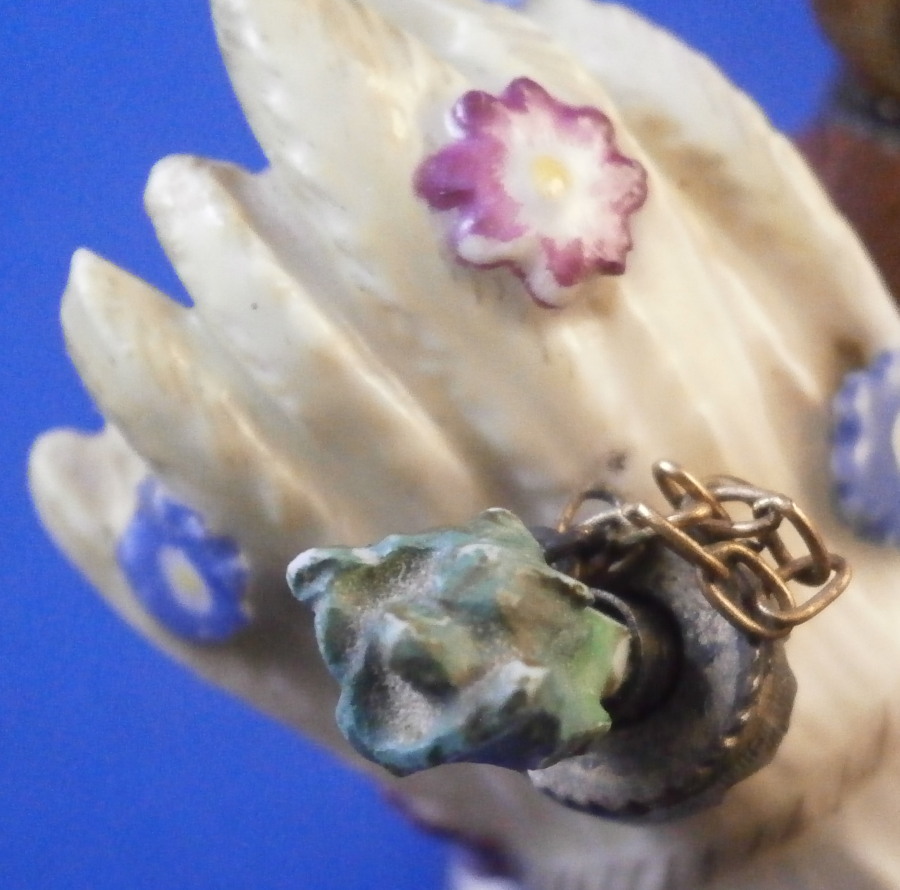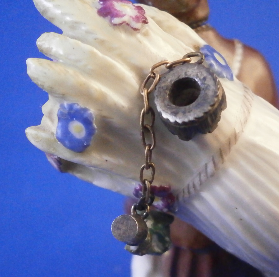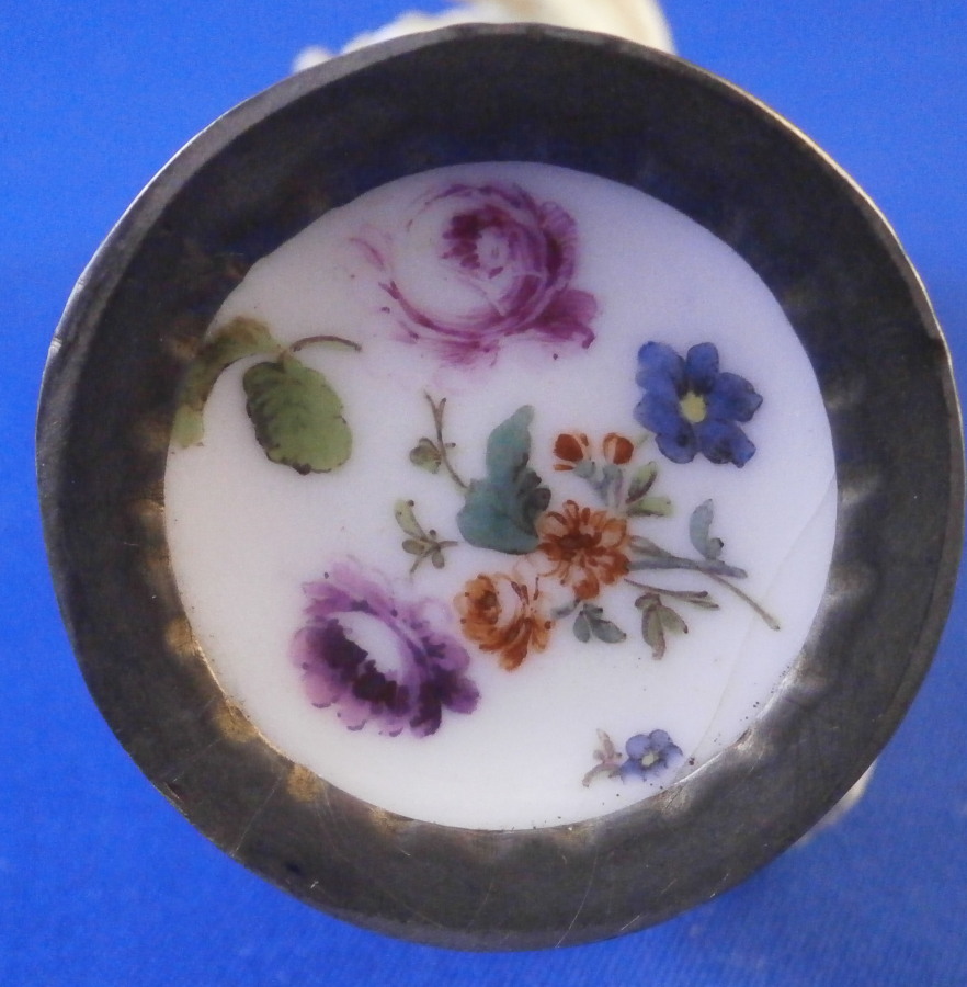 This is a superb figural perfume bottle made by Meissen in in the mid 18th century. It's a piece you come across from time to time but almost all are more modern including the anniversary addition I own from 1910. So here we have the original period piece which is great. Much ncier detail! The piece is known as the "The Bawdy Monk" and is of a monk carrying a young child on his back that is concealed in a wheat sheaf. The monk is carrying a dead duck by its neck in his left hand and a basket of eggs in his other hand. The piece is based on a folk tale. The child's head is barely visible in the wheat. The wheat sheaf is more sideways oriented and has the addition of nice flowers compared to the newer versions. The base has three single flowers painted on the top and a superb floral arrangement to the underside. The edge has a silver trim to it, The one scent bottle is opened by taking off the monk's head while the other has the greenery as the stopper on top of the wheat. The child's feet dangle underneath! Nice silver stoppers keep the perfume safe. The piece is in great condition considering the age. There is some minor damage to the tips of the wheat, a chip to the edge of the monk's robe as well as a bit of wear to the edges, the stopper of the greenery is a bit rough looking with some small chips and overpaint and there is a crack along the side of the base but that is perfectly held in place by the silver trim around the base. I am just being picky as always and the piece displays wonderfully and looks amazing! Unmarked but unmistakably Meissen from this period! The flakon is 2.875 inches tall, 1.75 inches wide and 1.625 inches deep. Please email me for more information or other pictures.