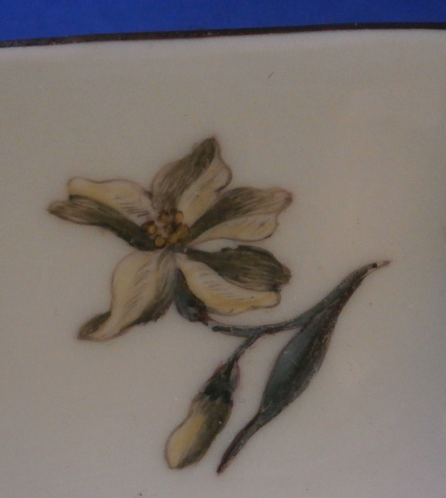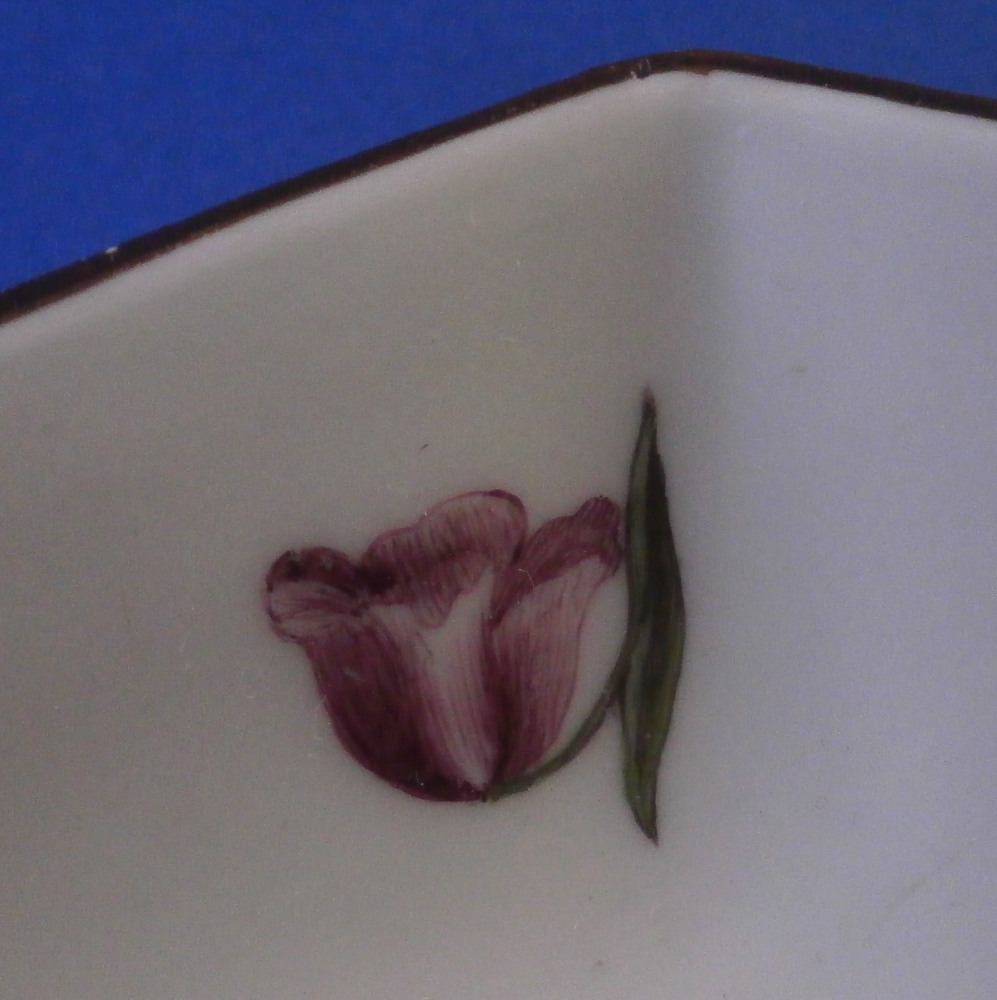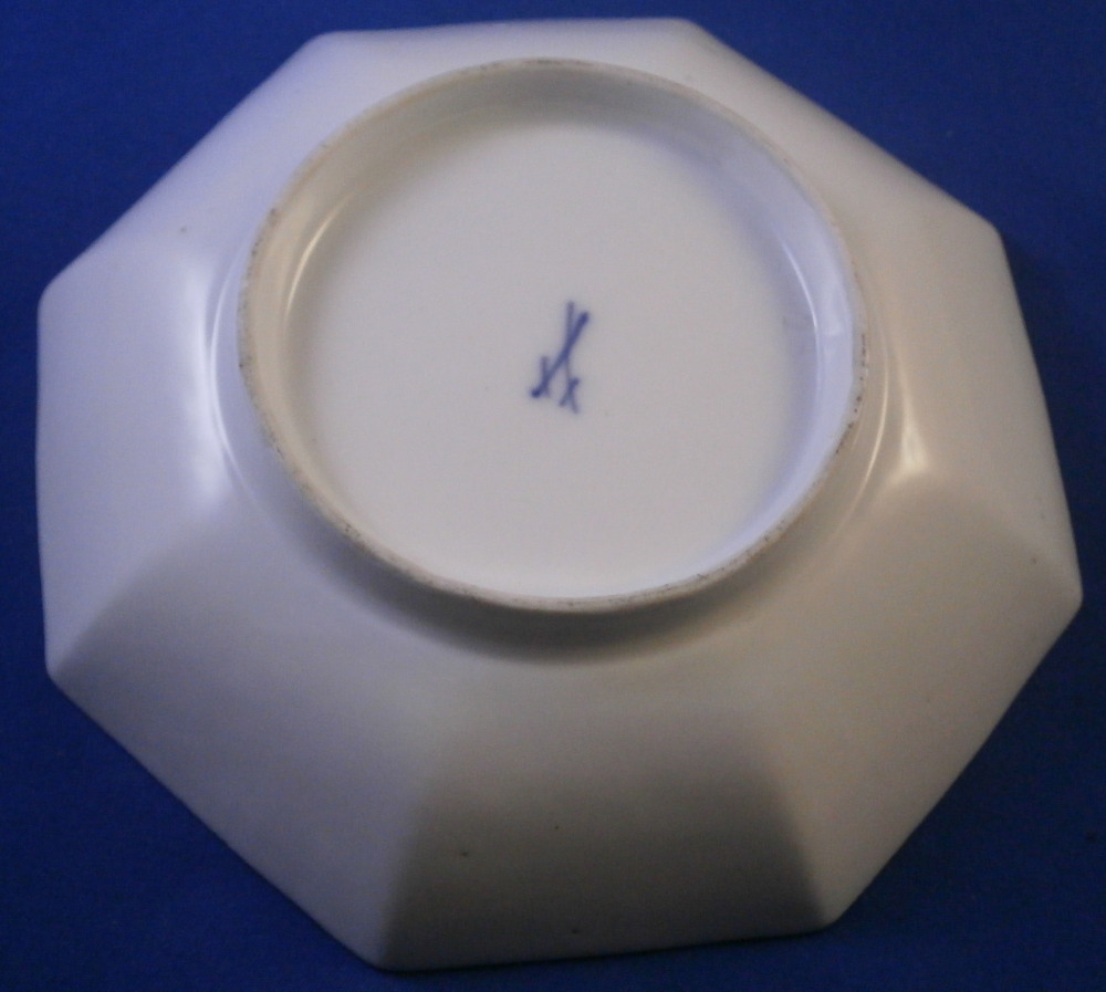 This is an early and superb saucer made by Meissen in about 1740. A very rare shape to find! The dish has an octagonal shape to it and it is hand painted with a superb larger flower in the center as well as four more flowers and leaf - right above the central flower likely to cover up some sort of flaw to the paste. The flowers are in the woodcut style of around 1740. . The flowers are of a very nice quality. Brown trim to the edge. A very elegant looking example! The saucer is in great condition with a minor touch of wear as shown - it displays perfectly! The dish is 1.25 inches tall and 5.375 inches in diameter. The piece is marked with the under glaze blue crossed swords mark underneath as well as an impressed number which surprised me a bit as I thought it might be a touch earlier but this dates it to right around 1740. Please email me for more information or other pictures.