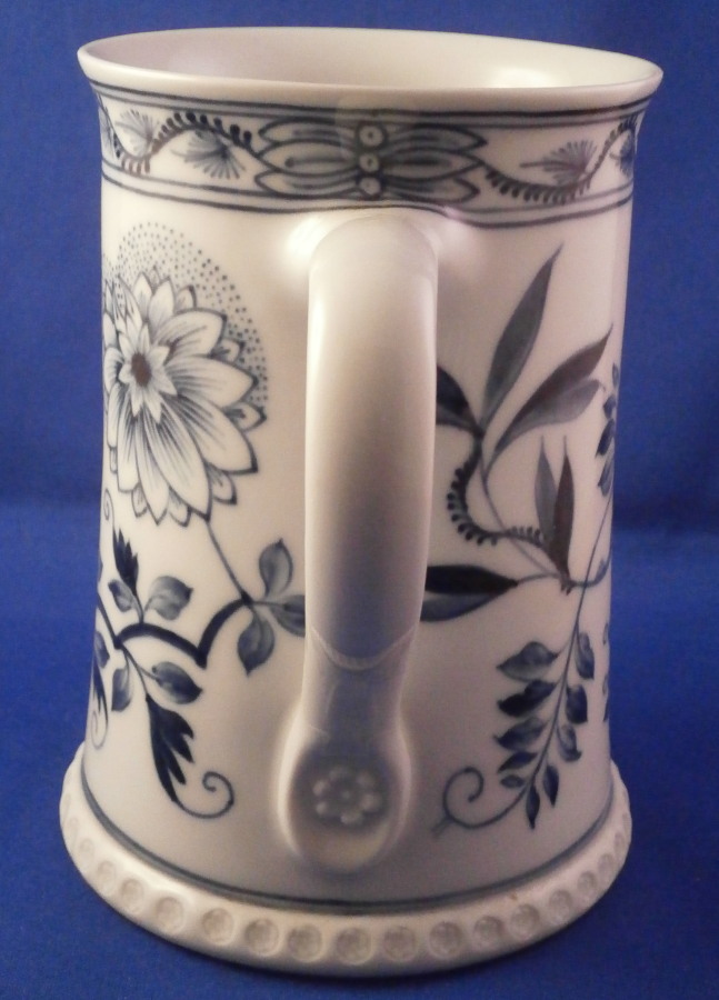 This is a really nice tankard made by Meissen in about 1985. Only reason I know that is because it still has its original paperwork with it which is not common at all. It is decorated with a design based on their famous blue onion / Zwiebelmuster design in under glaze blue but the blue and design are more similar to the early 18th century pieces - nice and dark. You can feel the blue sunk into the paste and it has a nice design to the top rim and a fun design to the paste along the bottom edge and bottom terminal of the handle. Nice tapered shape to the tankard. Really a stunning looking piece! Nice sized version as well! The piece is in perfect condition. it is marked underneath with the under glaze blue crossed swords mark (first choice) as well as the usual impressed marks, etc. one finds on Meissen of this period as shown. The tankard is 5.375 inches tall and just over 3.625 inches in diameter at the top and 4.125 inches at the bottom. Please email me for more information or other pictures.