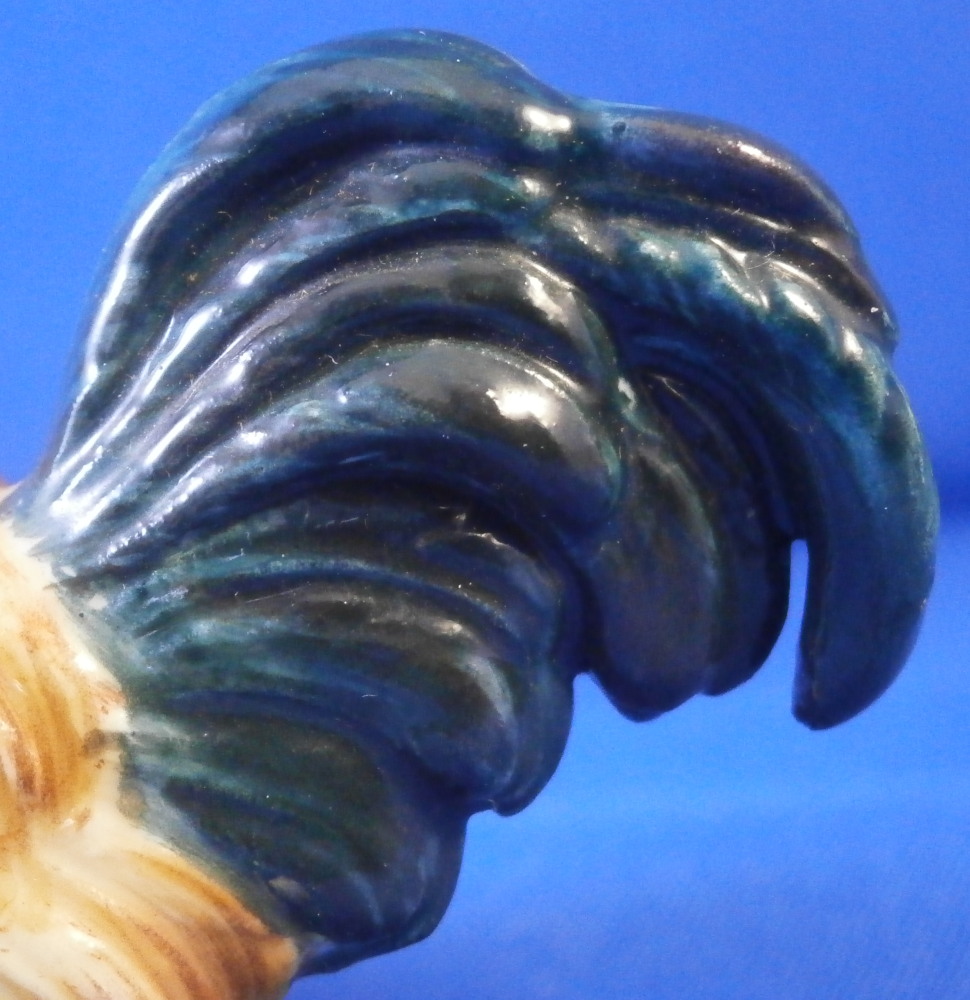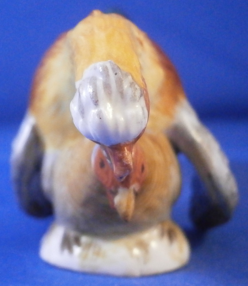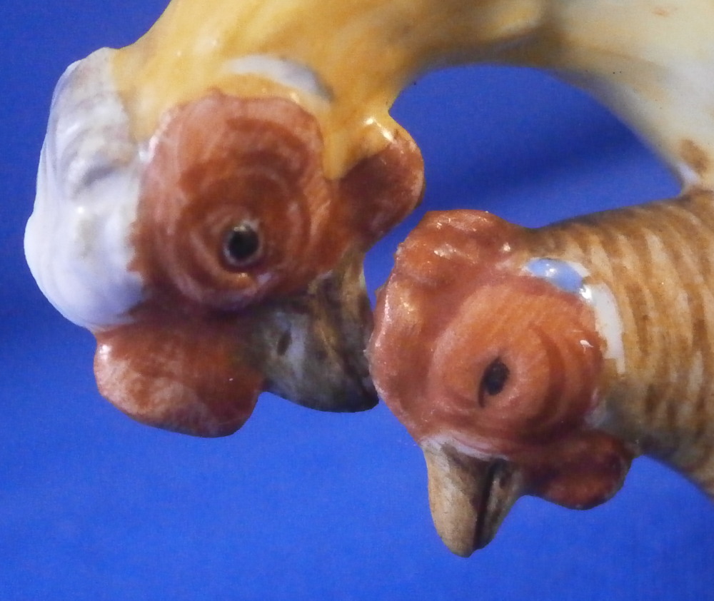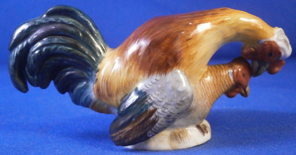 This is a fun miniature chicken figurine made by Meissen in the mid to late 19th century. It's one of the more collected one - I wonder why. The figure is of a rooster and a hen having some special fun. The figurine is superbly modeled and hand painted and in great condition. No chips, restorations, etc. The piece is marked underneath with the blue crossed swords mark as well as the usual incised marks and impressed numbers for this period as shown. The figurine is 1.5 inches tall, 1.375 inches wide and 3 inches long. Please email me for more information or other pictures.
