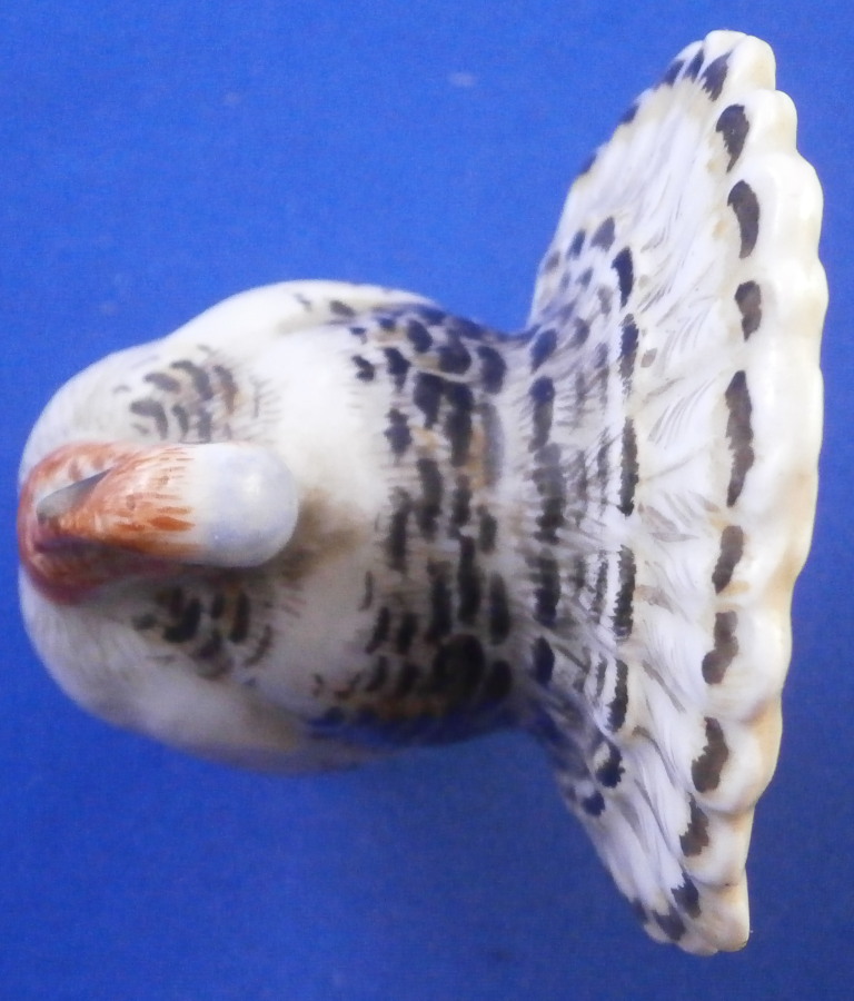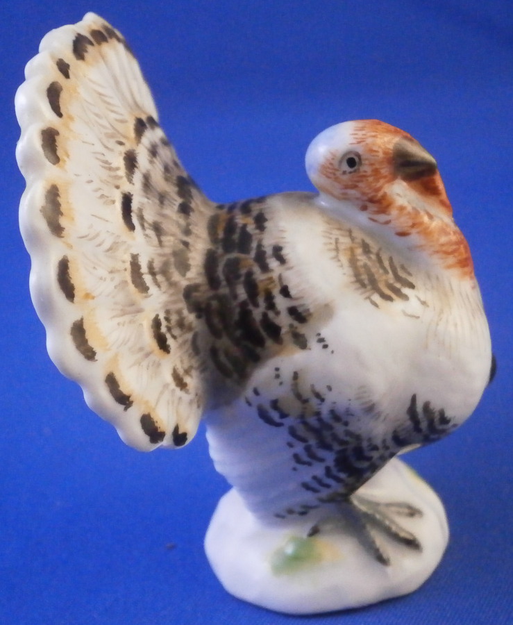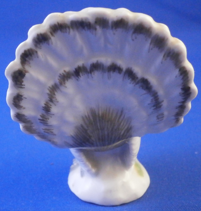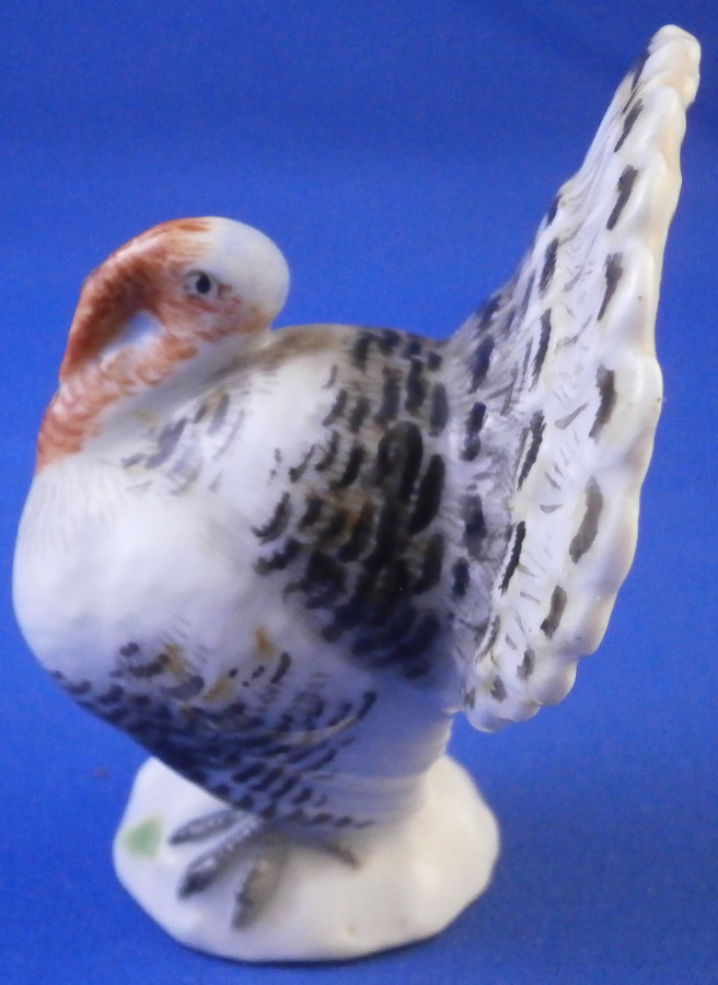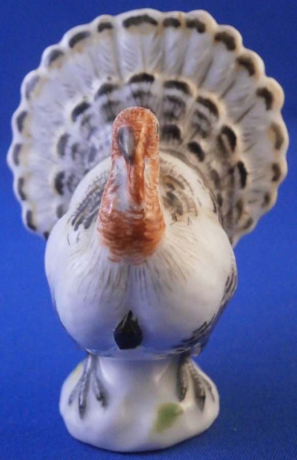 This is a miniature male turkey (aka Tom ) made by Meissen in the 19th century. Nicely modeled and hand painted as one would expect from the top maker! This older version is quite hard to find and it matches the lady turkey I have from this period perfectly! He is standing on a little base painted with some green to simulate grass. The figurine is in perfect condition which is always nice. It is marked underneath with the blue crossed swords mark as well as the usual impressed / incised marks as well as a painters mark in form of a red 43 as shown. The bird is 2.5 inches tall, 2 inches wide and 1.75 inches long. Please email me for more information or other pictures.